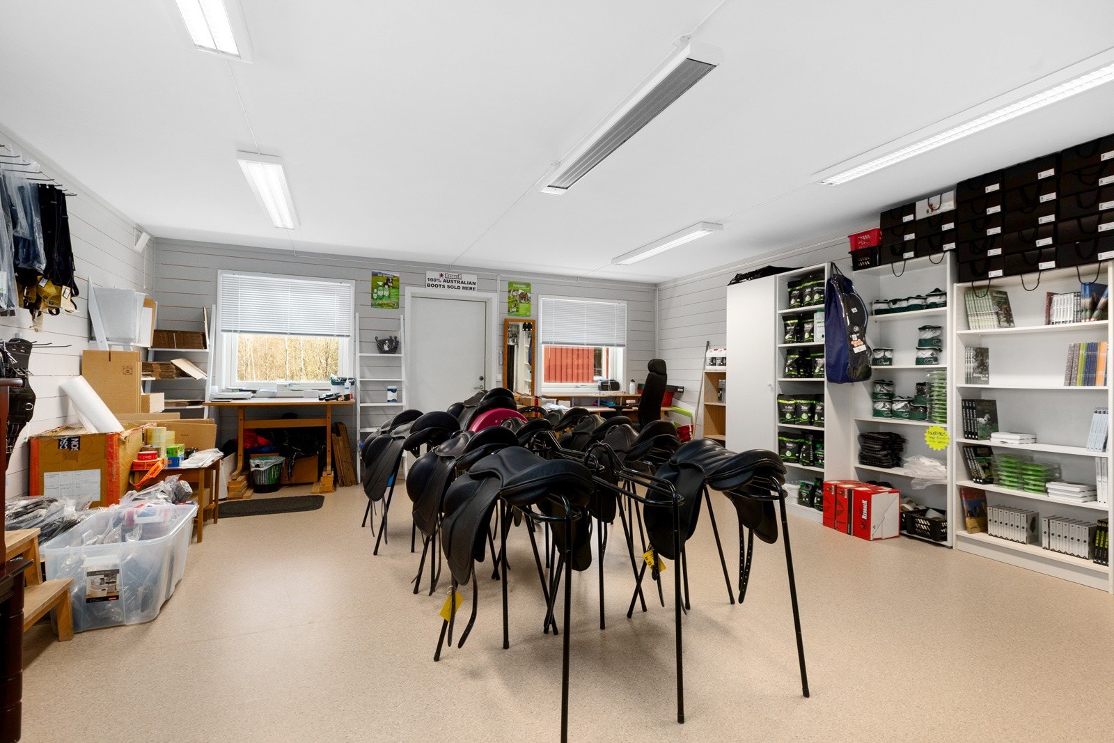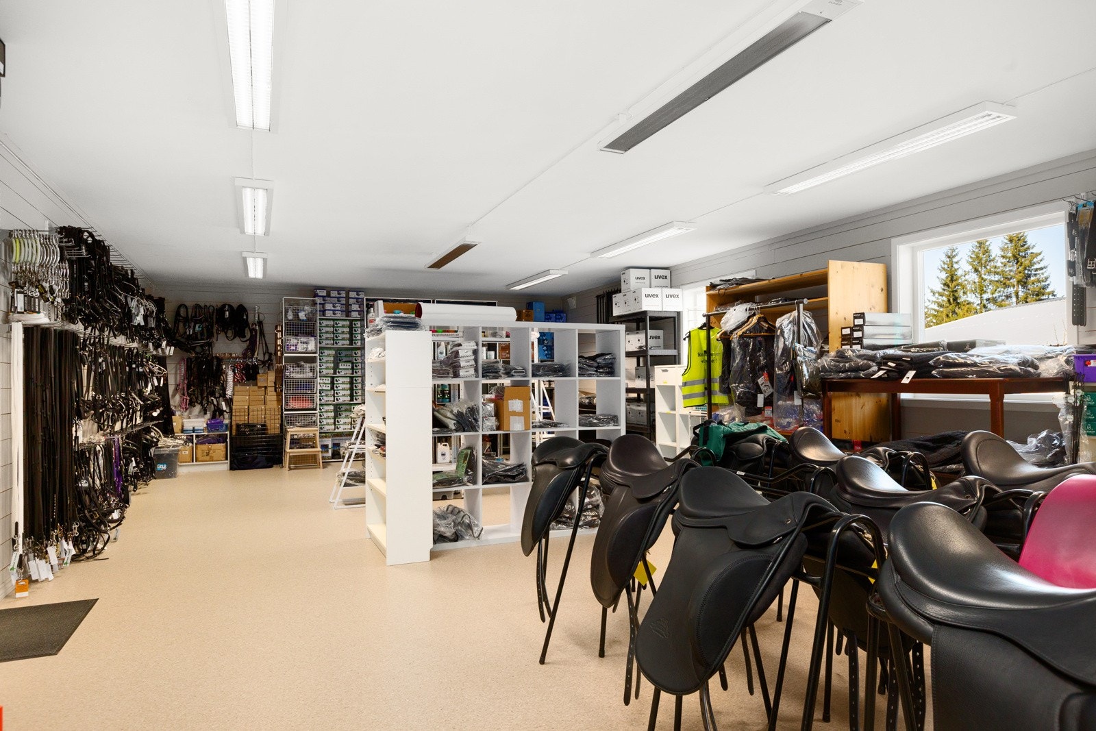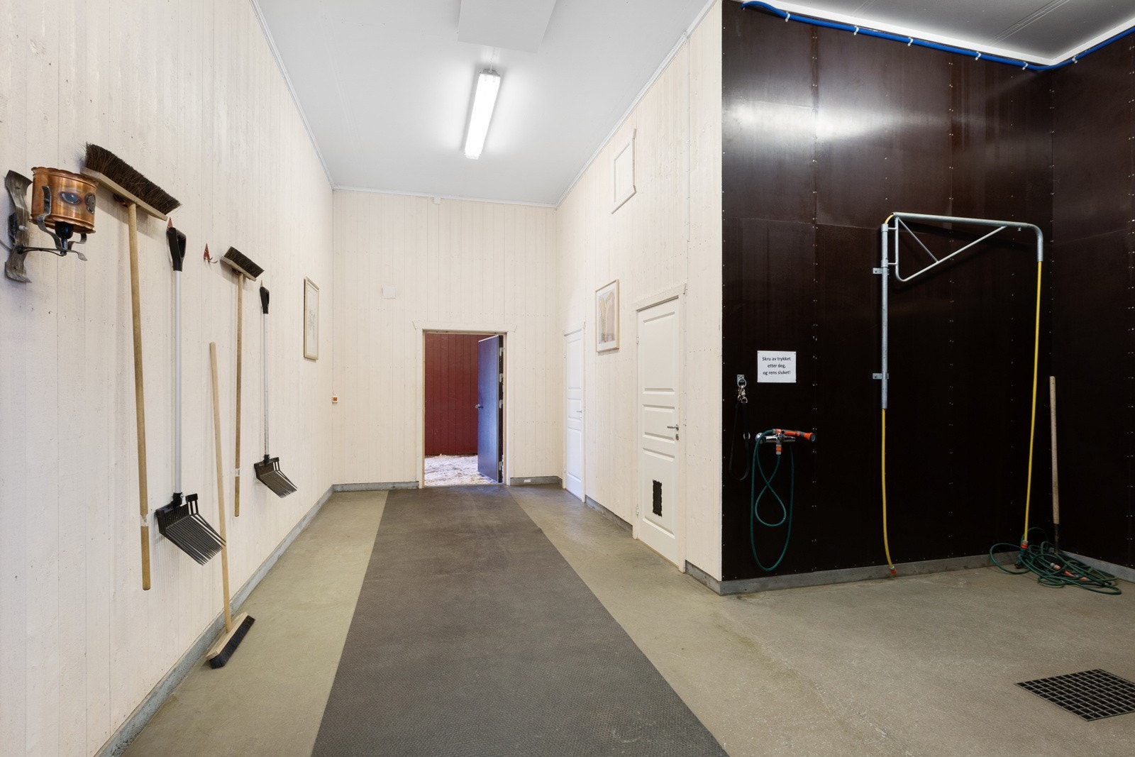 Det isolerte stallrommet er på 112 kvm og inneholder 4 store stallbokser, et romslig gangareal og egen plass med hestedusj. Fra gangarealet er det direkte utgang i hver ende. Mot nord er det en bred dobbeltdør mens det mot syd en dør rett ut til overbygget leskur på 39 kvm. Fra stallgangen er det dør inn til et romslig, isolert og oppvarmet utstyrsrom, tørkerom og hunderom med direkte utgang til takoverbygget hundegård. Det isolerte butikk/lageret på 65 kvm har egen utvendig adkomst samt innvendig adkomst fra redskapsgarasjen.