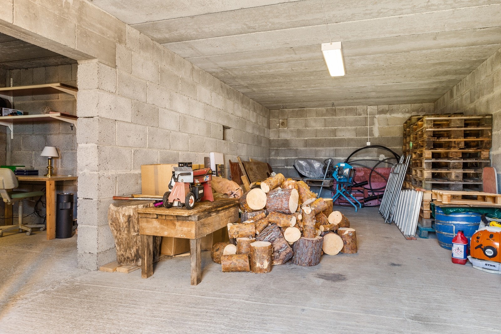Støpt dekke og leca vegger. Inneholder 2 romslige lagerrom med adkomst via plassbygget slagdør med bredde/høyde på 1,8 x 1.95 meter.