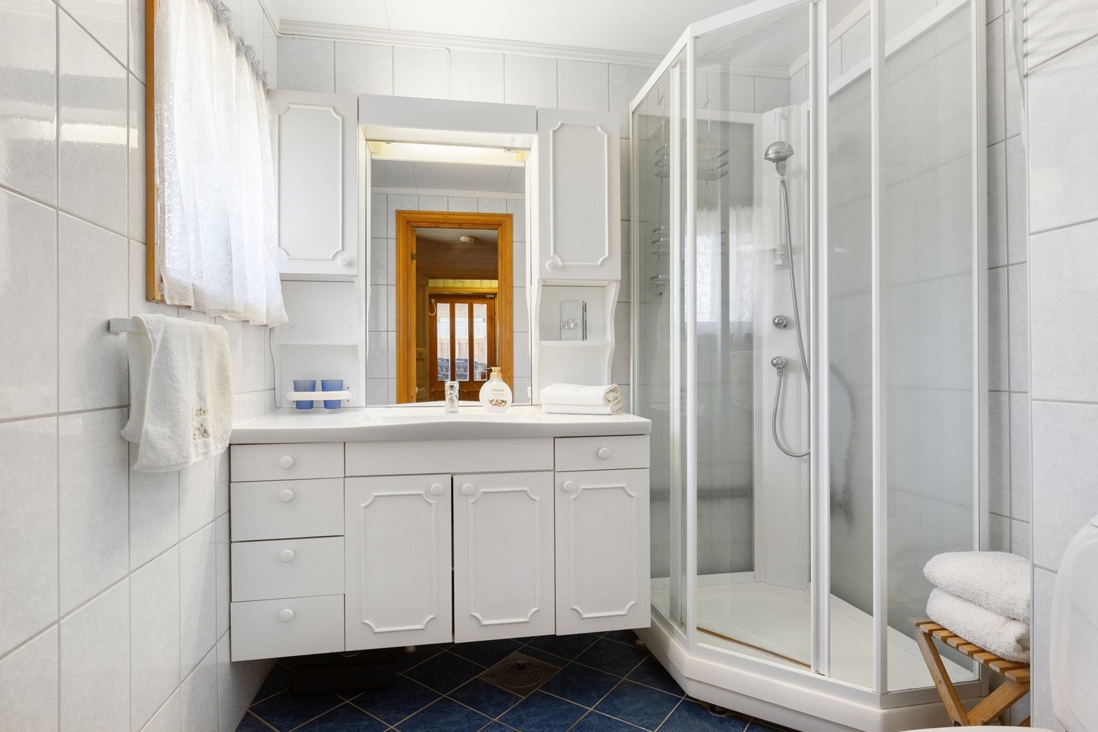 Badet ble rehabilitert i 2000 med fliser med el-varmekabler på gulv, fliser på vegger og malte plater i himling. Det er naturlig avtrekk via ventil i himling. Rommet er innredet med dusjkabinett og gulvmontert toalett. Baderomsinnredning på 1,2 meter med underskap med heldekkende plate med servant. Overskap har speil og lys.