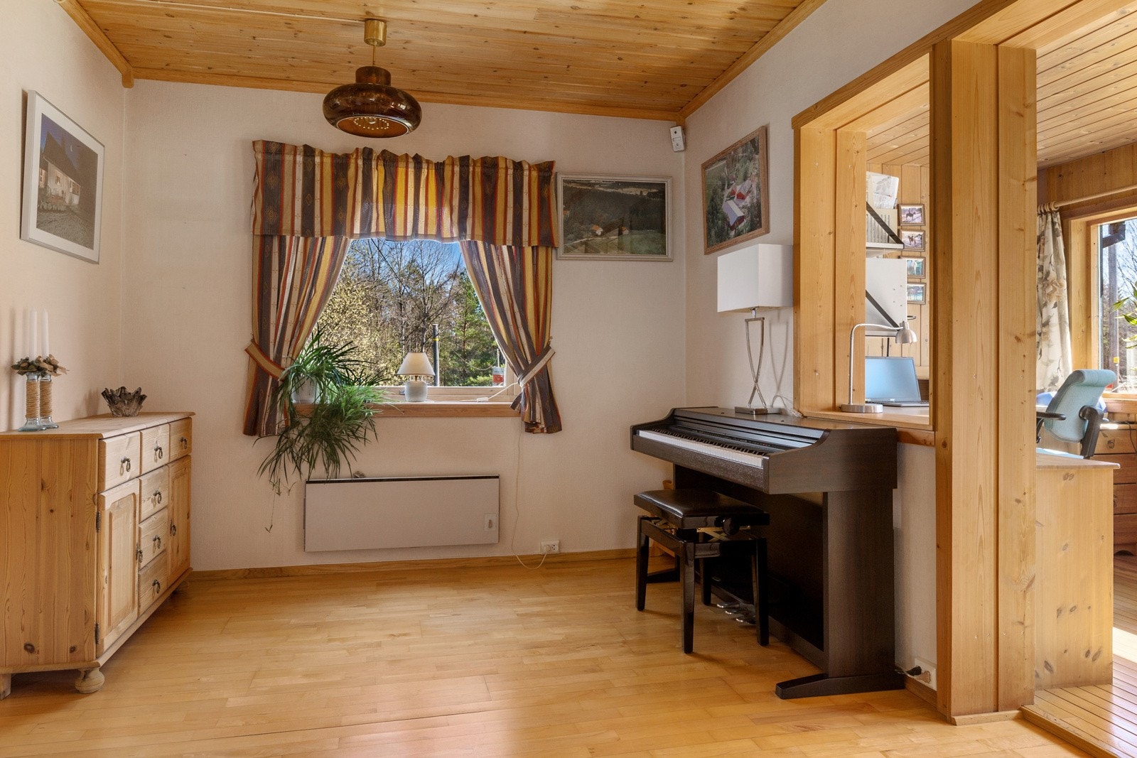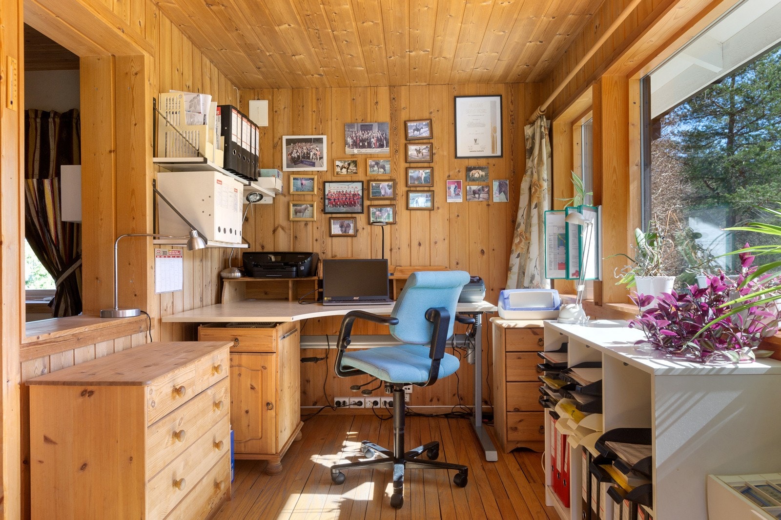 Utvendig adkomst via separat dør og trapp opp til stort, innredet kontorrom.
