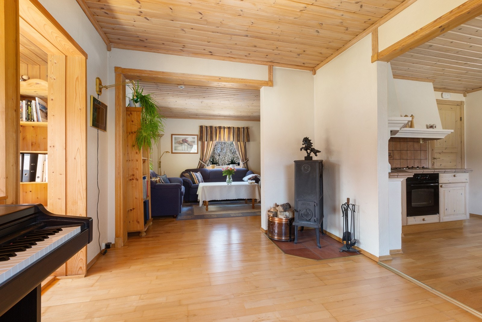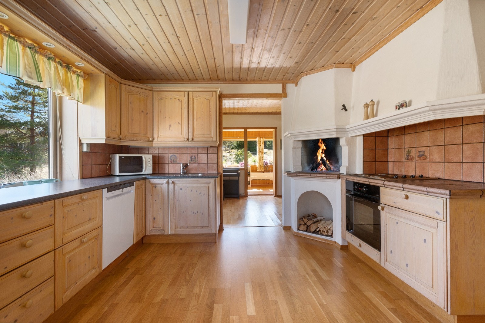 Innredningen ble montert i 2000 i heltre furu med profilerte fronter. Laminat benkeplate med nedsenket beslag med oppvaskkum. Benkeplate med fliser med koketopp og fliser mellom under og overskap. Innbygget stekeovn og koketopp med ventilatorhette over. Plass og opplegg for oppvaskmaskin. Kjøkkenet har god skap- og benkeplass. Egen peis på kjøkken.