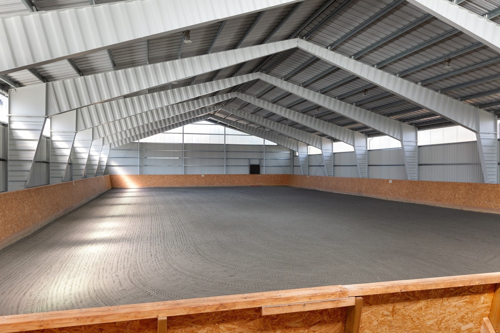 Oppført i 2013 på oppfylte sprengsteinsmasser med støpt ringmur/såle. Bærende konstruksjoner med stålbuer og utvendig kledd med stålplater på vegger og tak. Takplater med droppstopp (hindrer drypping ved kondensering) Det er lysinslipp plater i topp på langvegger og i topp på gavlvegger. Gulv med sand. Ridebanen er på 20 x 40 meter og har OSB plater på vegger/vant. I gavl mot syd/øst er det noe tregulv og en liten tribune. Det er skyvedør på gavl mot tun med bredde 3,49 og høyde 3,39 meter. Det er også en separat gangdør i hver gavl med bredde 1,17 og høyde 2,4 meter. Det godt med LED-lys i tak og stikk på vegger. Bygget er oppført i vedlikeholdsvennlige materialer og er generelt god stand.