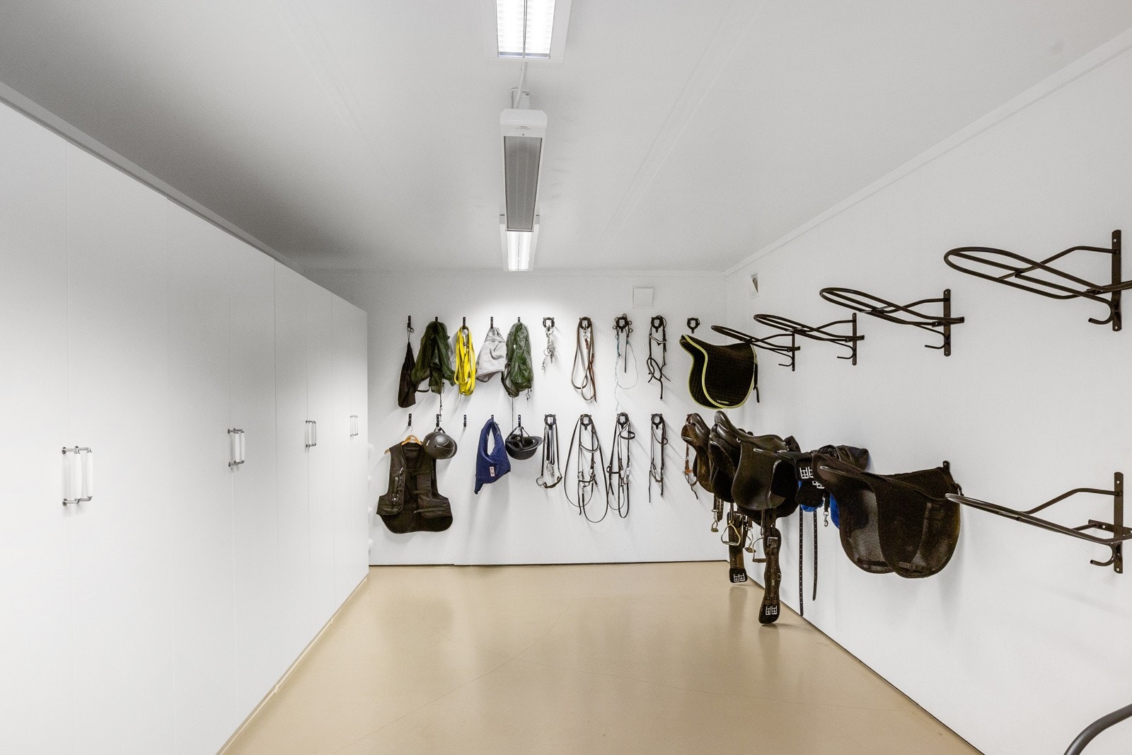 Takmonterte elektriske varmeovner i stall, utstyrsrom, tørkerom og hunderom. Det er også takmonterte elektriske panelovner i butikk/lager.