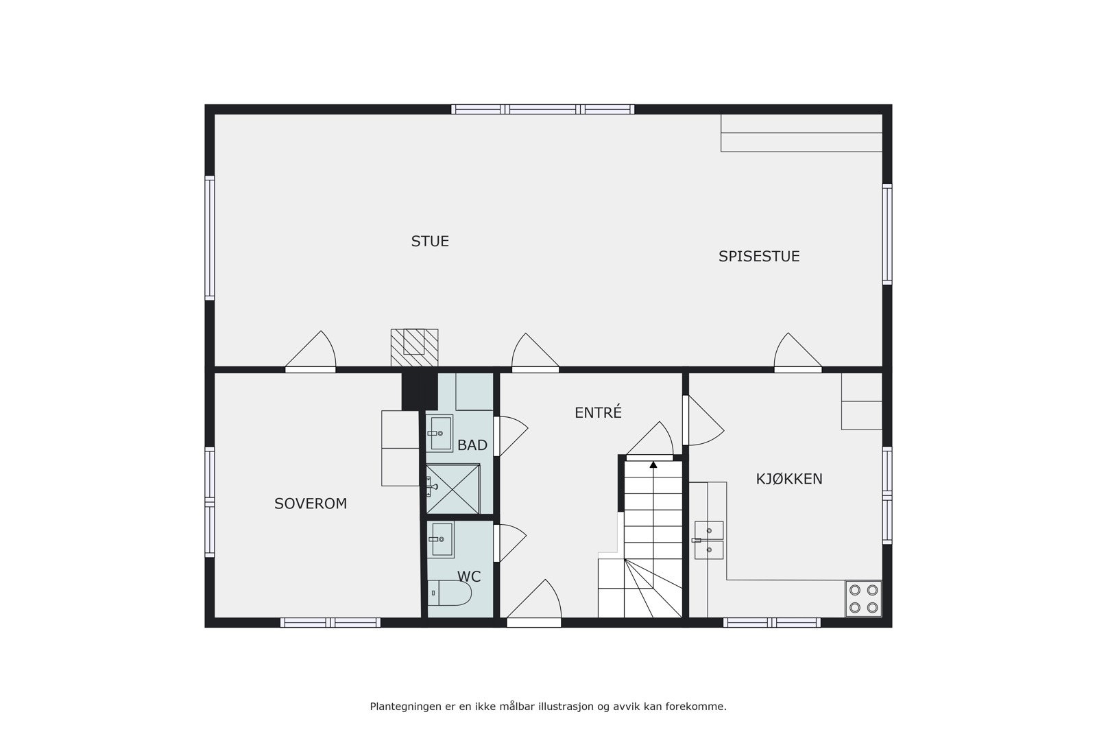 1.Etasje: Vindfang, trapperom, wc, bad, stue, soverom og kjøkken.