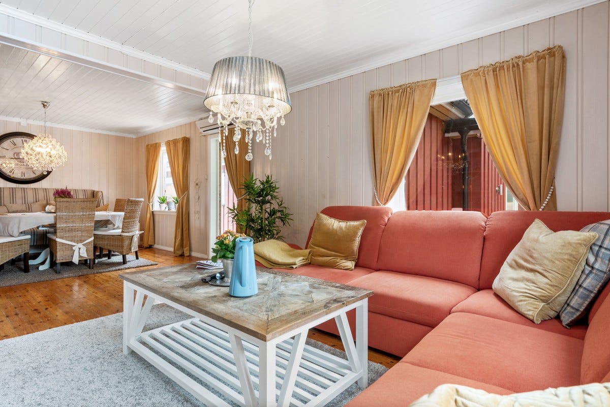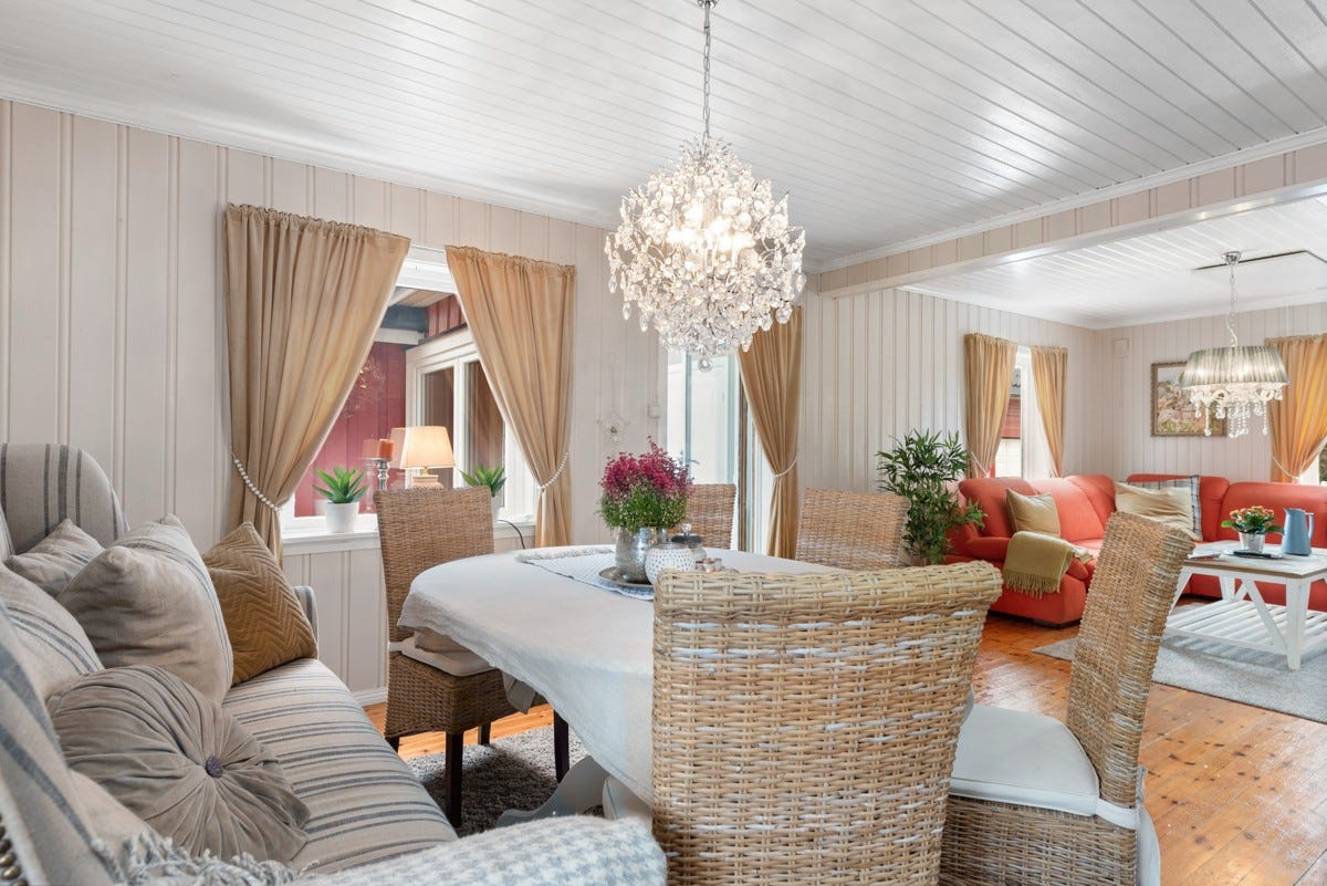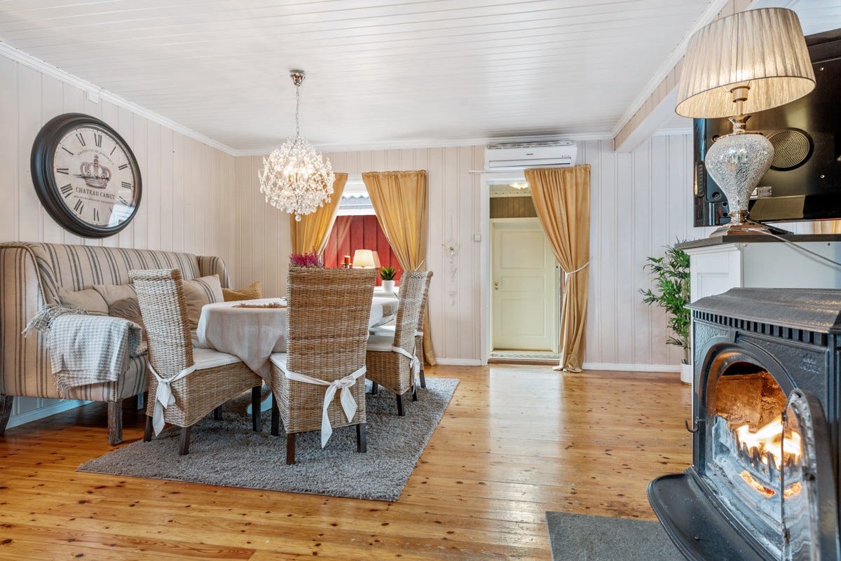 innehar normalt god standard med en grunnflate i 1. etasje på ca. 140 kvm som rommer et stort