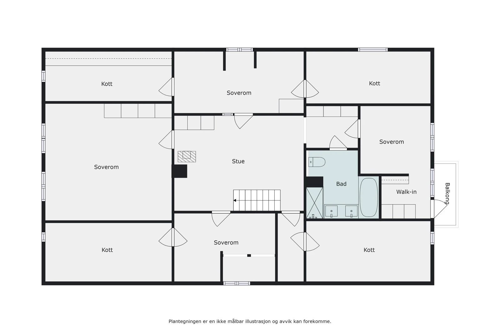 Boligens 1. etasje består av entrè, trapperom, toalettrom, vaskerom, hall m/trapp, kjøkken, spisestue og 3 stuer. Andre etasje består av gang, bad, 4 soverom, stue med trapp og 4 kott. Kjelleren består av fyrrom og uinnredet kjellerrom.
