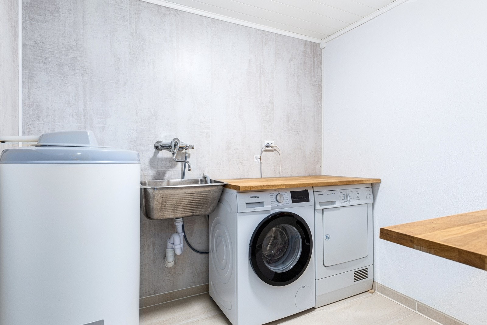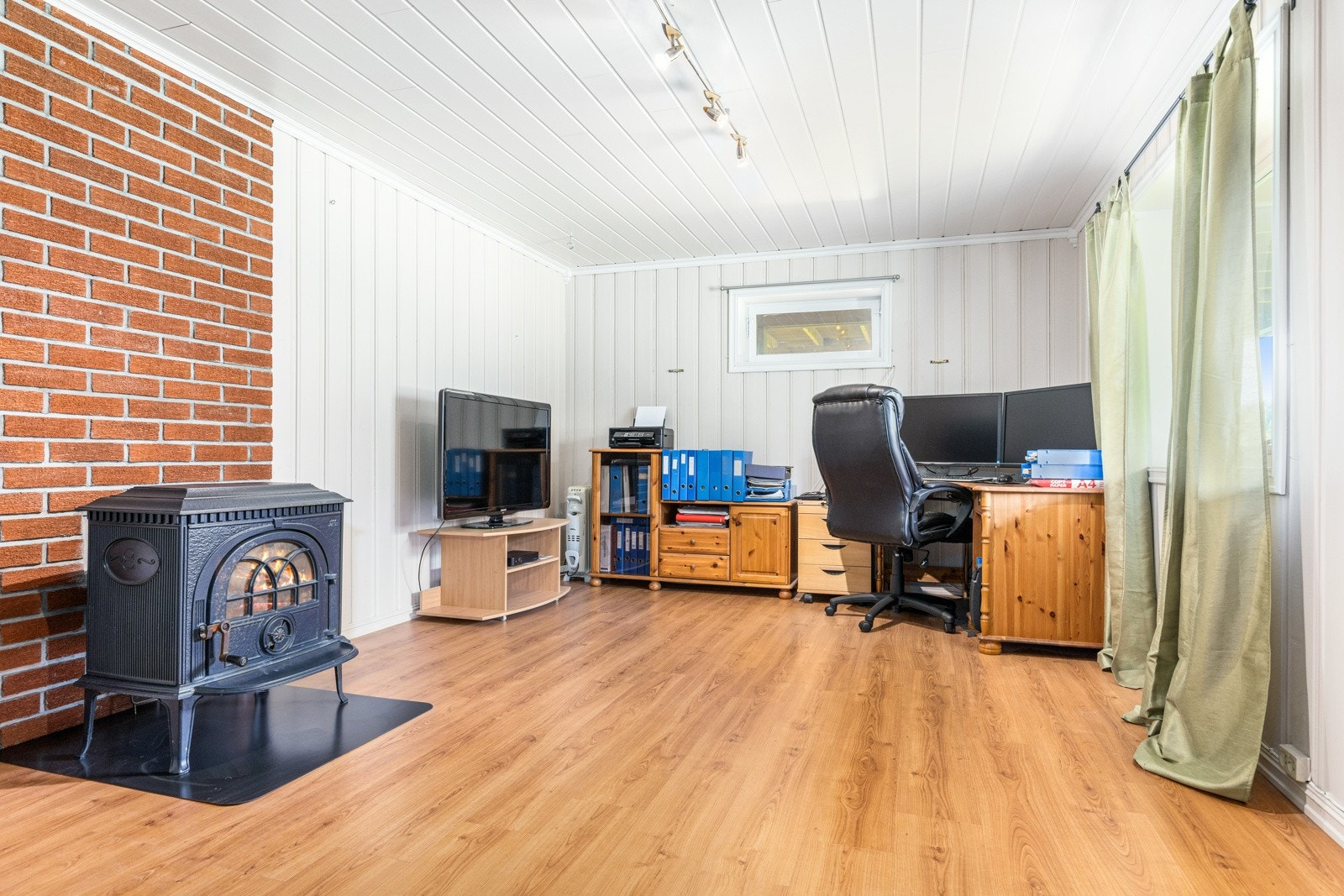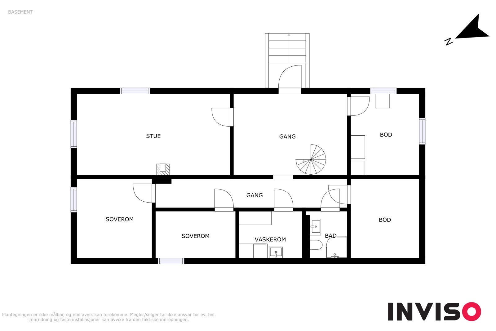 Trapperom med egen utgang til hagen - romslig kjellerstue med peisovn - lagringsrom - gang -