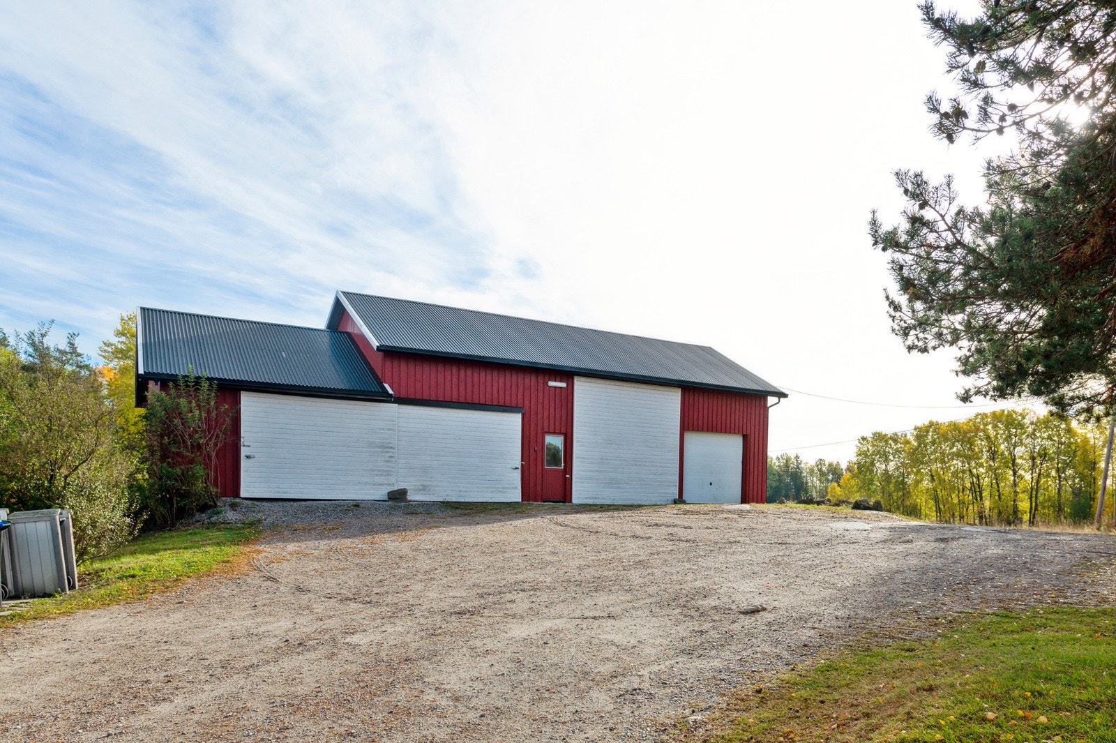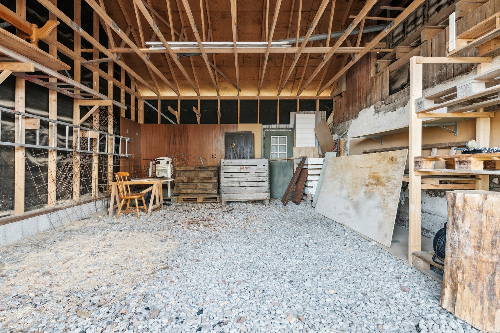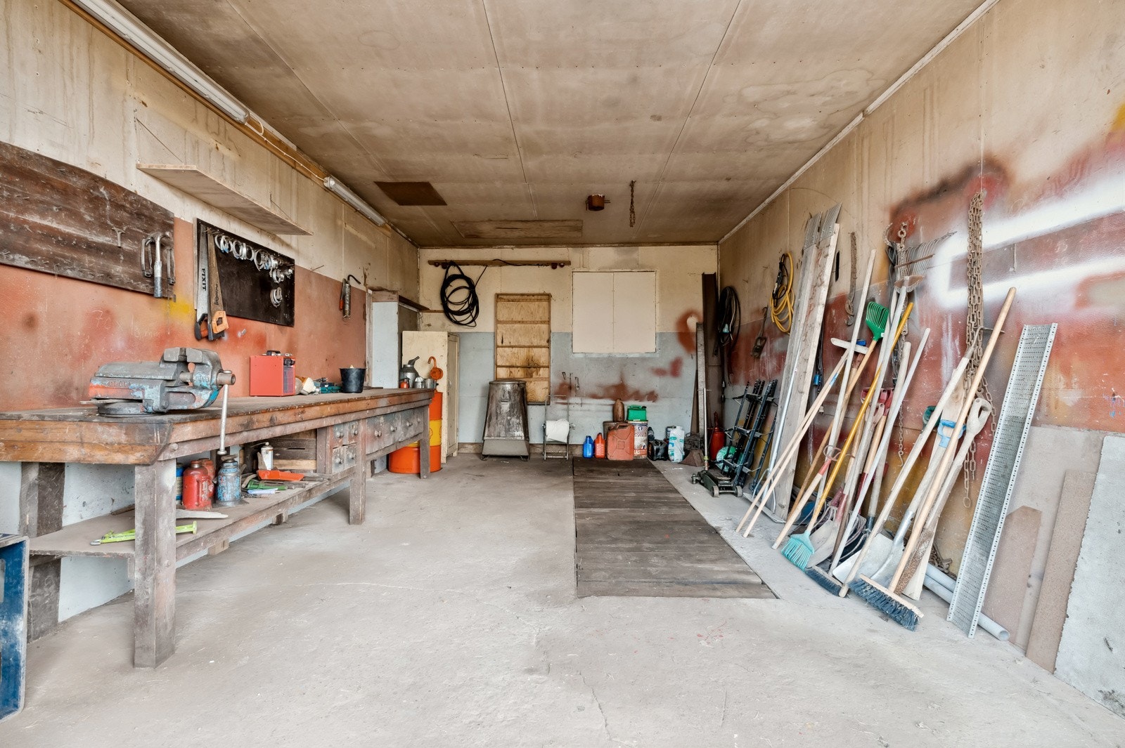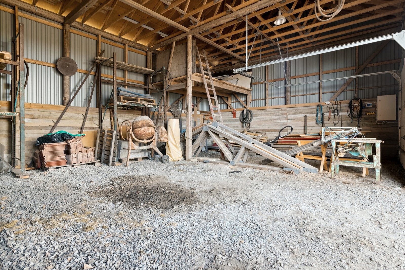 Garasjedel med stor skyvedørsport - hobbyverksted med en enkel smøregrav - traktorgarasje med