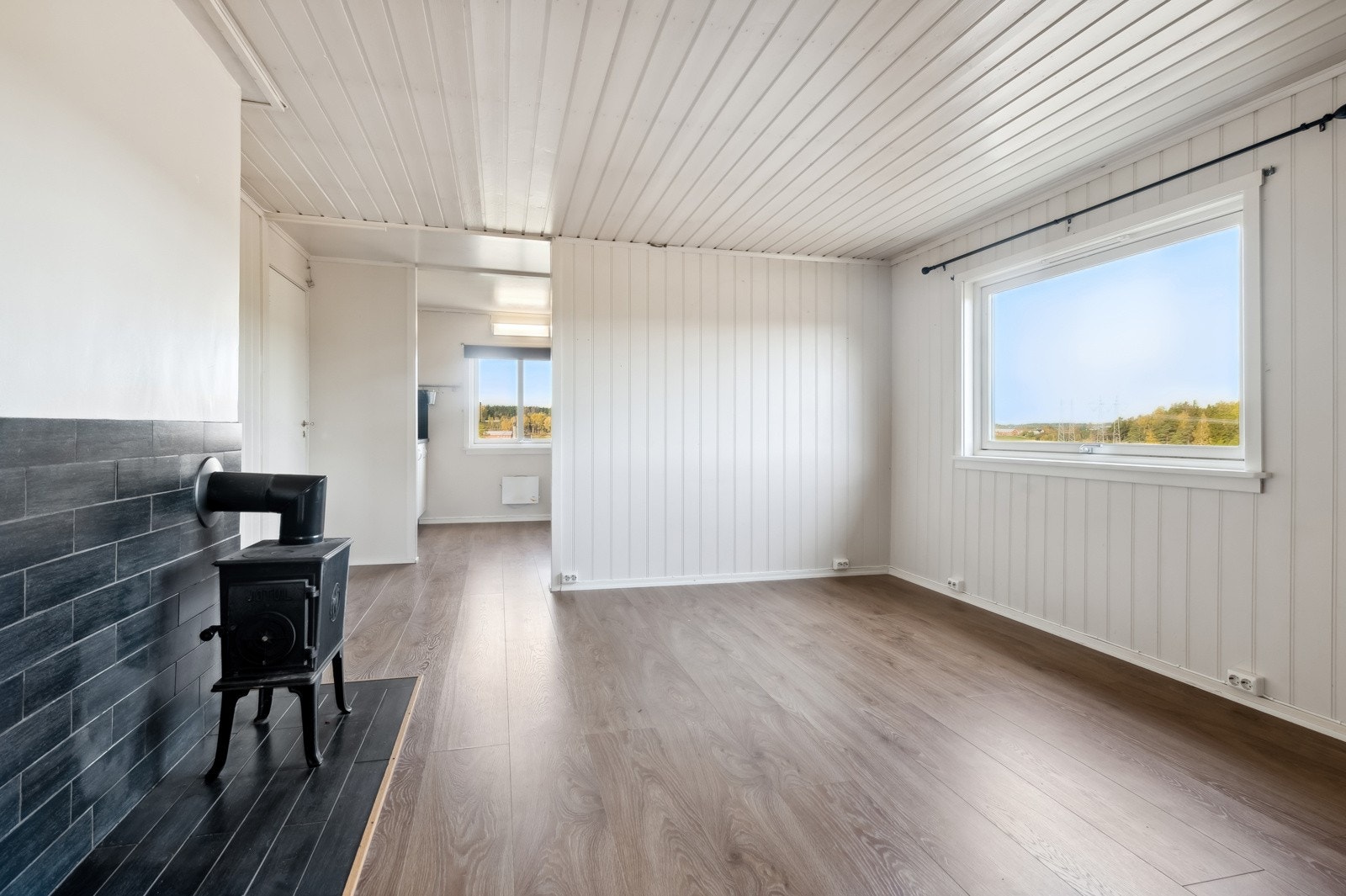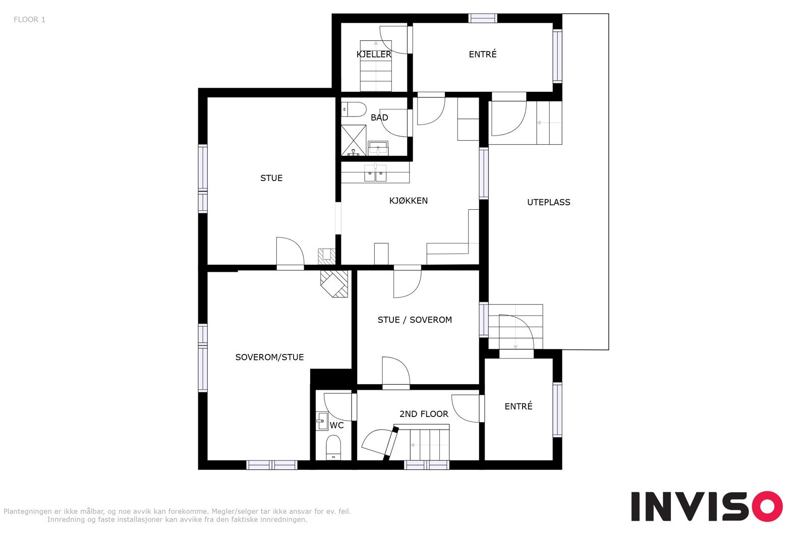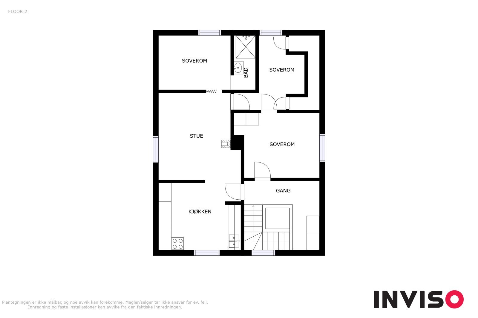 Trappegang - soverom - kjøkken med spiseplass - Tv-stue med vedovn - 2 soverom - dusjbad.
