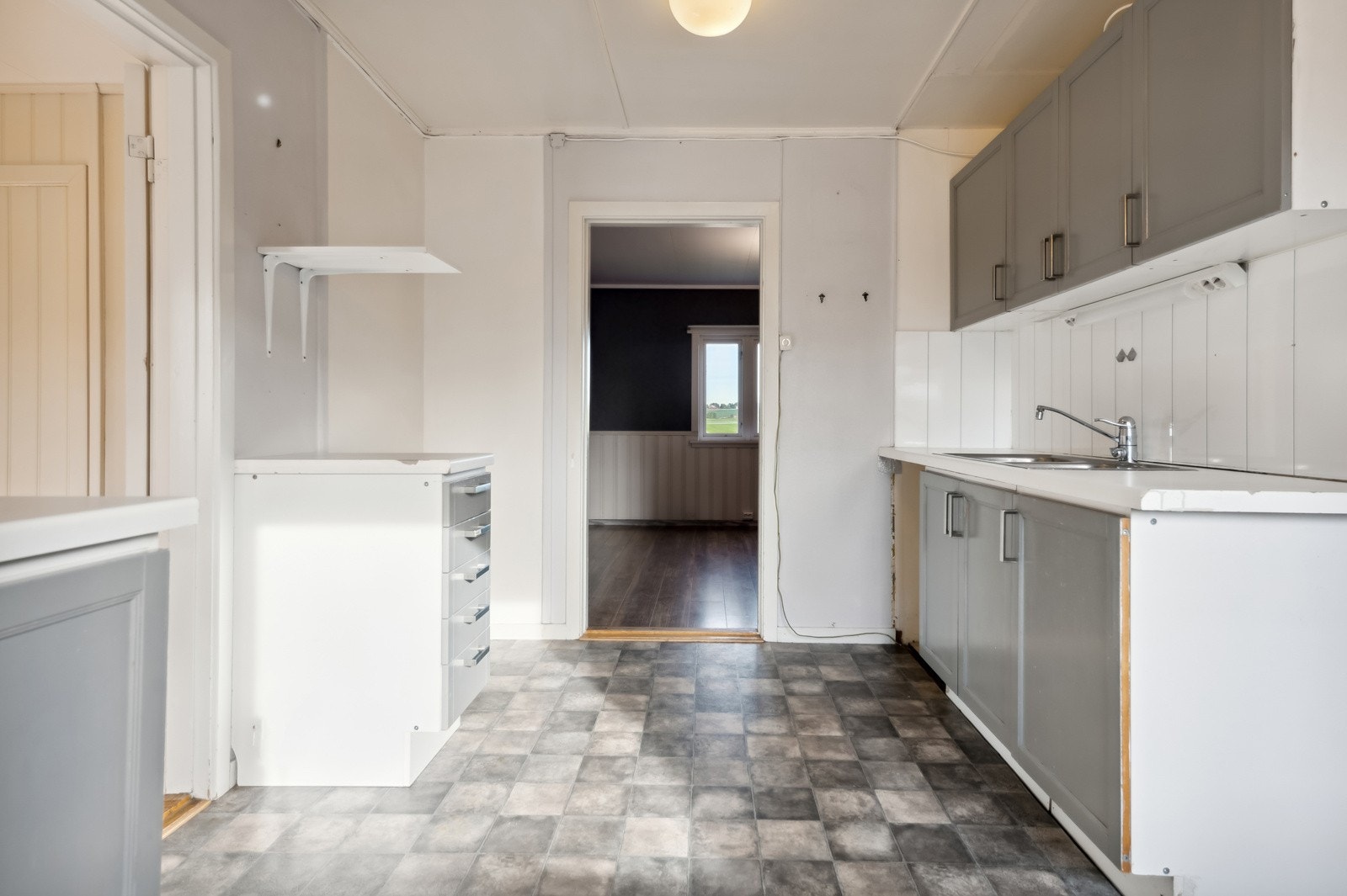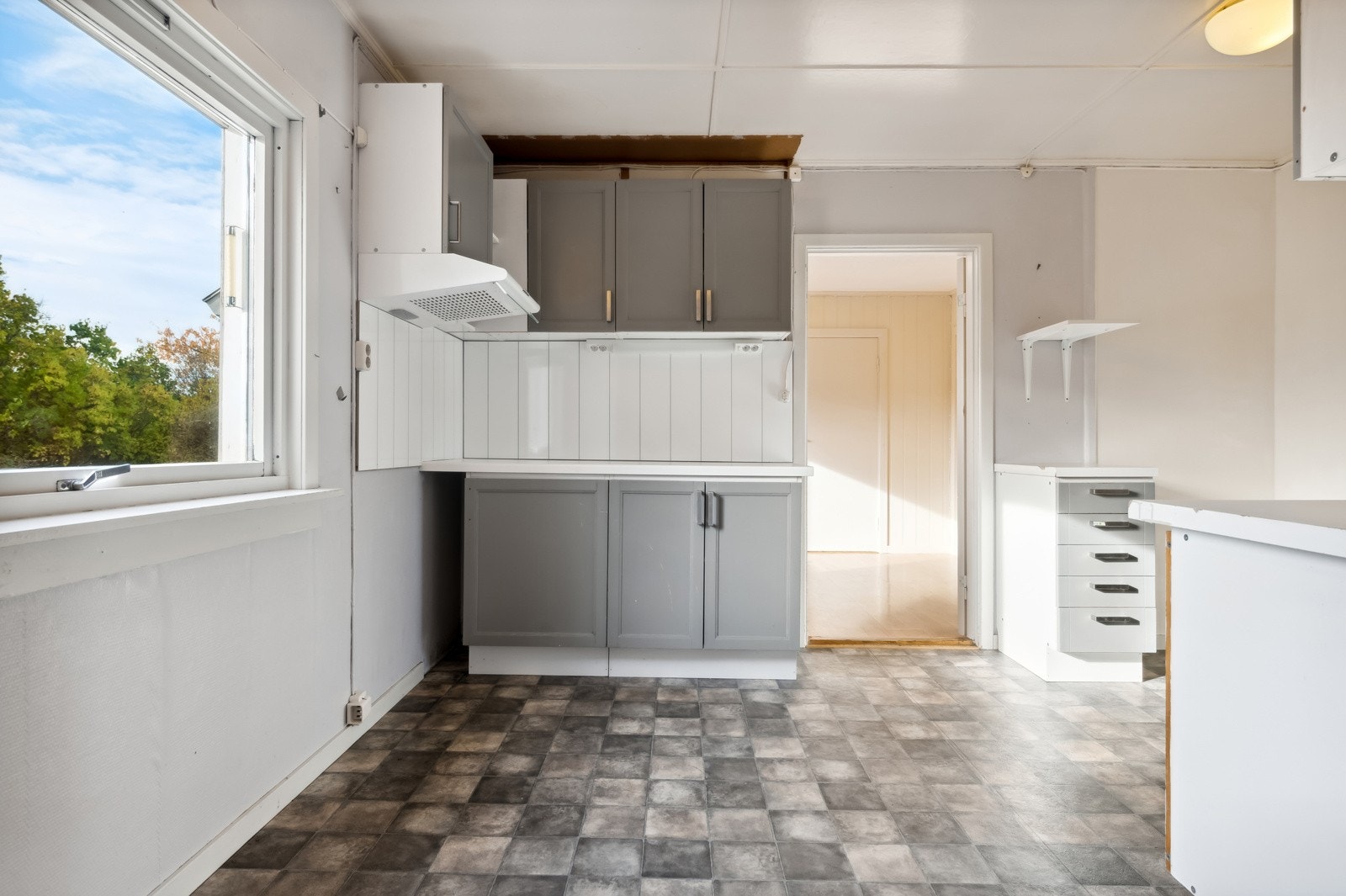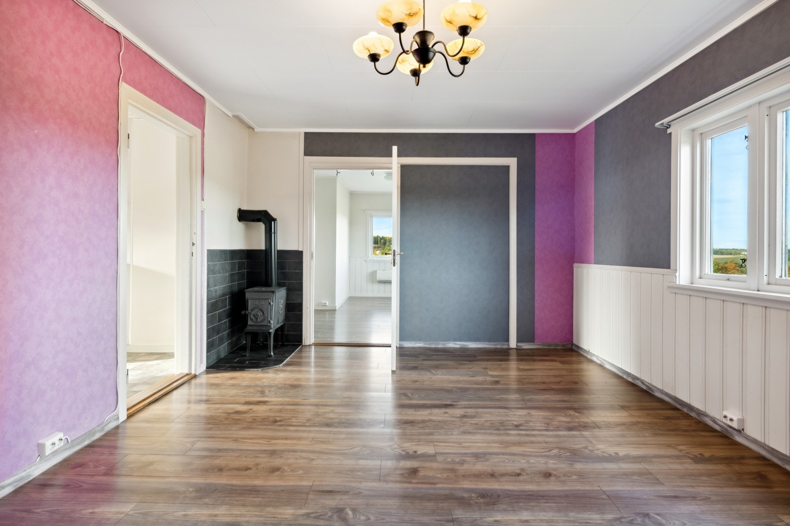 Romslig vindfang/gang med nedgang til kjeller - kjøkken med spiseplass - spisestue med vedovn -
