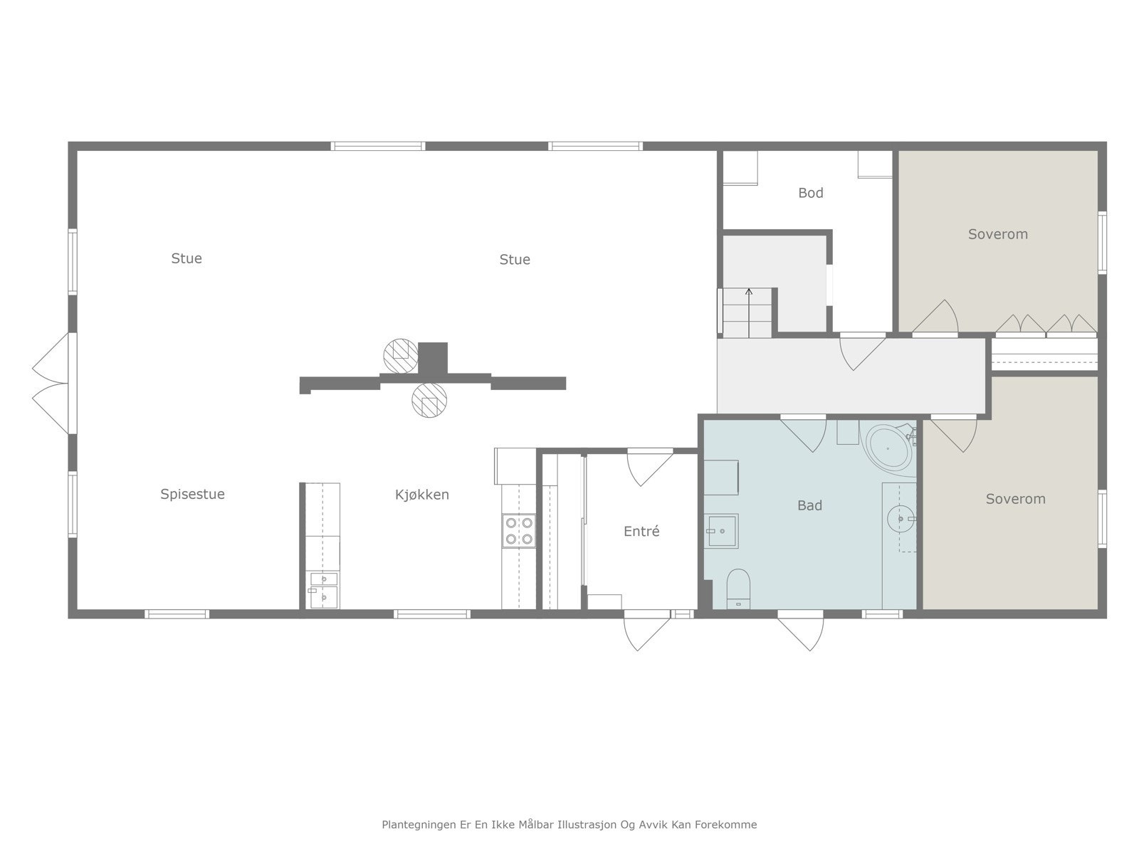 1.Etg: Gang, stue, kjøkken, 2 soverom, bad/vaskerom, bod.