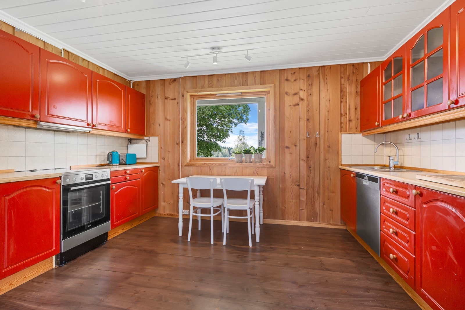 KJØKKEN. Kjøkkeninnredning med skap og skuffer under kjøkkenbenk, og skap over kjøkkenbenk. Funksjonelt kjøkken med fordeling mellom skap- og skuffeseksjoner. Laminerte skrog og laminert benkeplate, malte fronter. Kjøkken er utstyrt med følgende: Nedfelt vaskekum, oppvaskmaskin, frittstående komfyr, kjøleskap. Kjøkkenventilator montert over platetopp / komfyr. Ved fuktsøk på overflater i skap og gulv er det ikke registrert måleverdi som indikerer fukt.