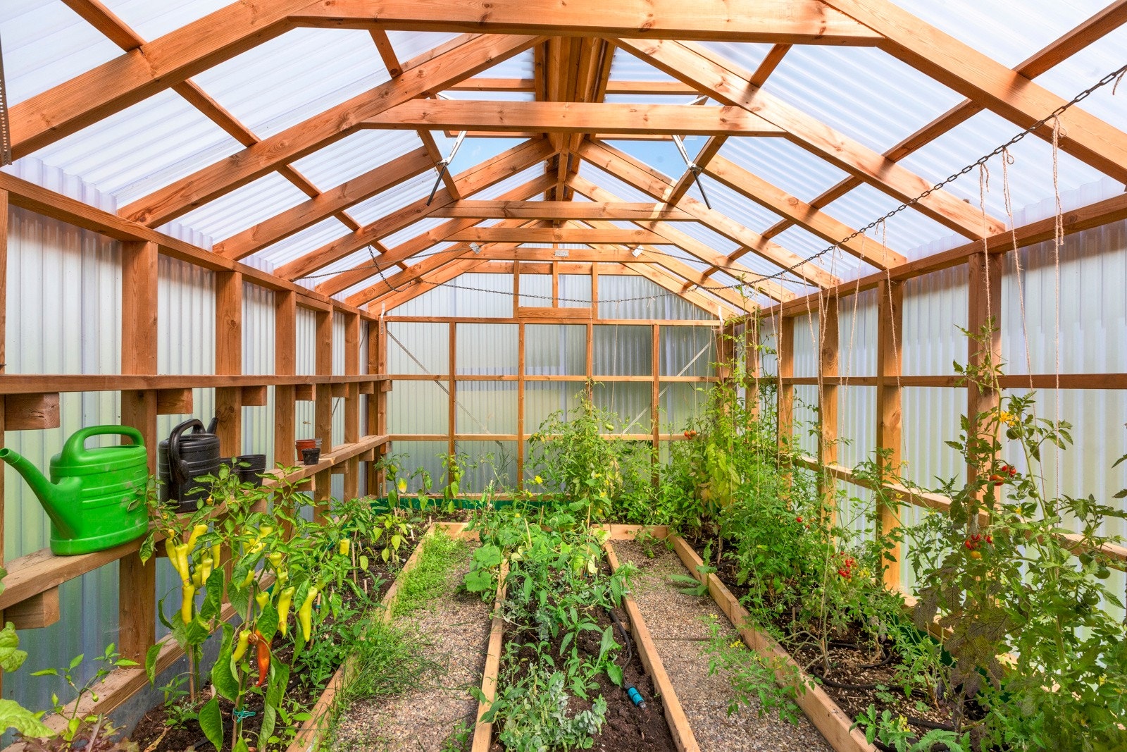 Drivhus md bærekonstruksjon i tre, utvendig kledd med kanalplater i plastmateriale.