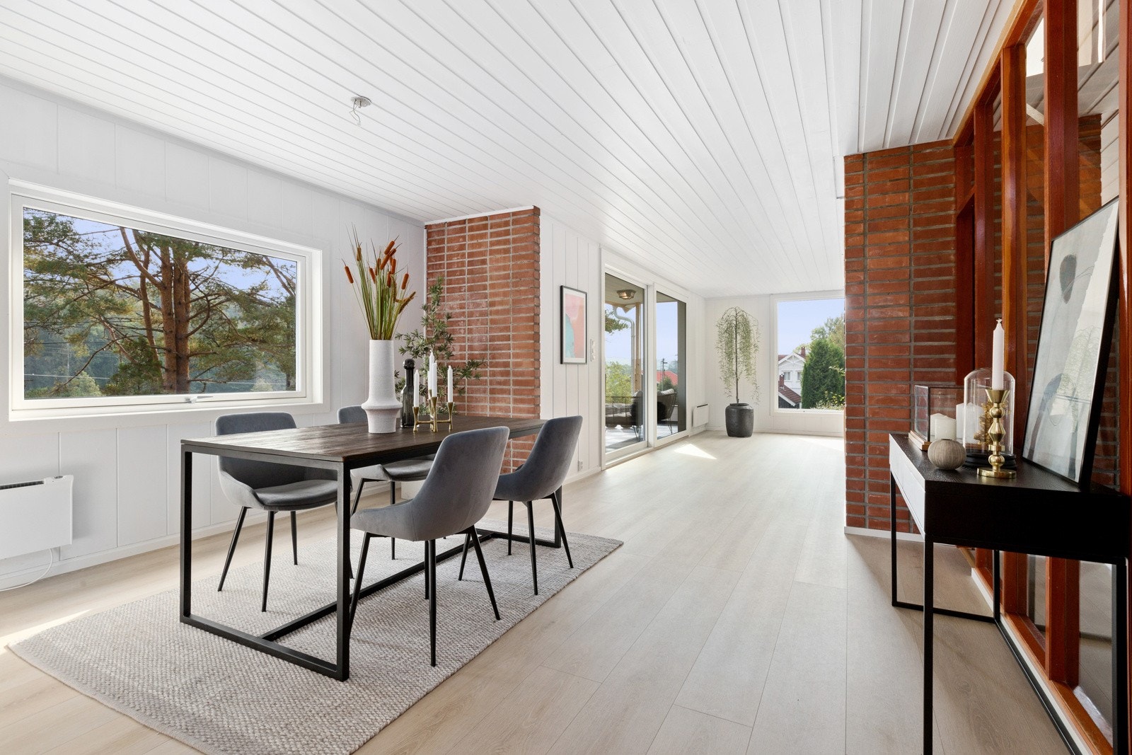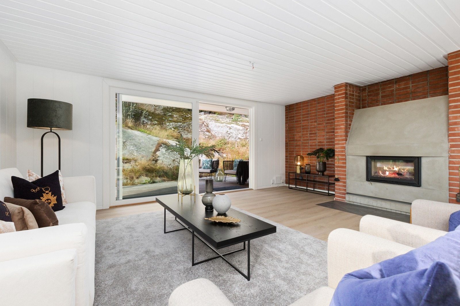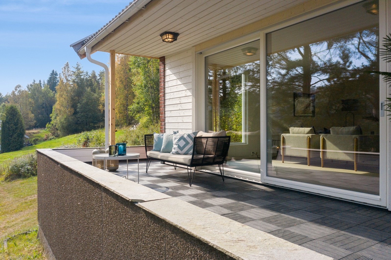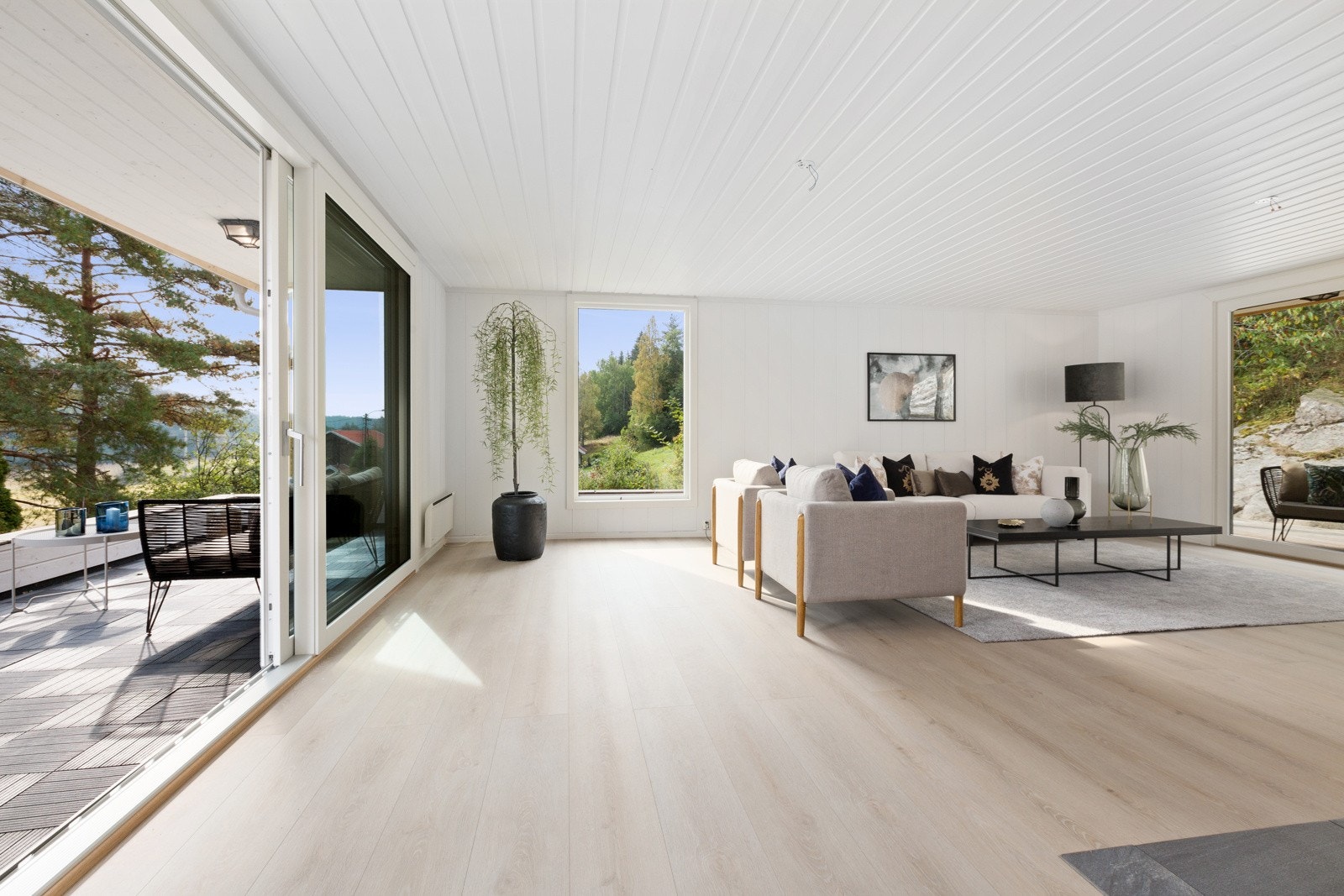 store heve- og skyvedører ut til balkong og terrasse på begge sider av boligen. I etasjen over har man en