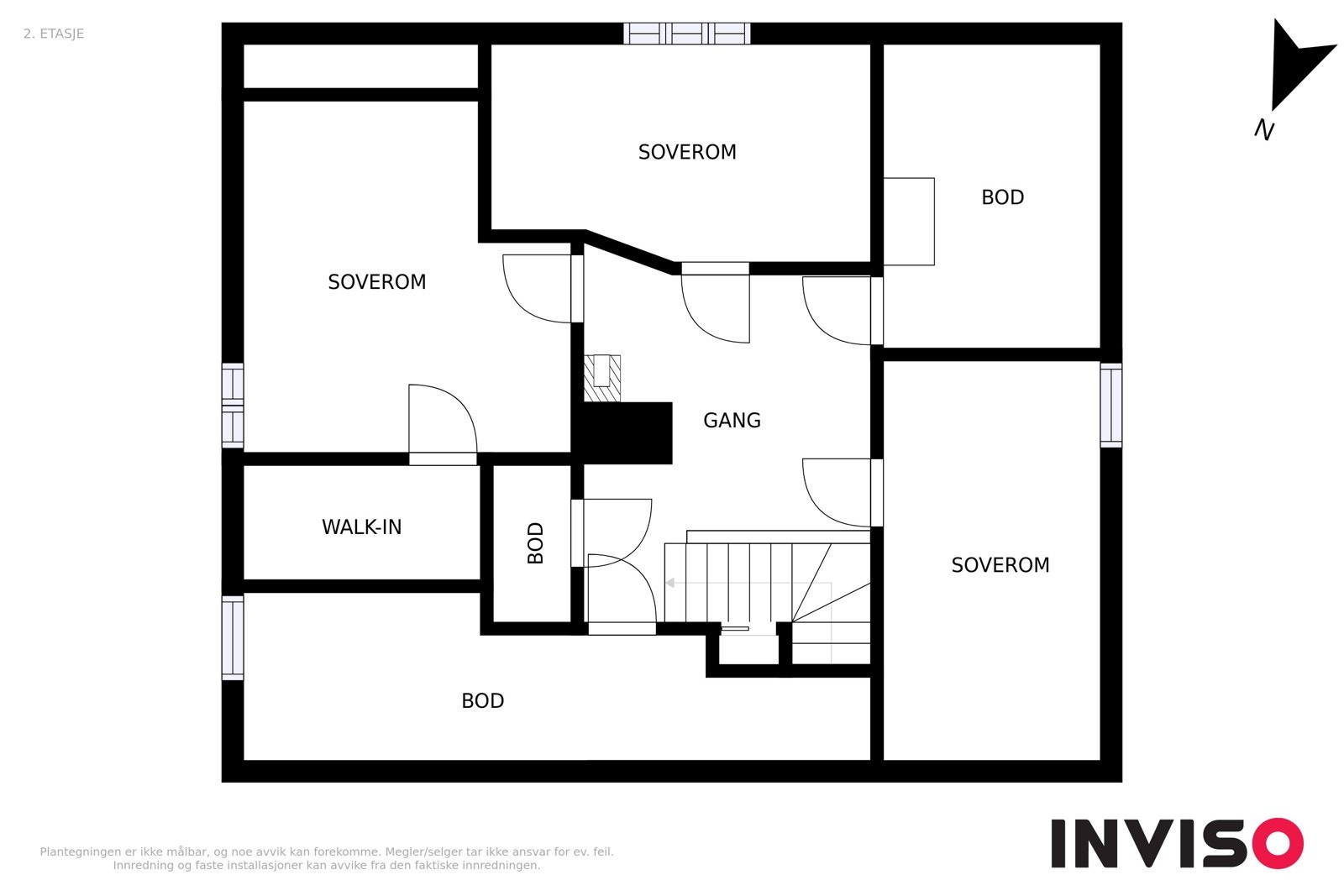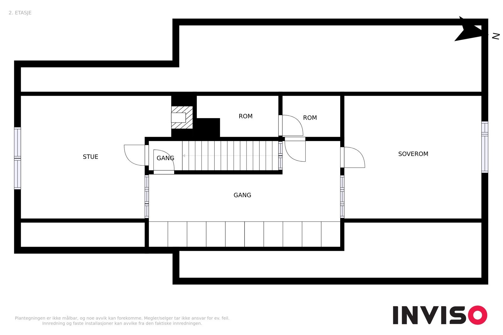 2.Etasje primærrom: Trapperom, gang, stue mot syd, stue mot nord (benyttes som soverom i dag)