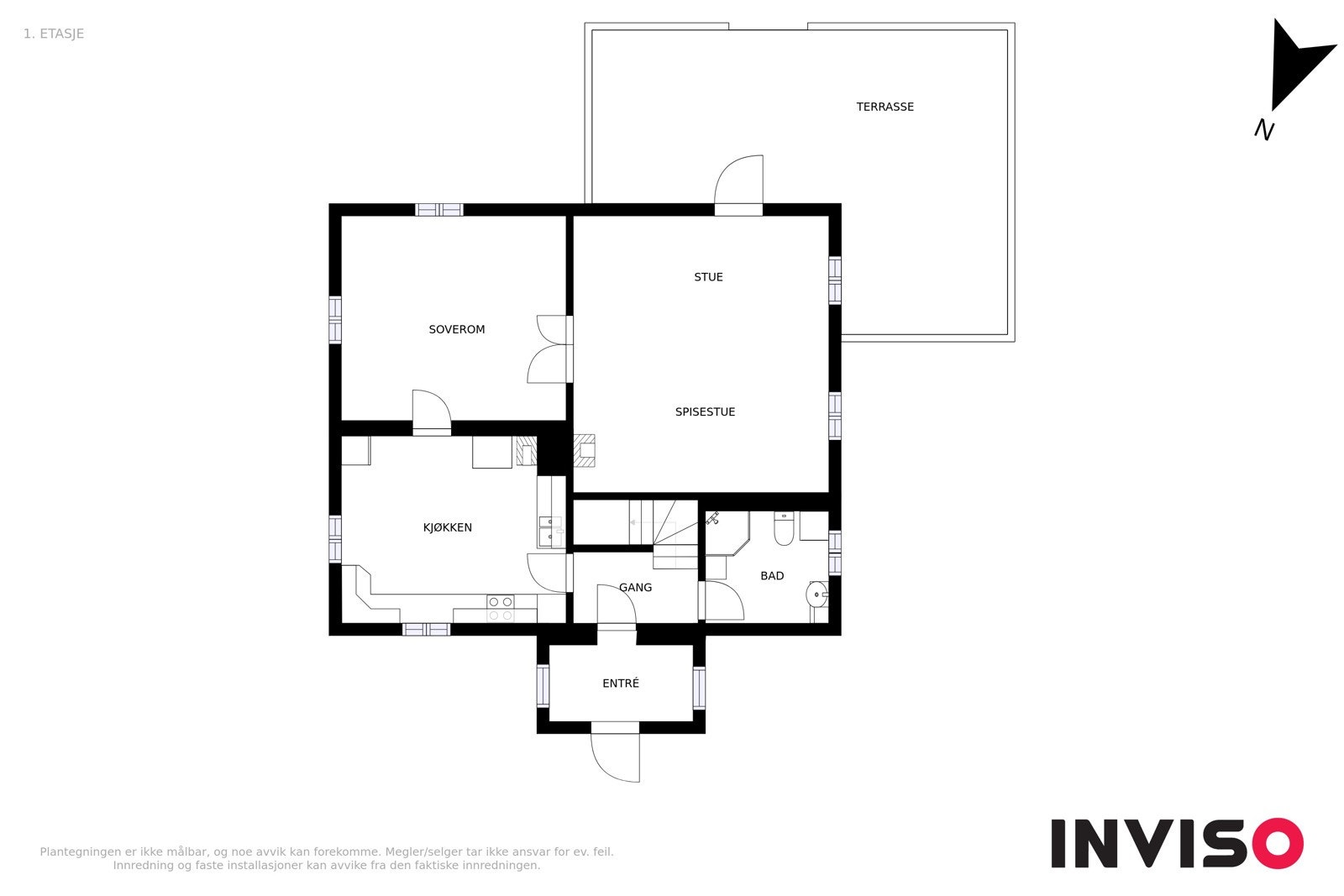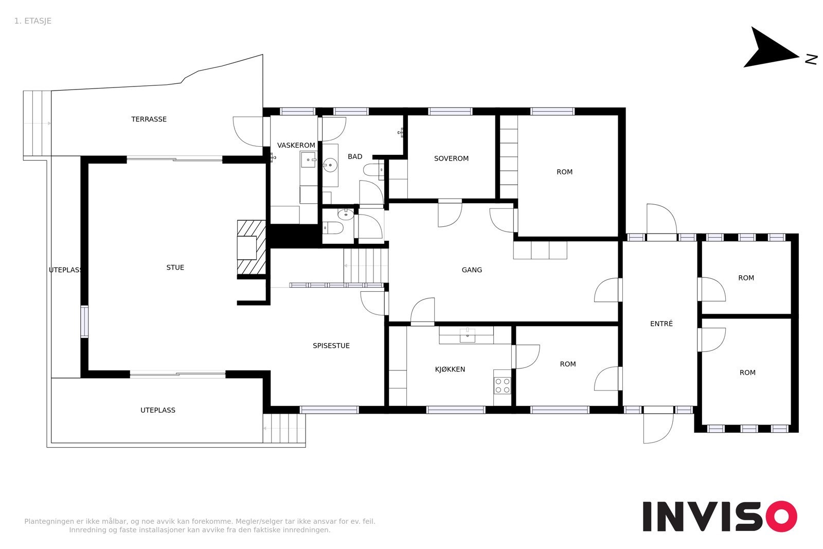 1.Etasje primærrom: Hall, grovkjøkken, kjøkken, hall m/trapp, gang, bad, vaskerom, stue m/utgang til to