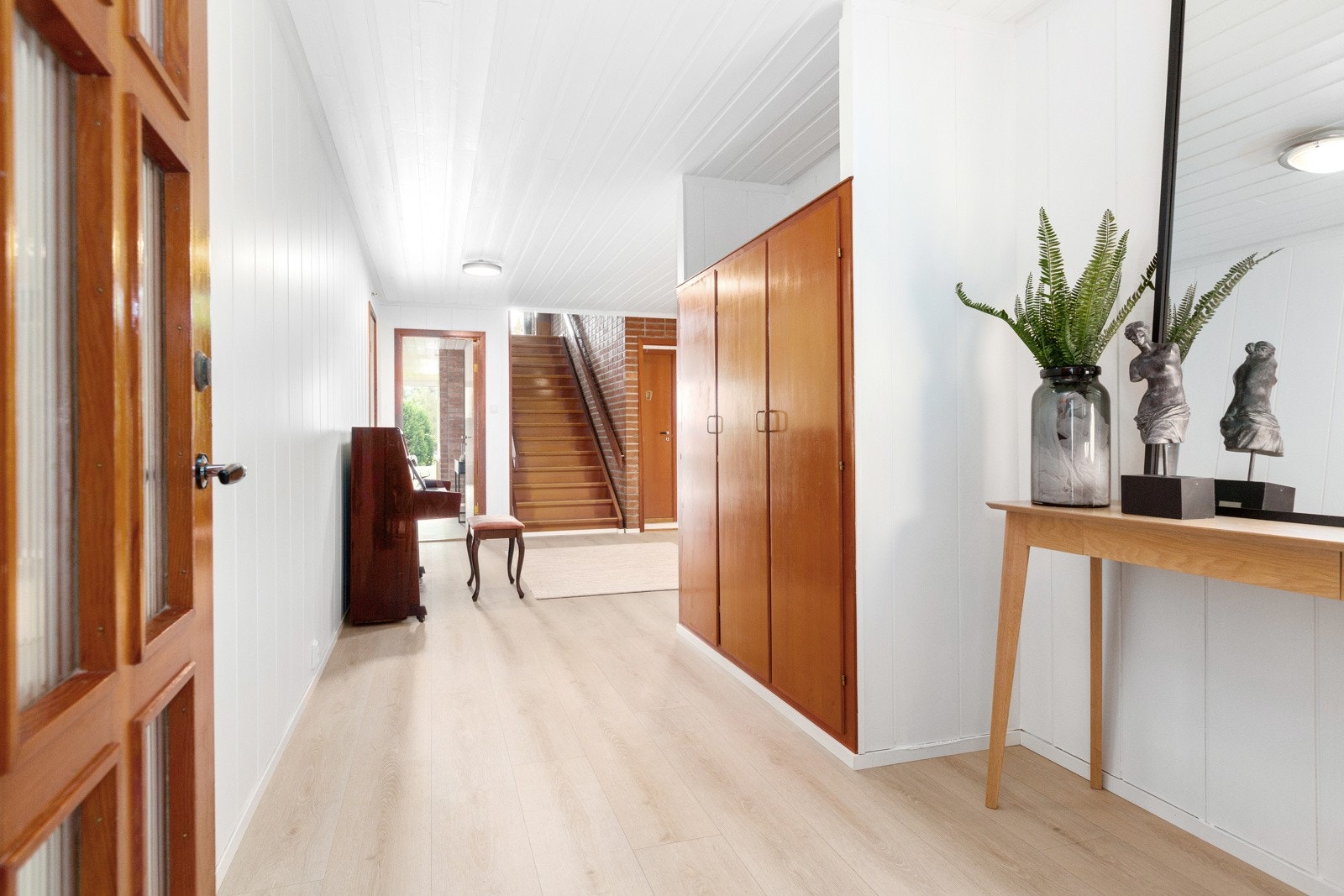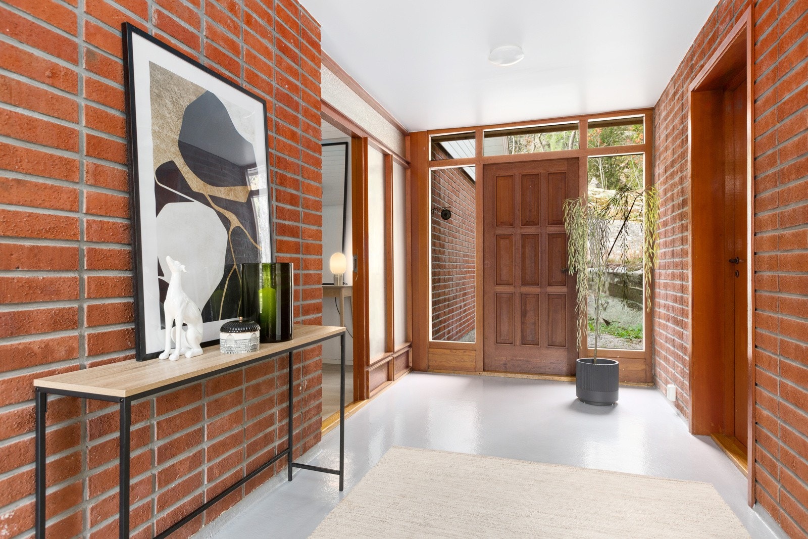 Boligens inngangsparti og hall strekker seg på tvers av bygningen og har entrédører både på østsiden og