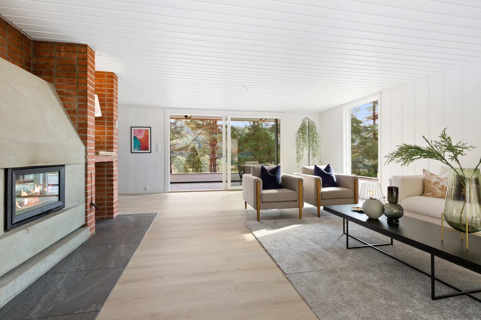 spise- og dagligstue på godt over 60 kvm, med en stor peis sentralt plassert i rommet. Fra stuen er det