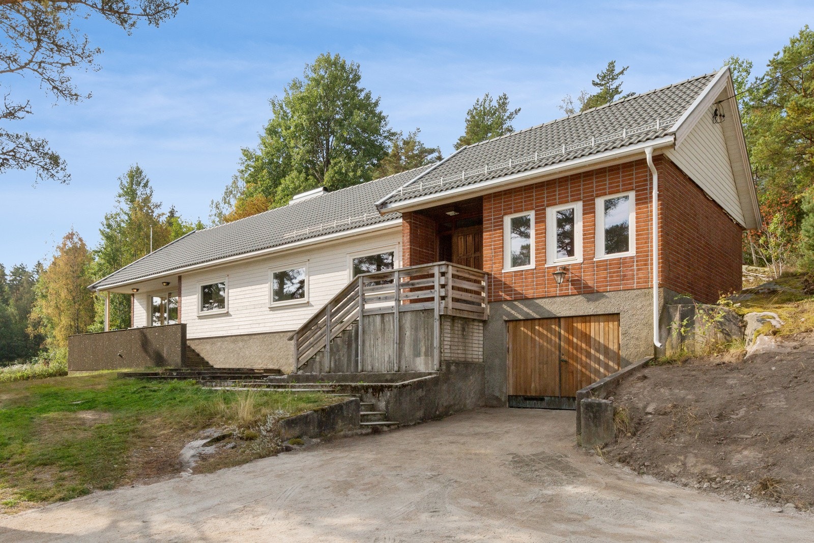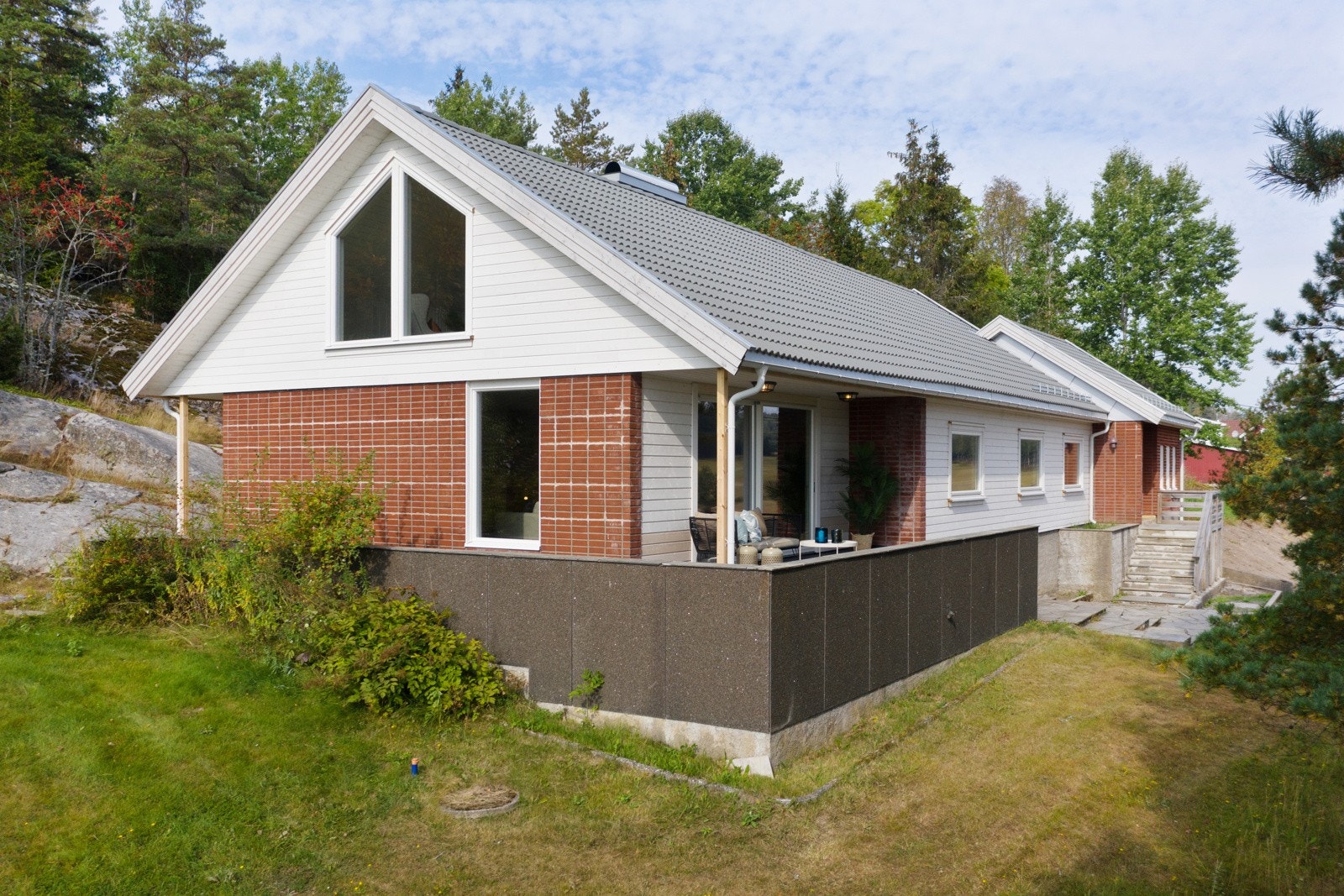 tre og plasstøpt betong utvendig kledd med teglstein, plater og trekledning. Trekledning og plater er skiftet