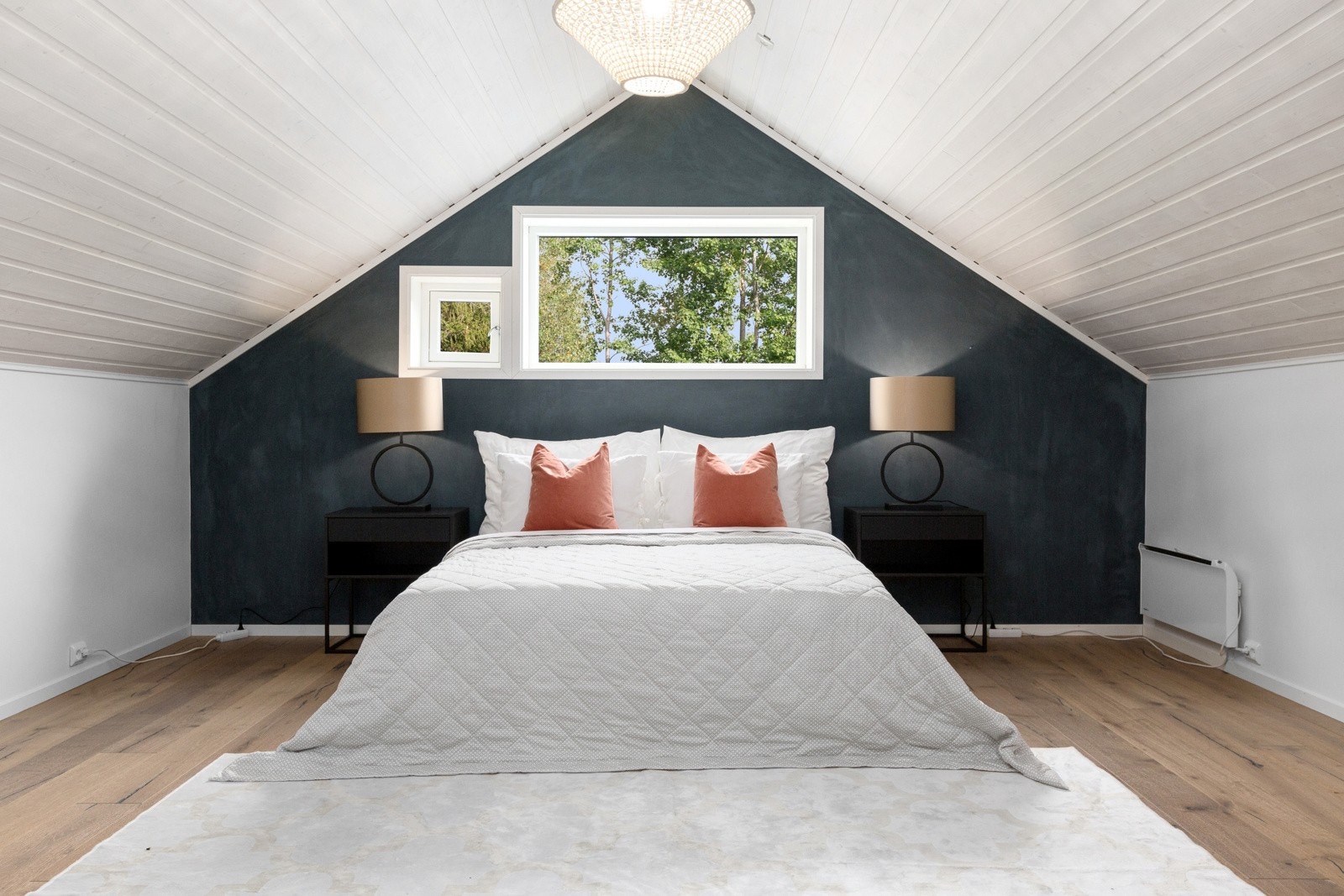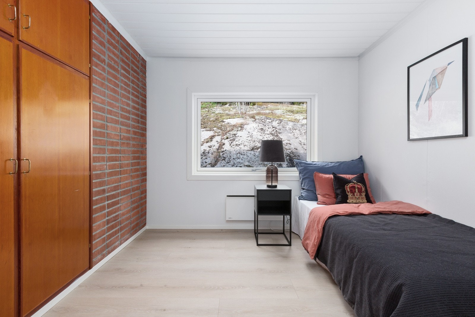 Overflater vegger: Hovedsakelig malt trepanel.