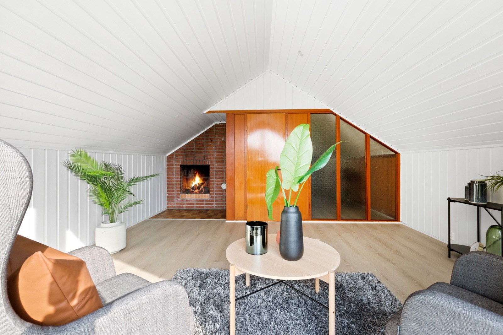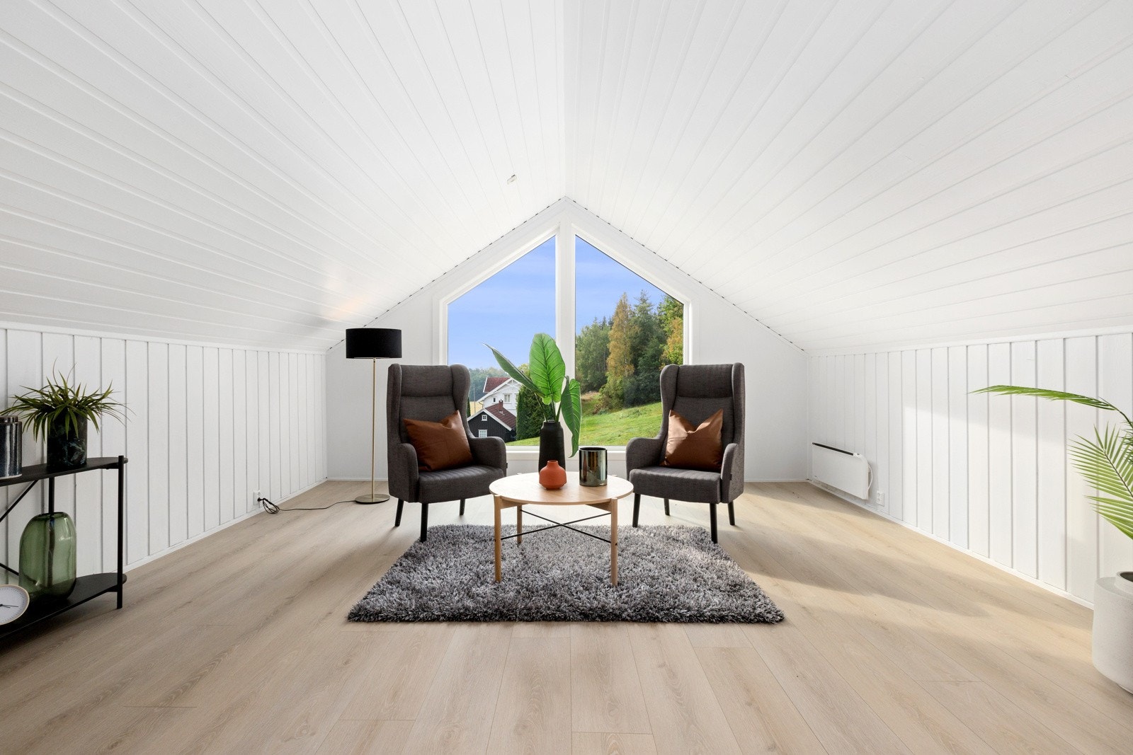 mer intim loftstue med peis og store panoramavinduer til syd. I tillegg består etasjen av enda en stue i