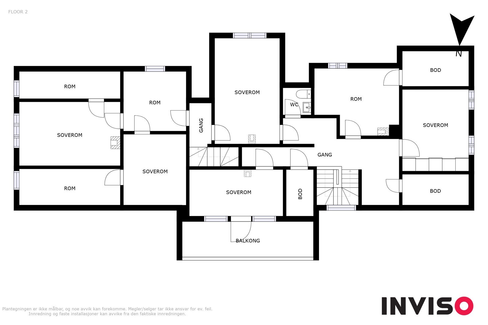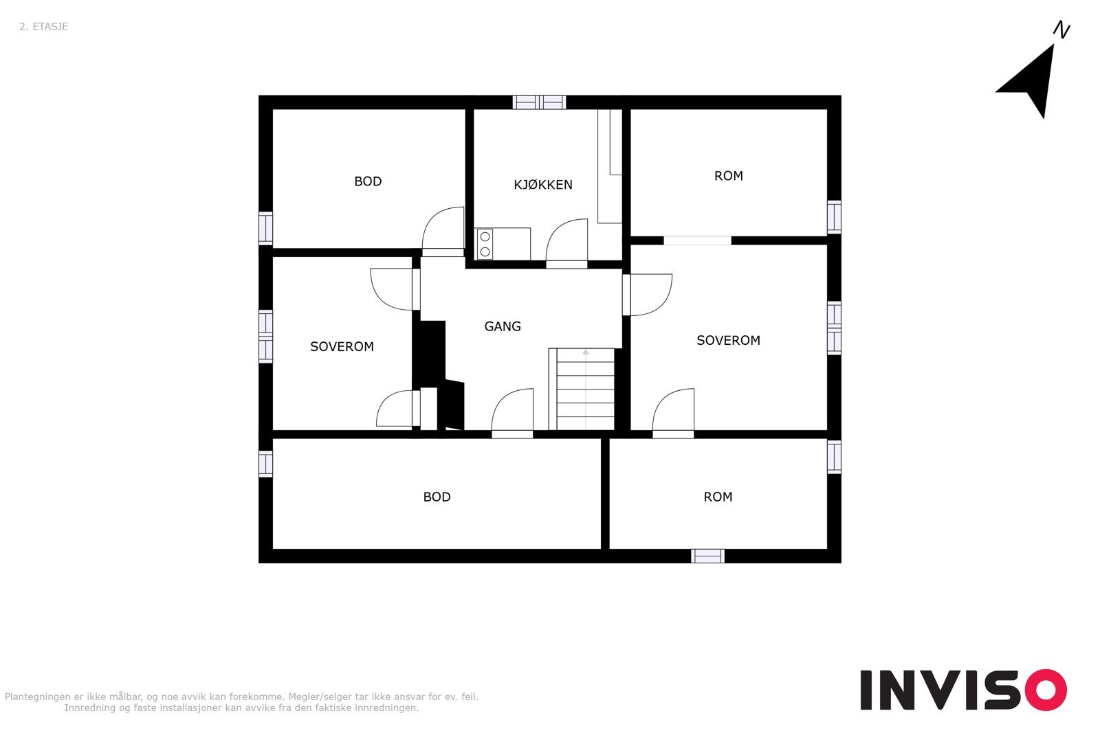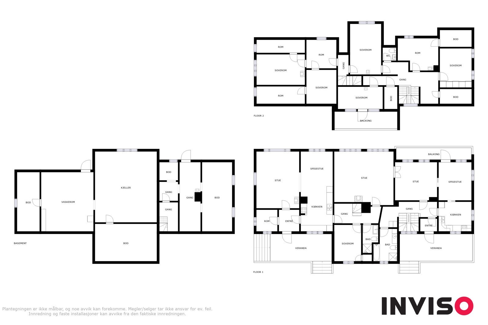 gang, trapperom, bad/wc, ett soverom, kjøkken og to stuer. I 2. etasje er trapperom og tre soverom, ett av