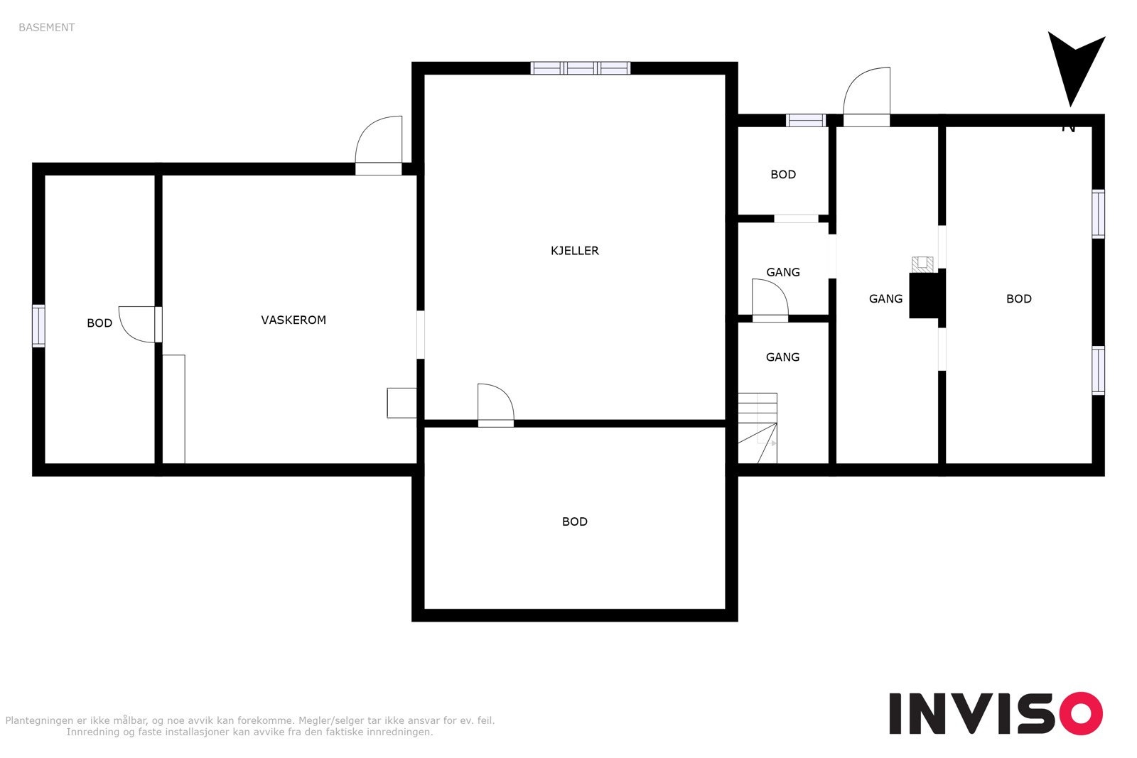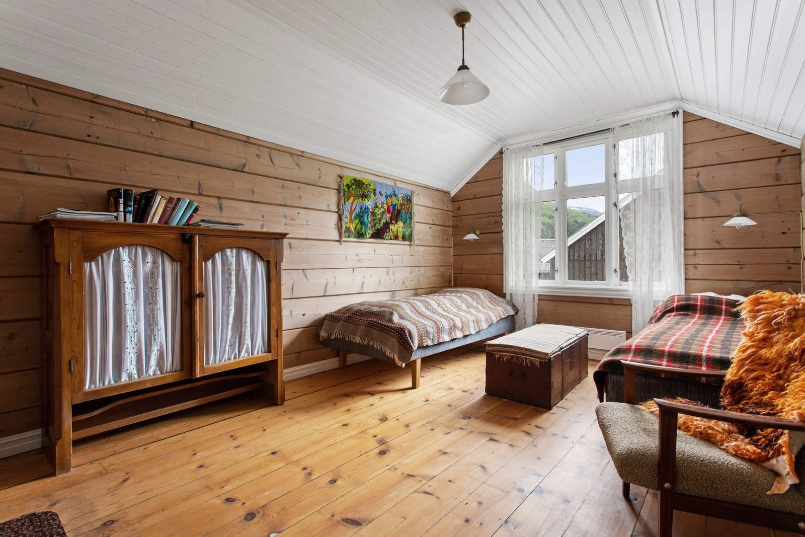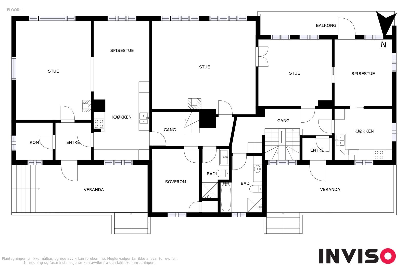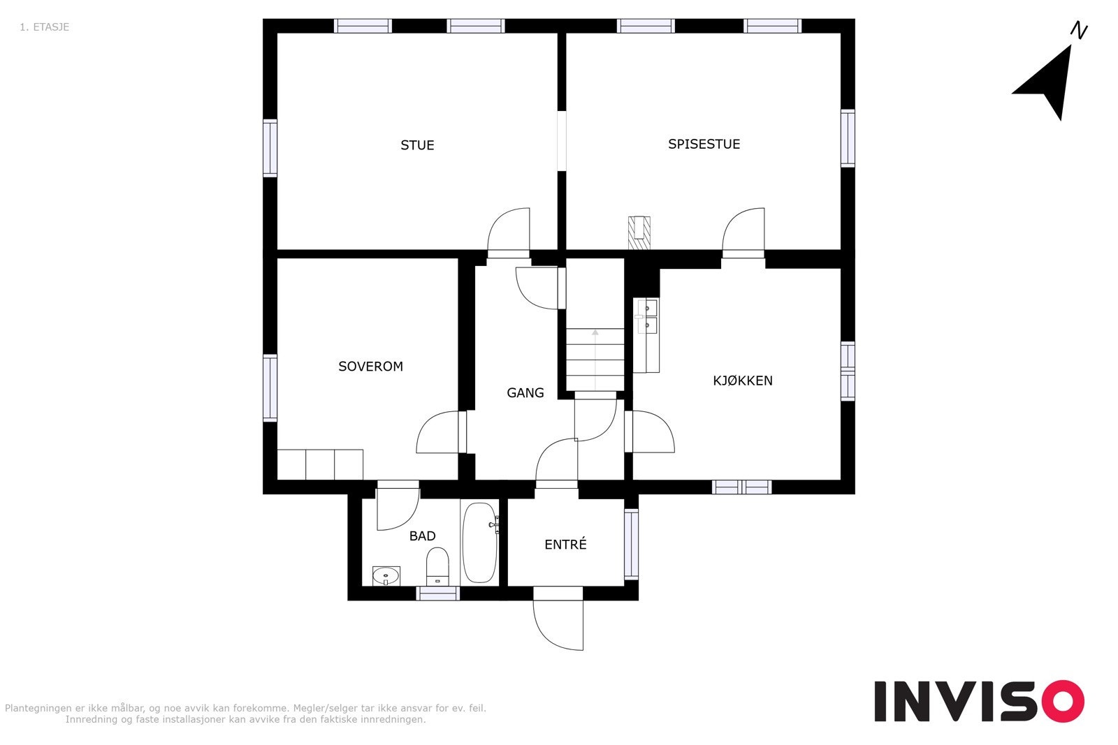 gang, trapperom, bad/wc, ett soverom, kjøkken og to stuer. I 2. etasje er trapperom og tre soverom, ett av