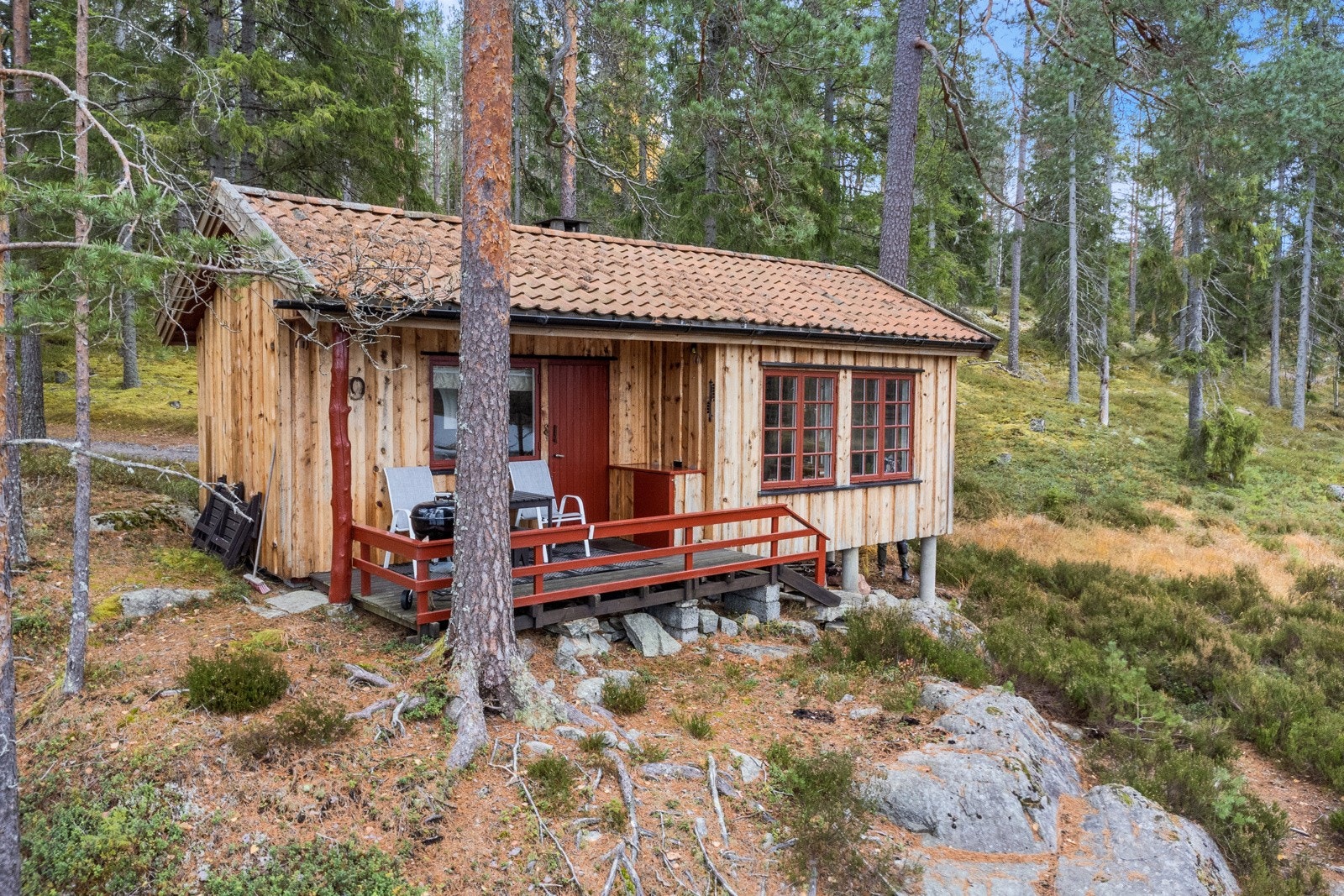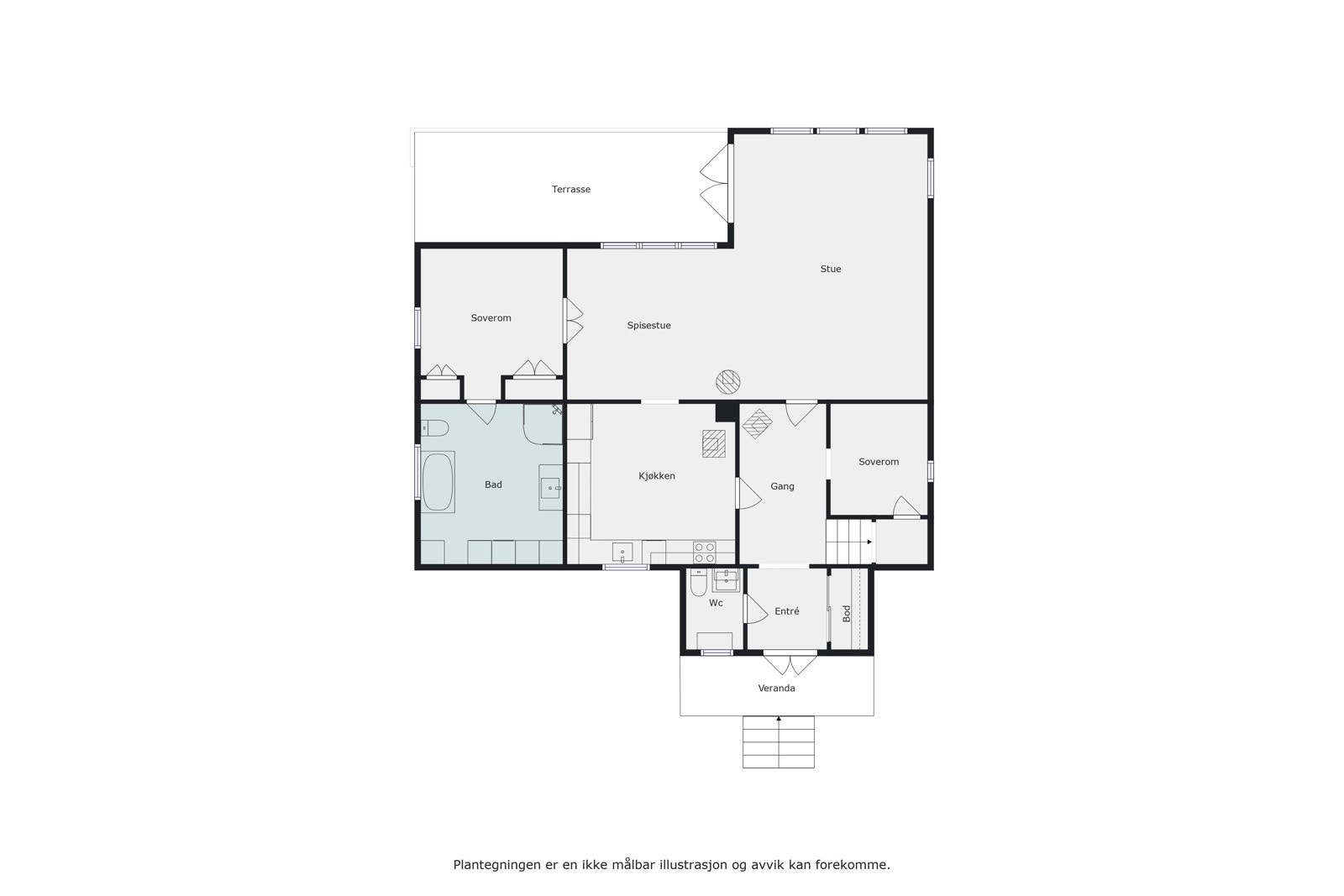 Bygningen har malt hovedytterdør og malt verandadør i tre.
