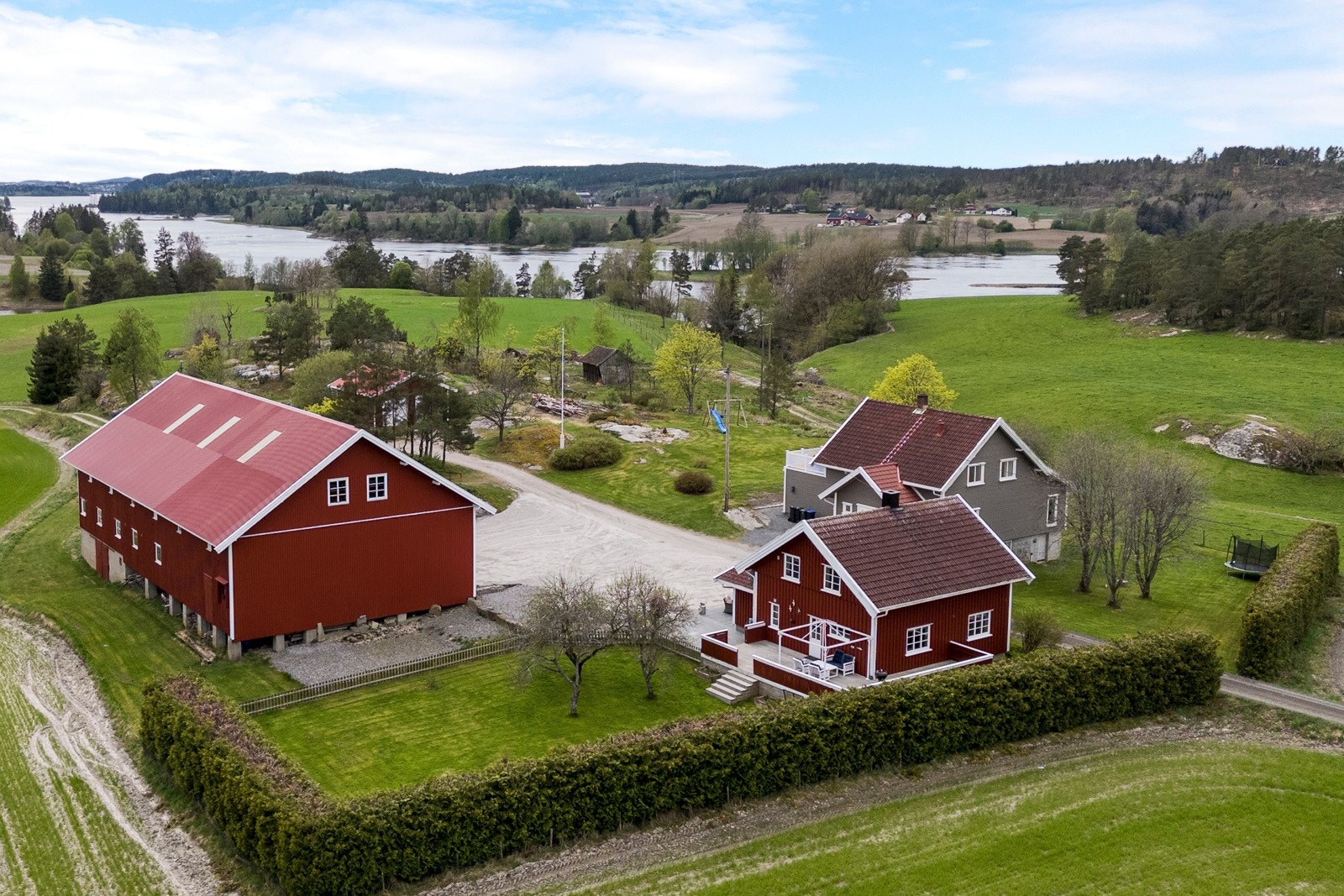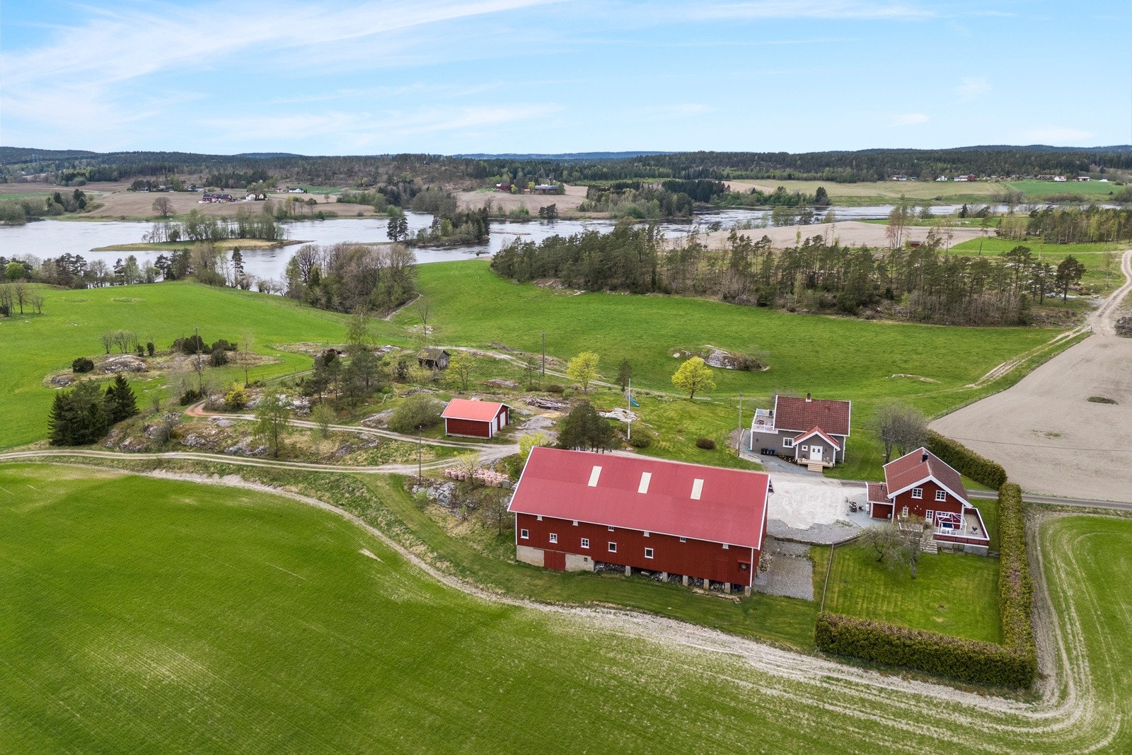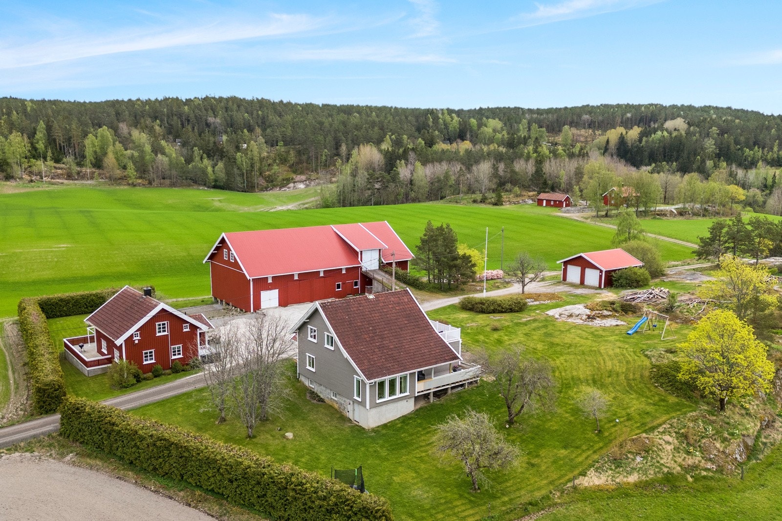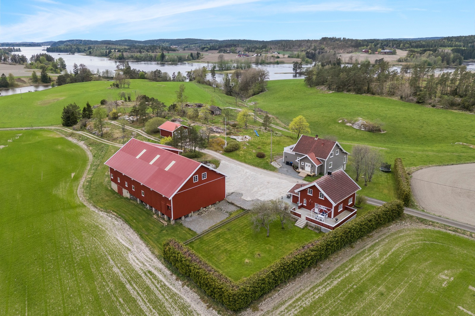 Eiendommen består av flere velholdte og moderne bygninger, inkludert våningshus, låve, garasje og en kårbolig med utleiemuligheter som kan bli en god inntektskilde.