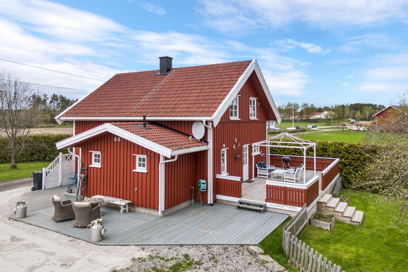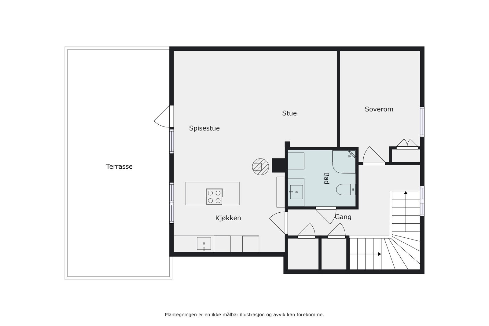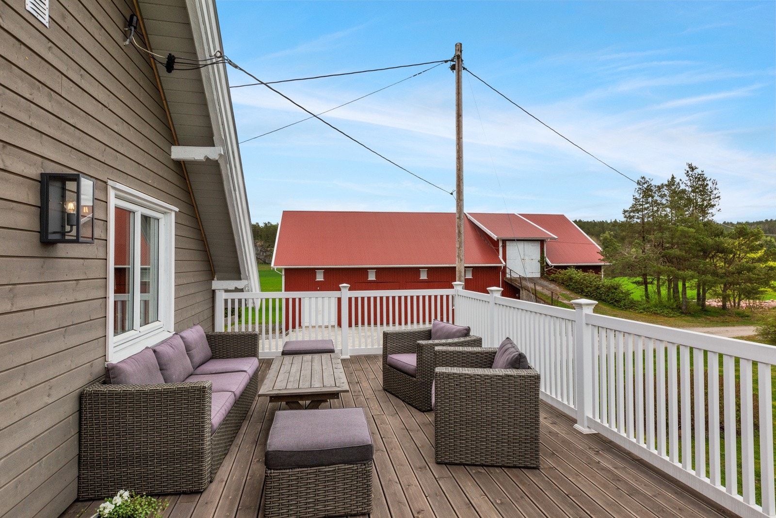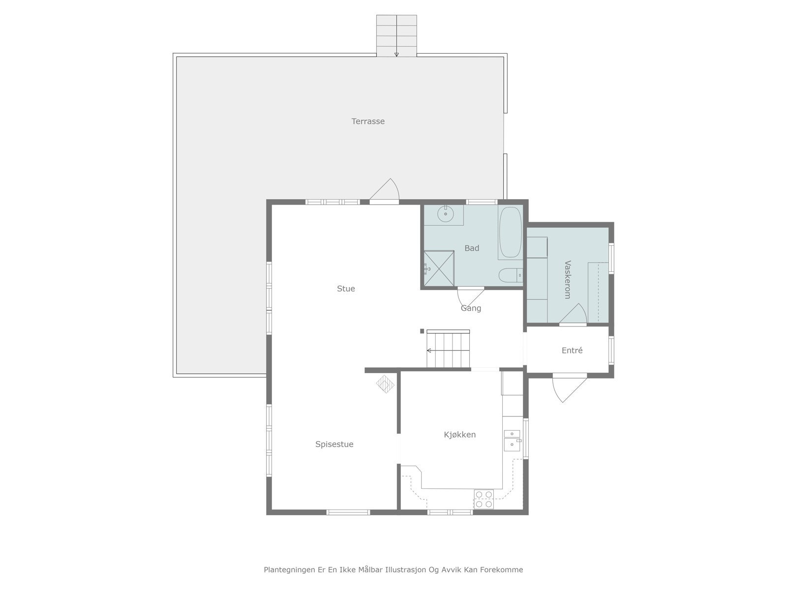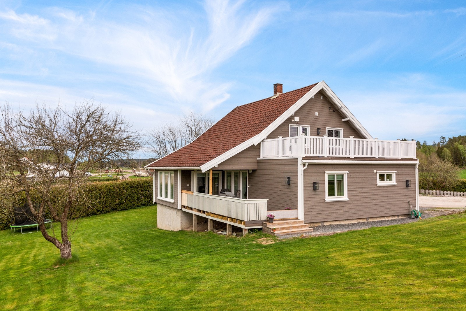Treterrasse/veranda med adkomst i fra entré, stue og hage.