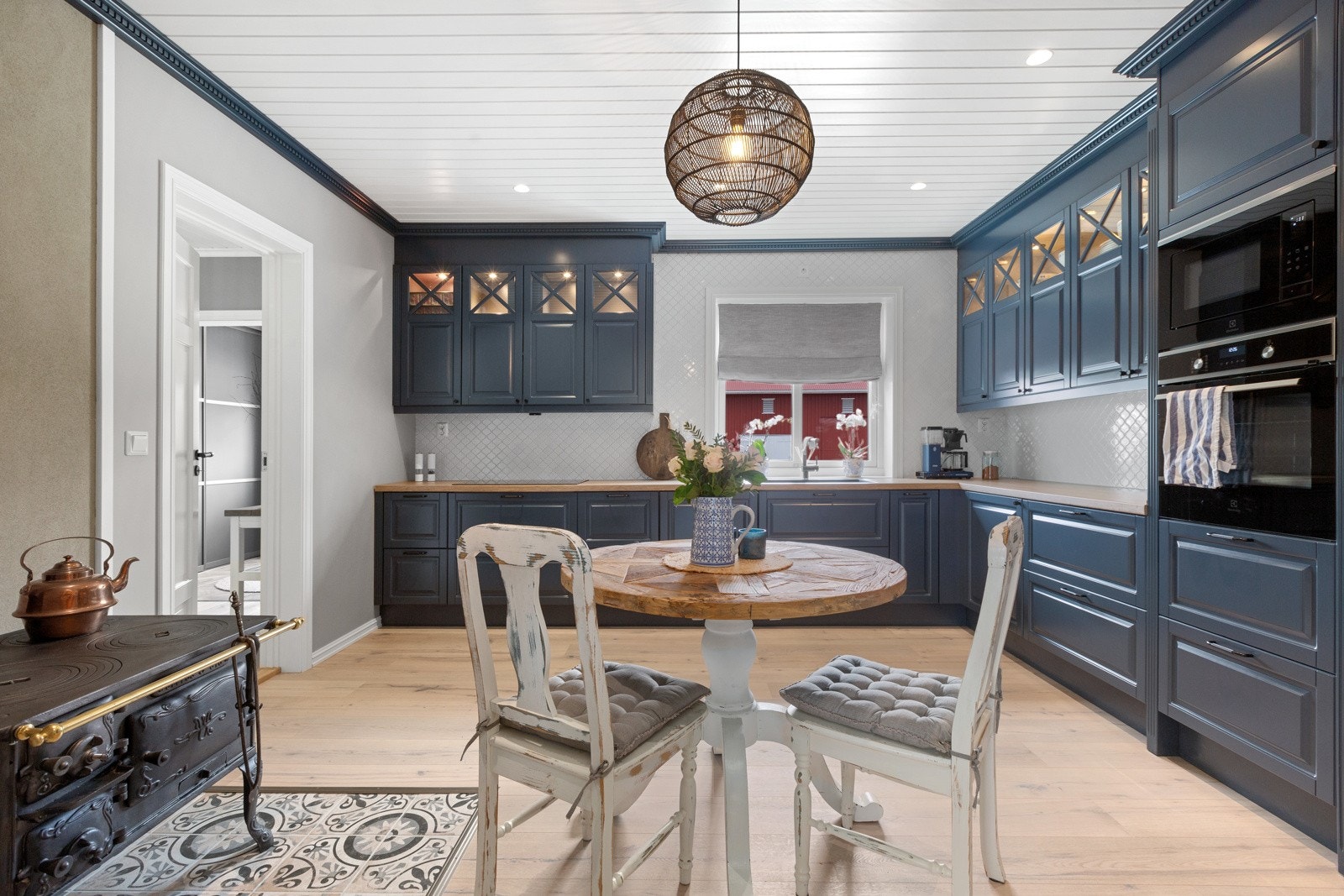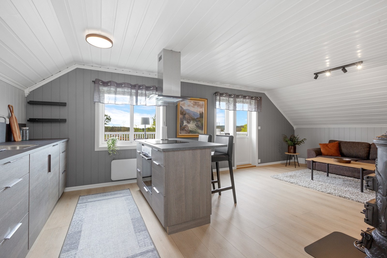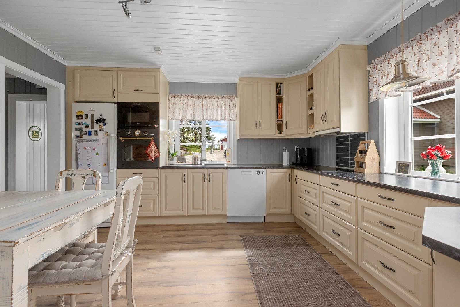 Kjøkken med malte, profilerte fronter, ettgreps blandebatteri i kum, laminatbenkeplate, integrert stekeovn, integrert mikrobølgeovn, plate over platetopp, oppvaskmaskin under benk og kjøleskap.