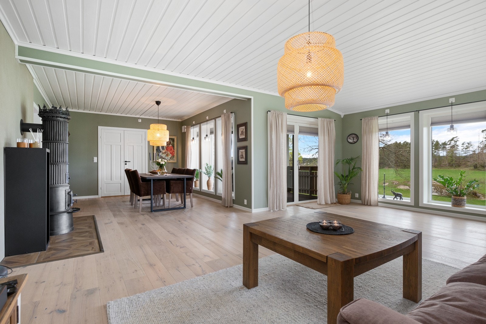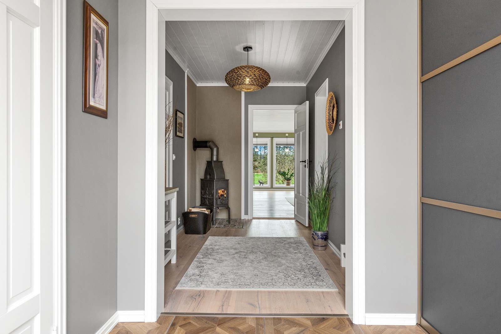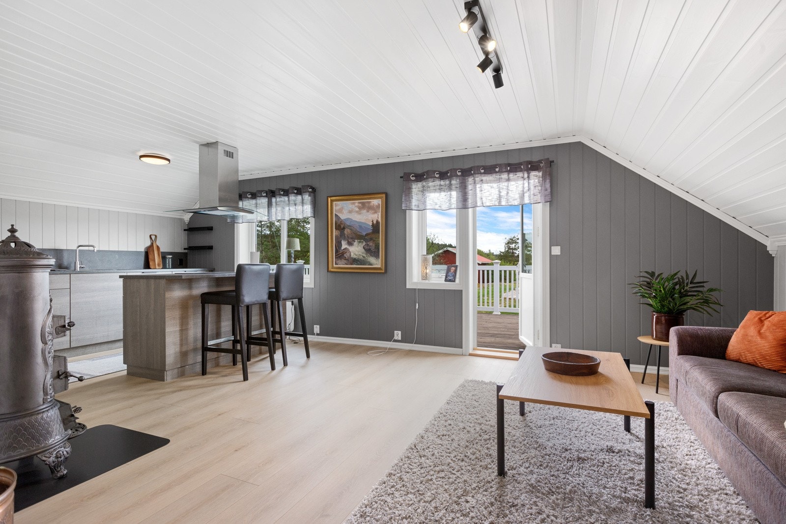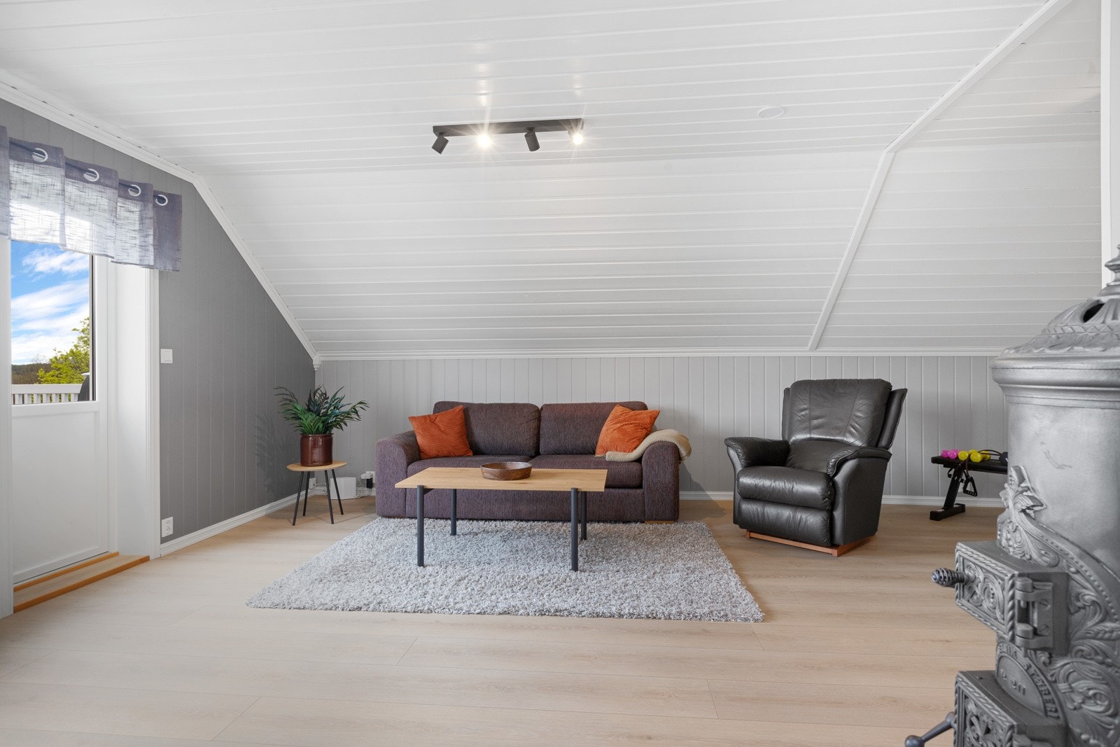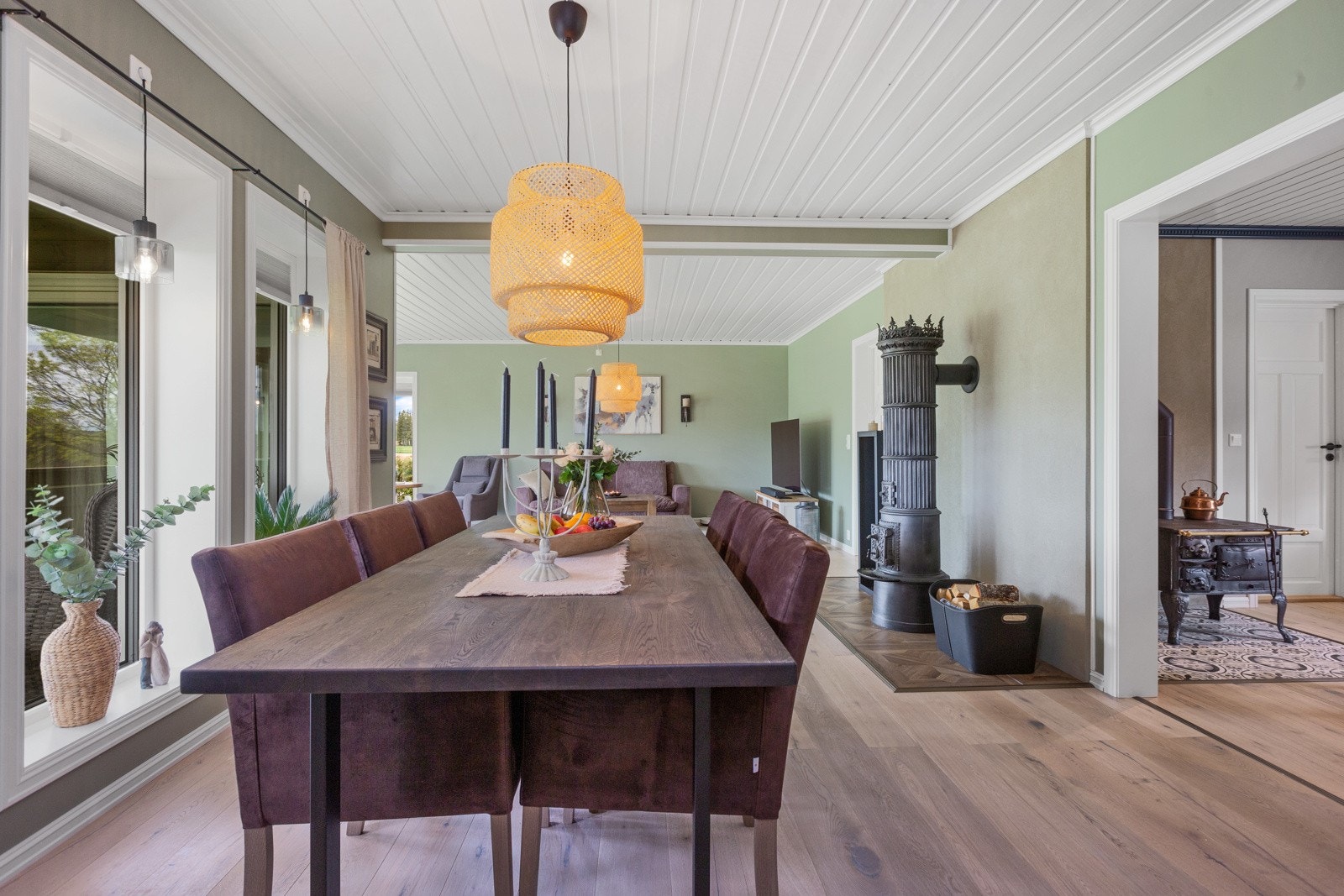 Boligen har mursteinspipe og vedovn.