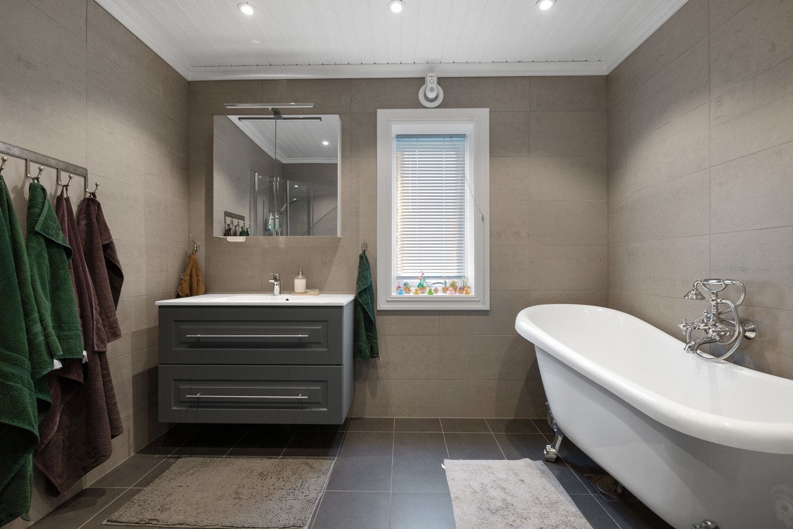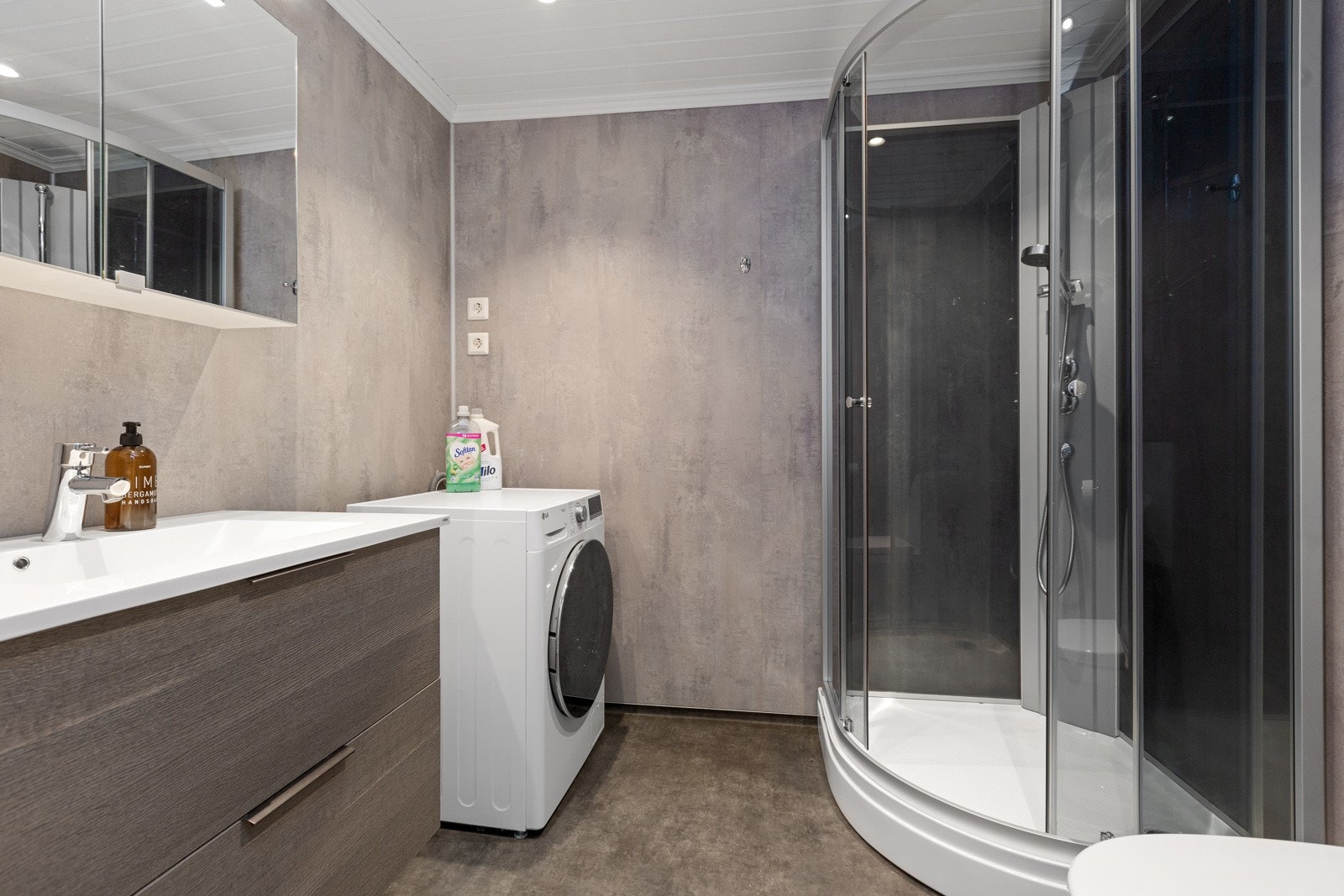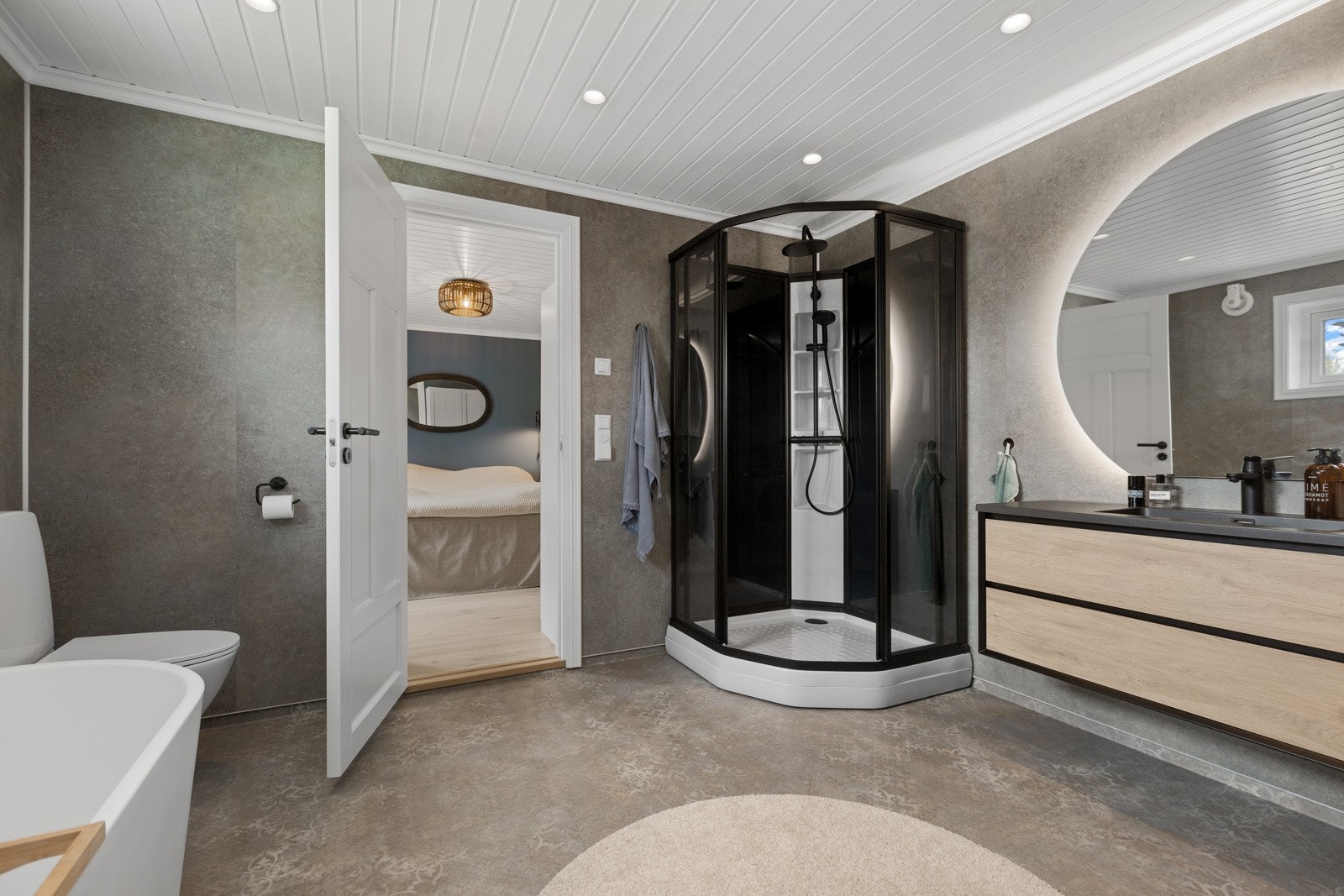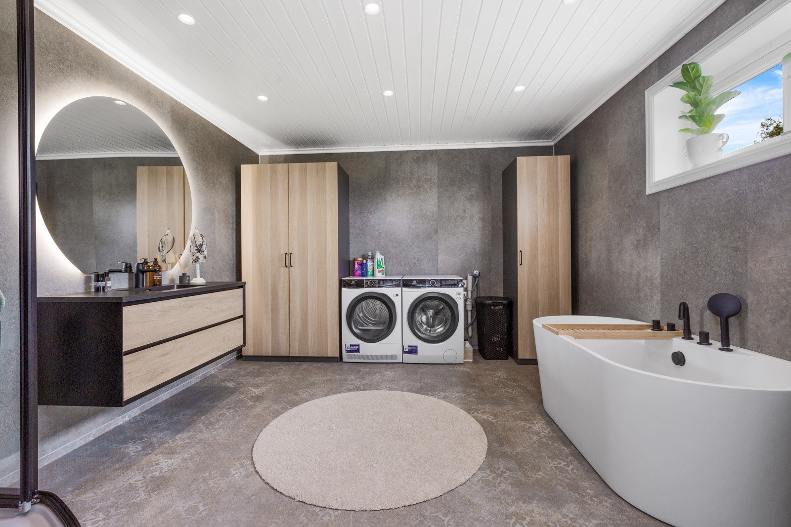 Gulvmontert toalett, servant med ettgreps blandebatteri, servantmøbel, høyskap, overskap, speil med lys, badekar med dusjutstyr, opplegg for vaskemaskin, plass til kondenstørketrommel og dusjkabinett. Innreding fra 2023