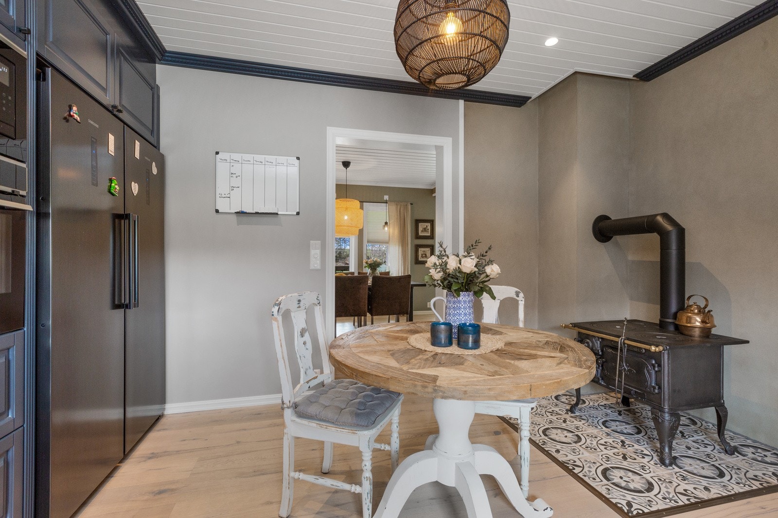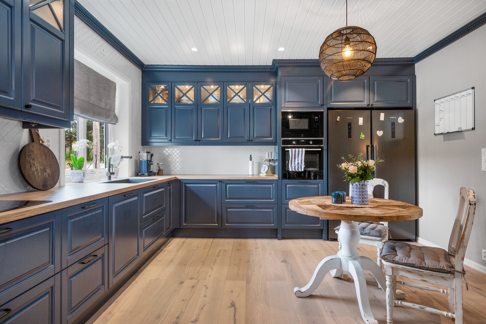 Kjøkken med malte fronter, ettgreps blandebatteri i kum benkebeslag, f liser over laminatbenkeplate, induksjonstopp, integrert oppvaskmaskin, integrert stekeovn, integrert mikrbølgeovn, kjøleskap og fryser. Kjøkkeninnredingen er fra 2023.