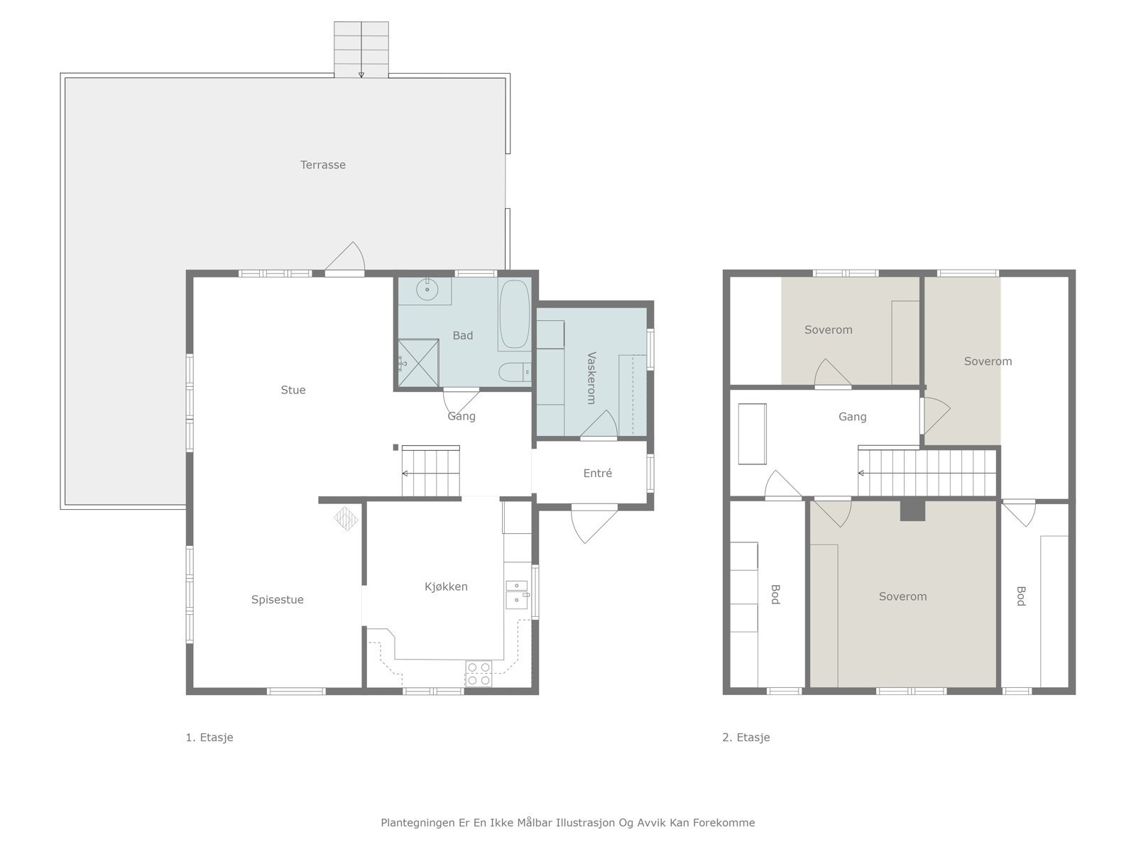 1.Etg: Vindfang, trappegang, gjesterom, stue, kjøkken, bad/vaskerom, wc og soverom.