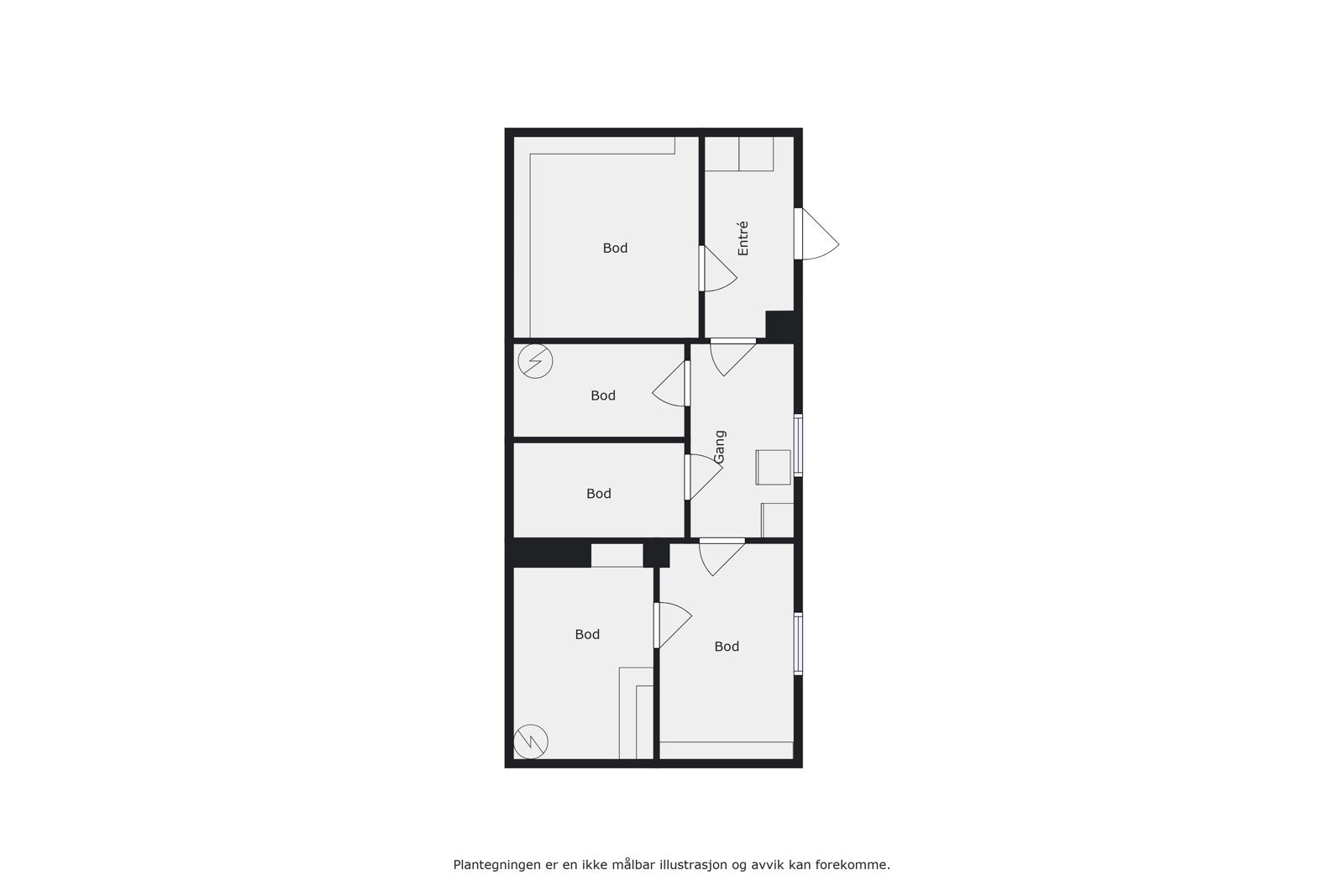 Dørene har merker og behov for vedlikehold og utbedringer. Normal tid før utskifting av tredører er 20 – 40 år.