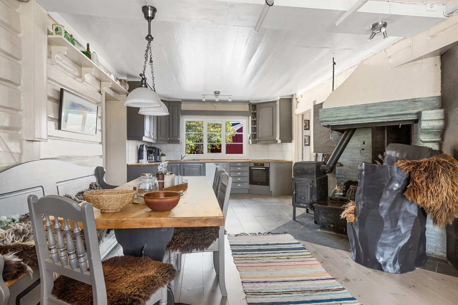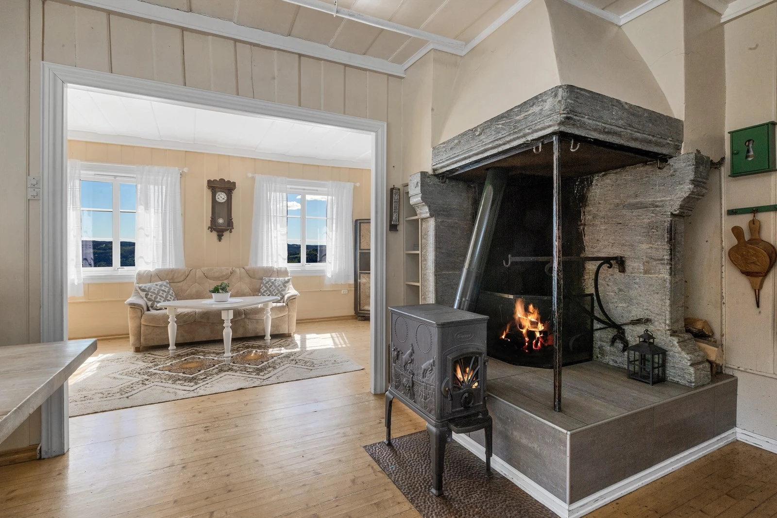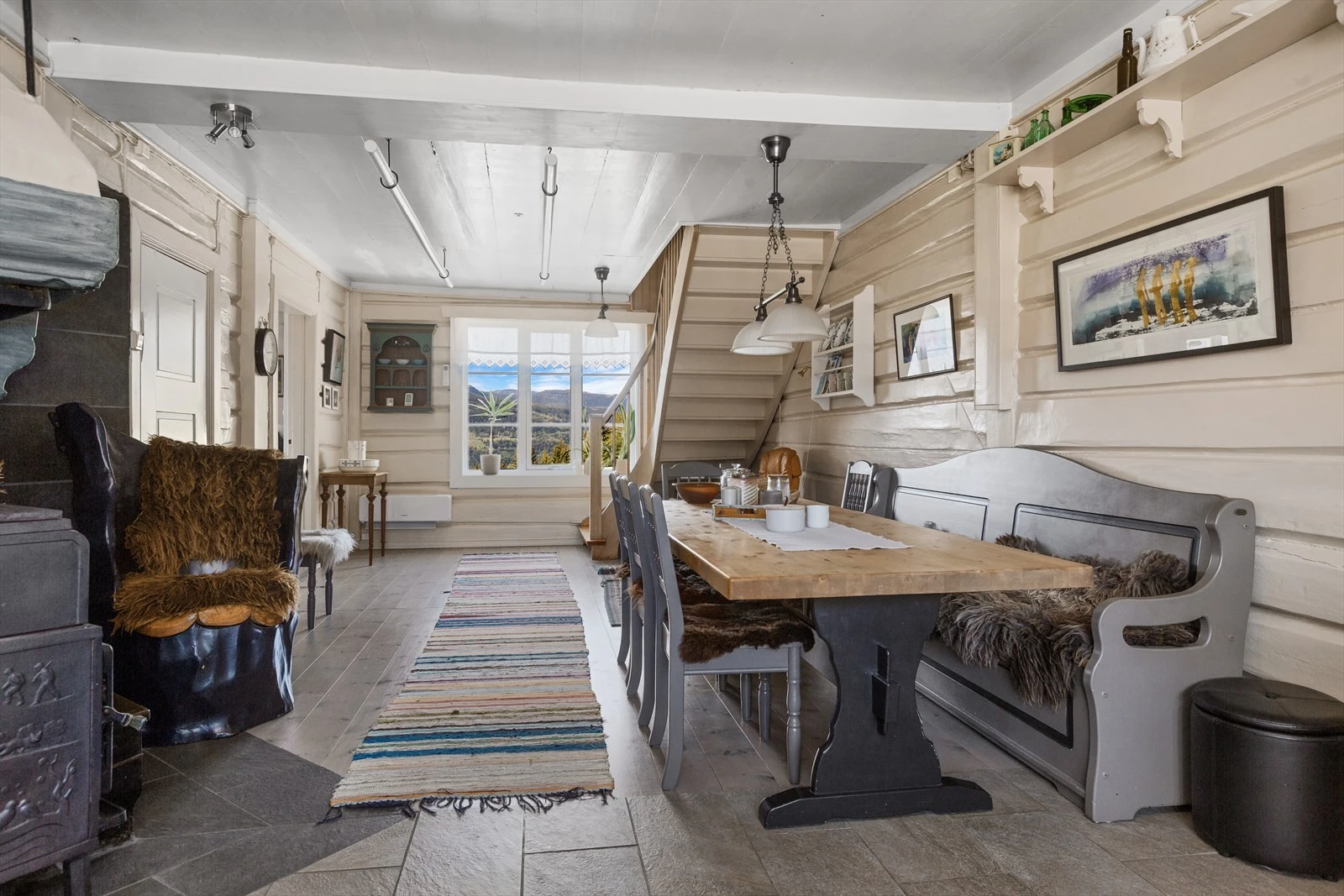 Hovedbygningen på gården ble reist midt på 1800 tallet. Den er stor og innholdsrik og har god plass til både storfamilien og til å kunne samle venner i hyggelige lag. Kjøkken- og allrommet i første etasje er boligens kanskje viktigste rom med en stor grue, elegant innredning og påtenkte soner for bespisning og hvile. Etasjen har også to store stuer i form av en spisestue og en storstue.