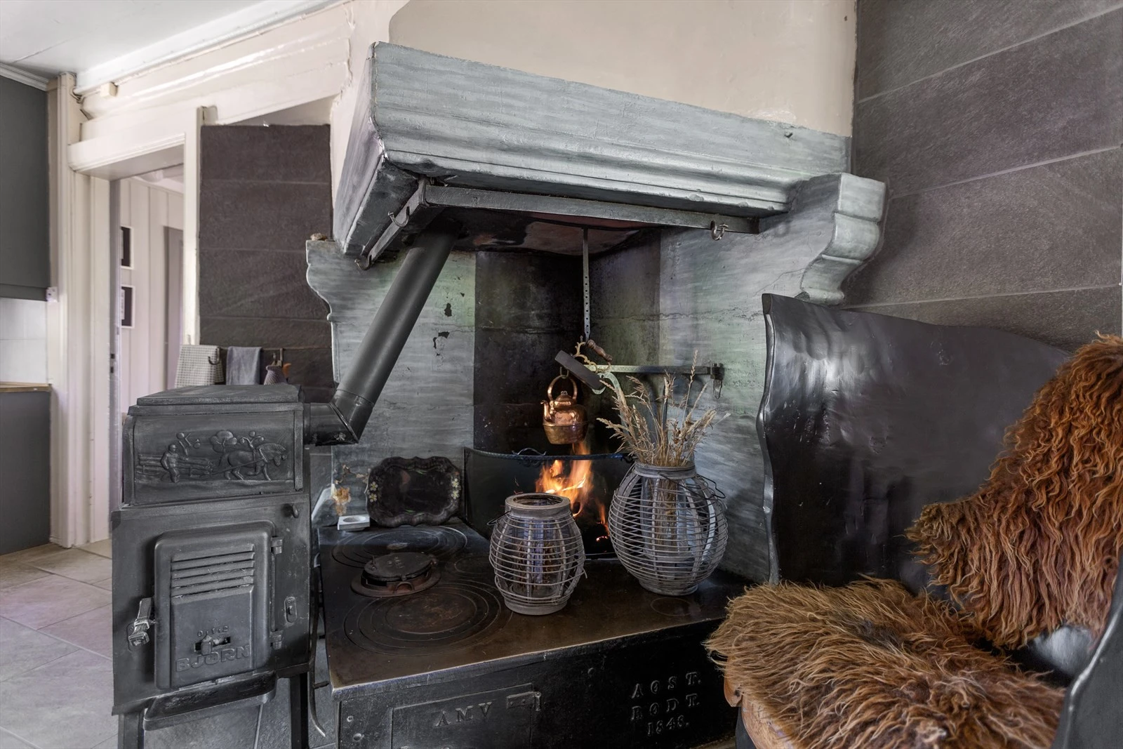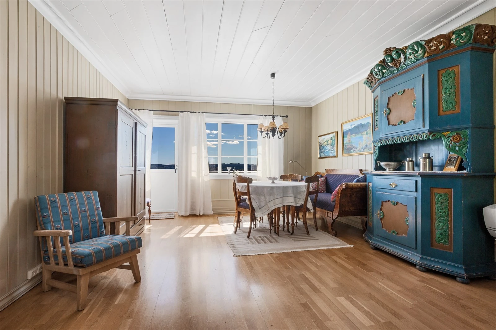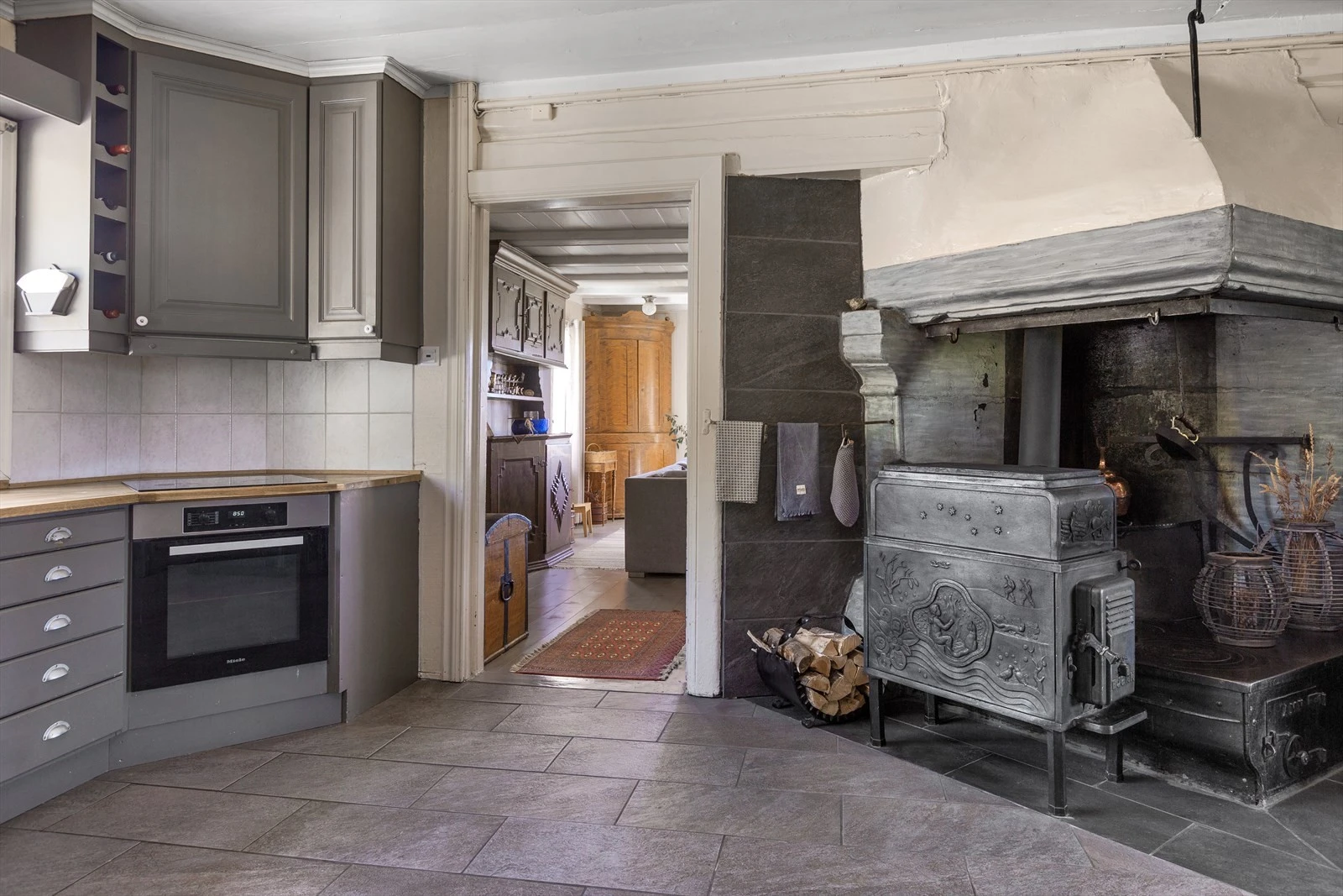 Hovedbygningen på gården ble reist midt på 1800 tallet. Den er stor og innholdsrik og har god plass til både storfamilien og til å kunne samle venner i hyggelige lag. Kjøkken- og allrommet i første etasje er boligens kanskje viktigste rom med en stor grue, elegant innredning og påtenkte soner for bespisning og hvile. Etasjen har også to store stuer i form av en spisestue og en storstue.