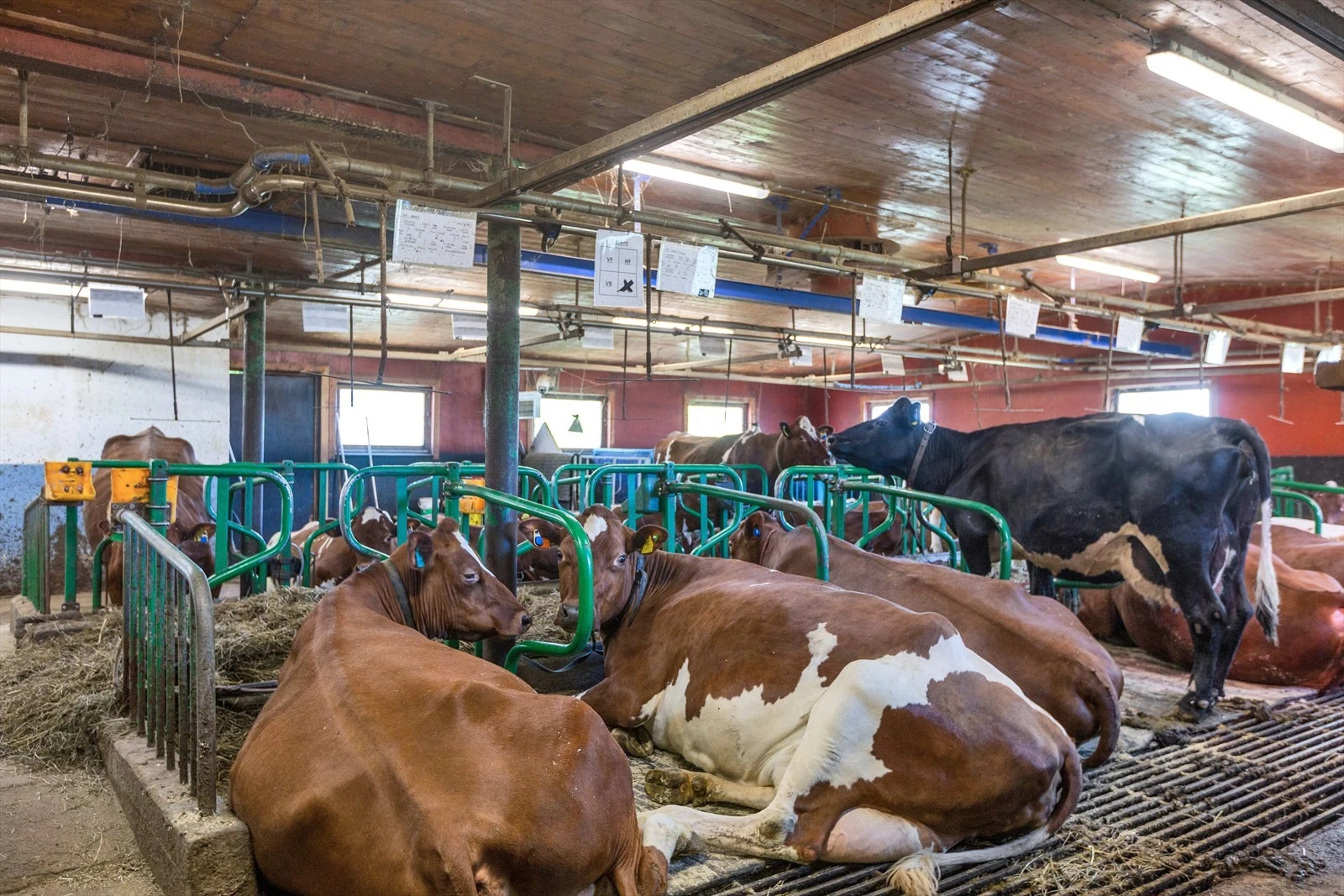 Fjøset er modernisert med gjødselhåndtering, melkeanlegg og automatisk foringsanlegg for kraftfôr.