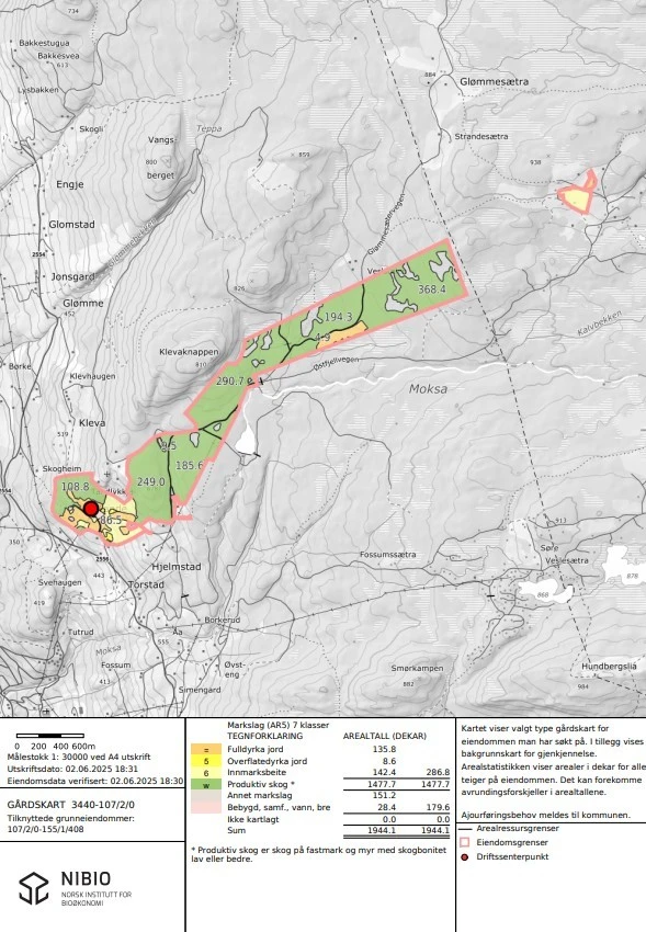 1944,1 daa. | 135,8 daa. fulldyrka | 1477,7 daa. produktiv skog | Melkekvote på 110 tonn | Sæter