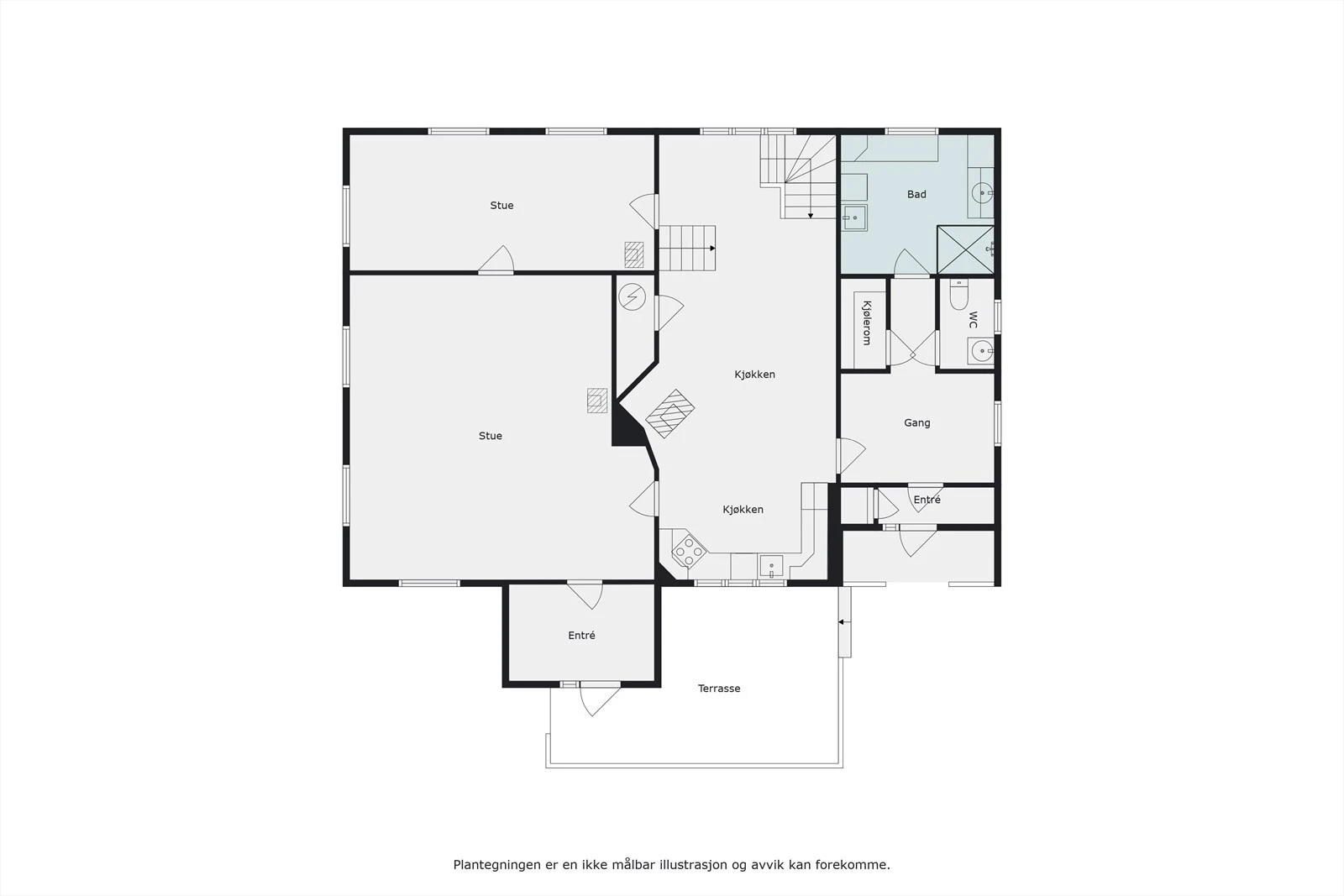 1. etasje (138 kvm): Vindfang, 2 ganger, kjøkken, 2 stuer, bad/ vaskerom, toalettrom og kjølerom.