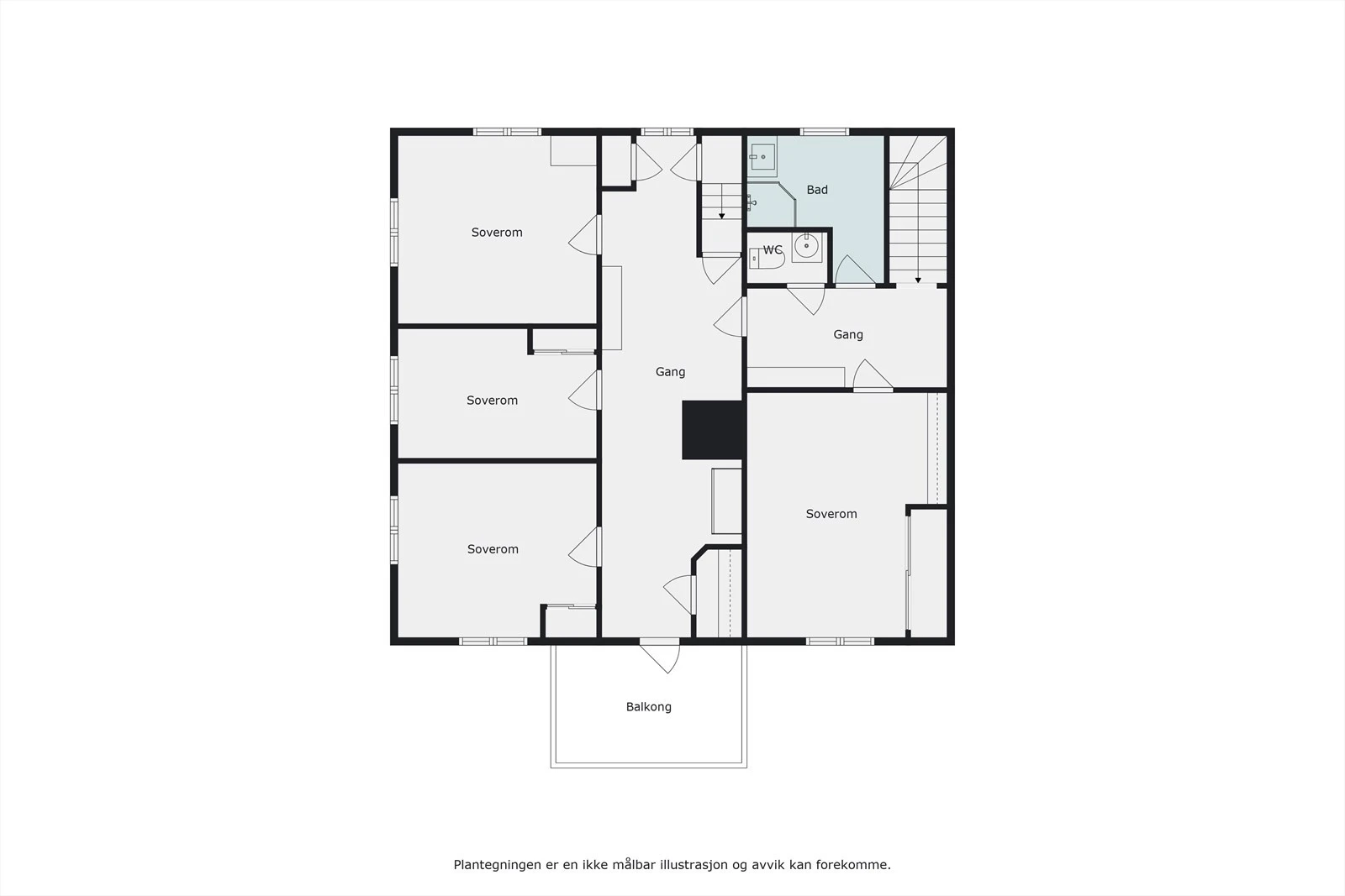 2. etasje (102 kvm.): Toalettrom, 2 ganger, bad og 4 soverom.