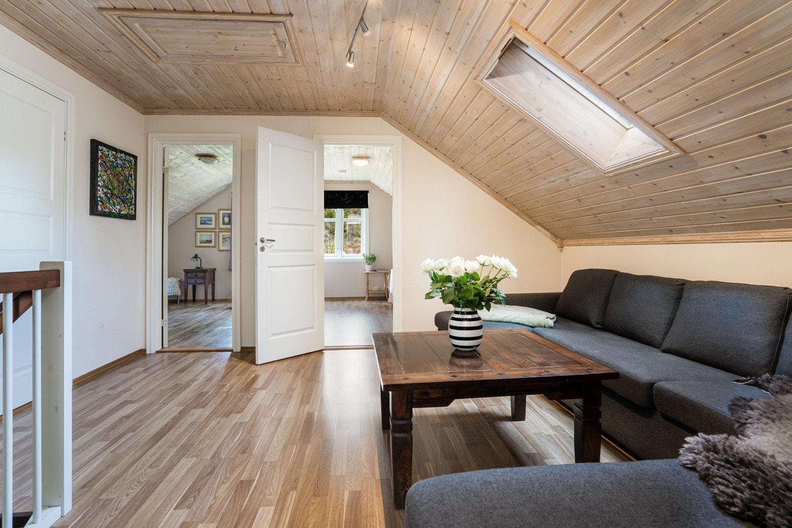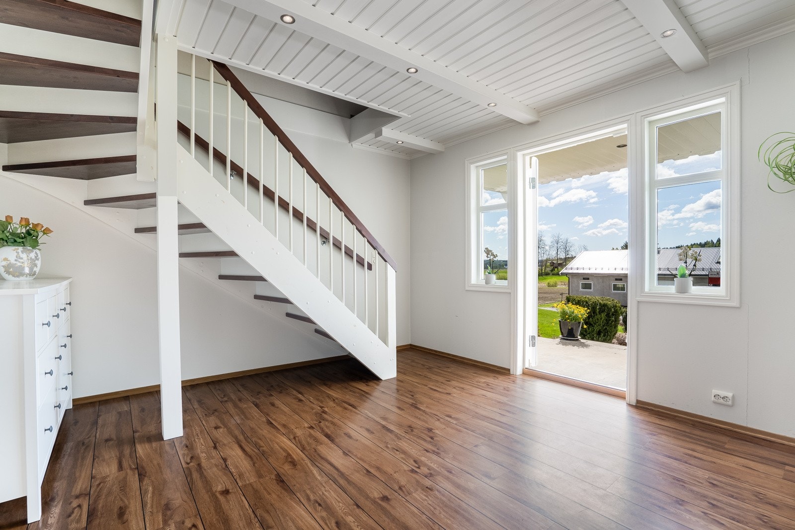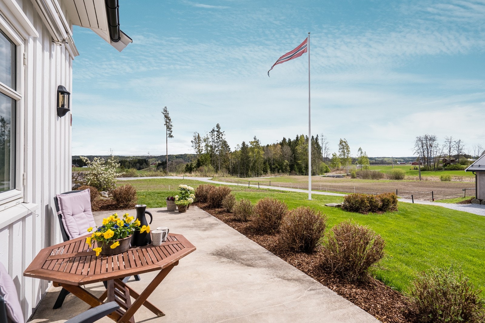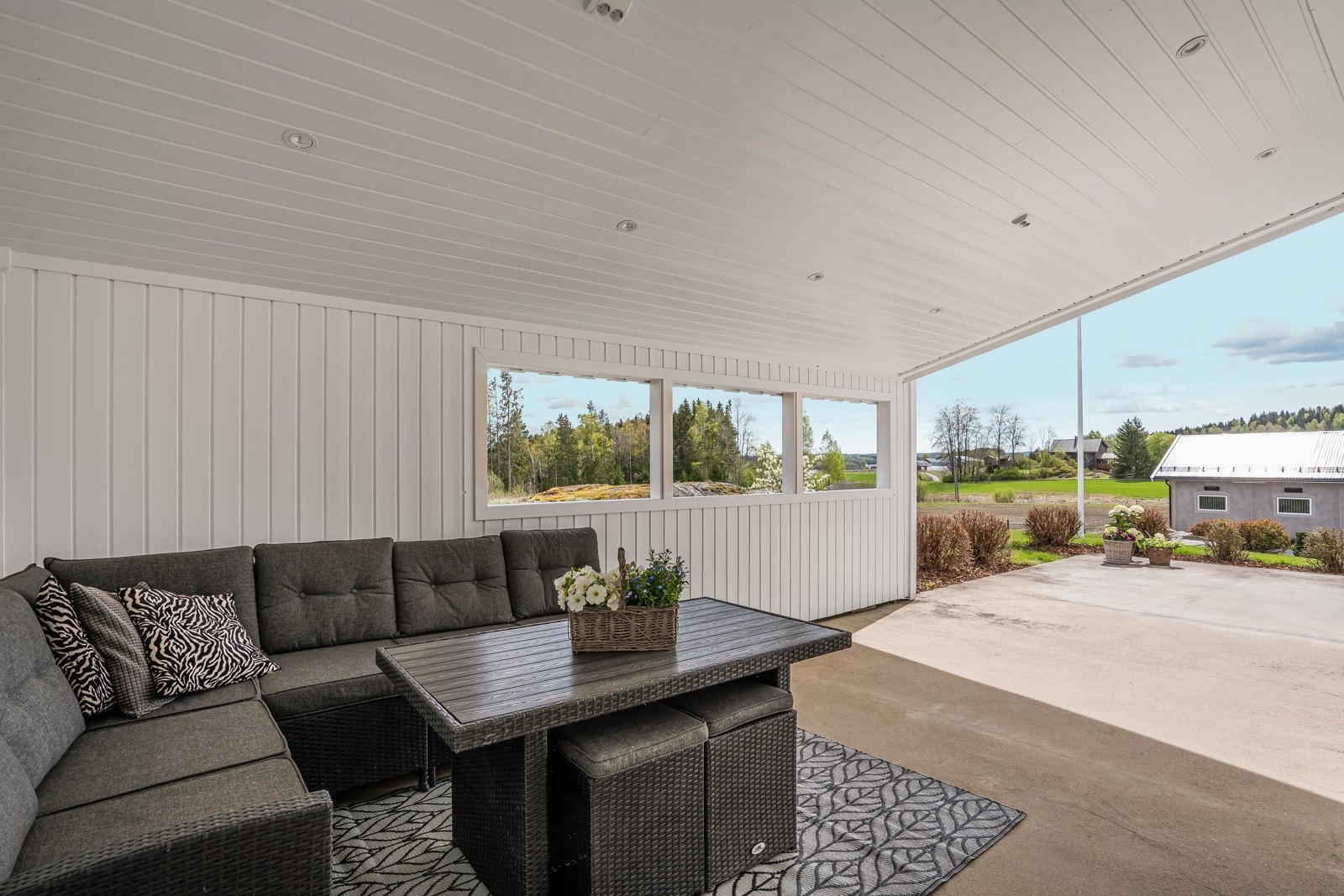 Det er fint å komme hjem hit! Gå opp veien med singel og natursteiner og beplantning på hver side, kjenne duften av blomster eller nyklipt gress og så opp den brede trappen til det fine overbygde inngangspartiet. Du kommer inn i en lys og romslig hall. Stuen ligger rett frem med tørrsteinsmur og peisovn og direkte utgang til overbygd terrasse med hvitmalte panelvegger nord og på østveggen er det innfelt vinduer, i himling er det downlights innfelt i hvitmalt panel. Terrassen fungerer som en  forlengelse av stuen på sommerstid og de fleste måltider kan nytes her ute. Det store kjøkkenet ligger  til venstre i hall med Huseby kjøkkeninnredning i heltre profilerte eikefronter med skap som går til tak. Benkeplate i laminat med beslag, over skylle- og oppvaskkum er det vindu med utsikt til skogen. Opplegg for oppvaskmaskin, kjøleskap og komfyr med ventilator over, godt med skap og benkplass. Hyggelig spiseplass med vindu og oversikt over tunet. Fra hall er det også inngang til stort delikat og flislagt bad med hvit baderomsinnredning med nedsenket servant i benkeskap og speil med lysarmatur og skap på hver side på oversiden, til høyre for innredning er enda et høyskap for oppbevaring. Toalett og dusjkabinett og inngang til vaskerom, praktisk å gå rett dit med skitne heste- og arbeidsklær. Vaskerom er utstyrt med skylle kum, arbeidsbenk og opplegg for vaskemaskin og tørketrommel, over arbeidsbenk er det oppheng for klær eller du kan gå direkte ut i hagen og henge opp klærne der. Den fine klassiske trappen med hvitmalt rekkverk og gelender til 2. etasje ligger til høyre i hallen. Her kommer du rett opp i TV-loftstuen. Det er 3 lyse og trivelige soverom hvorav hoved soverom har walk in closett. Stort bad med WC og servant med speil i overkant.