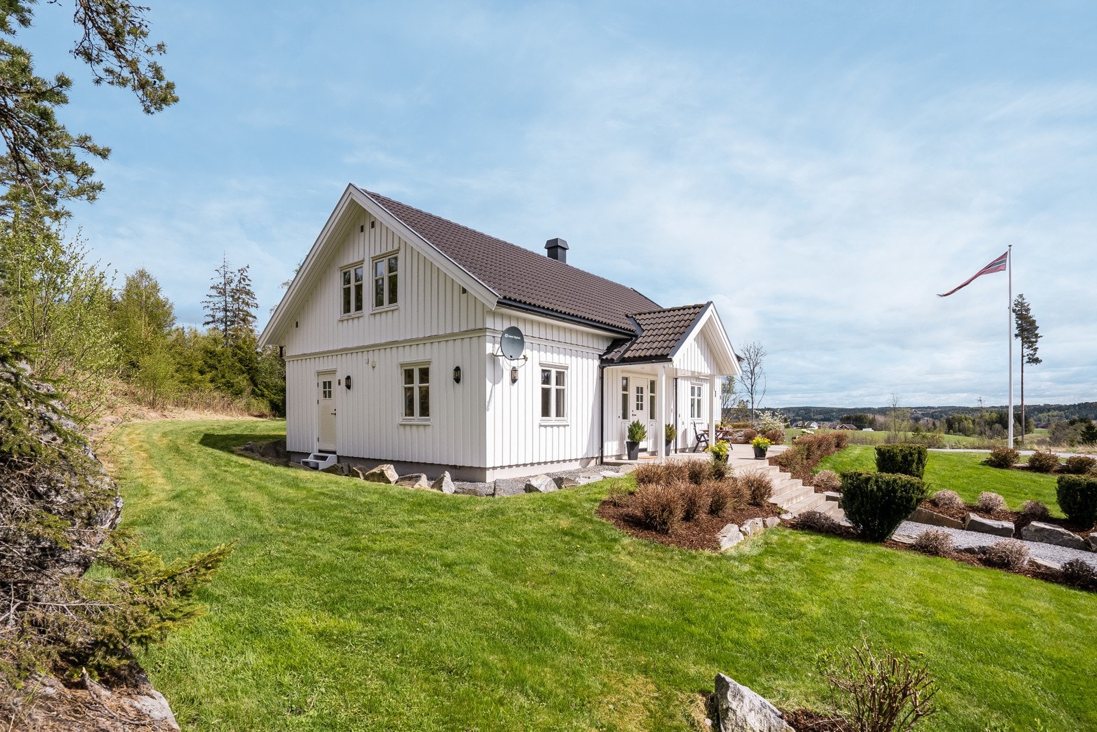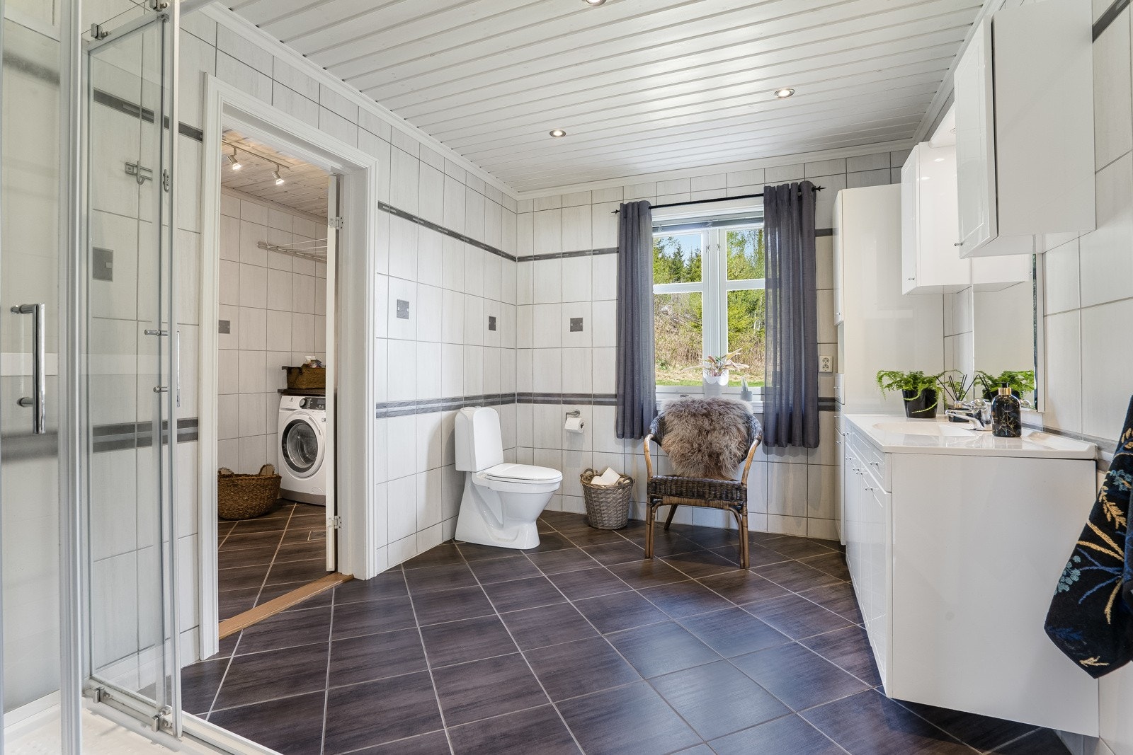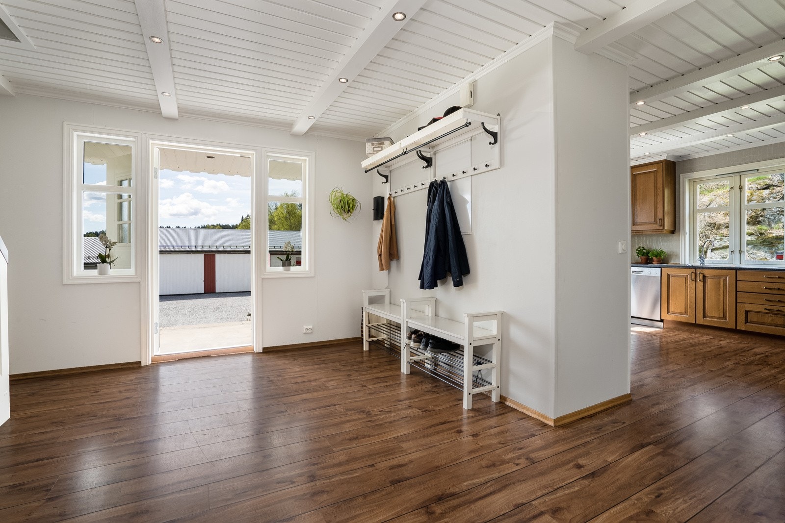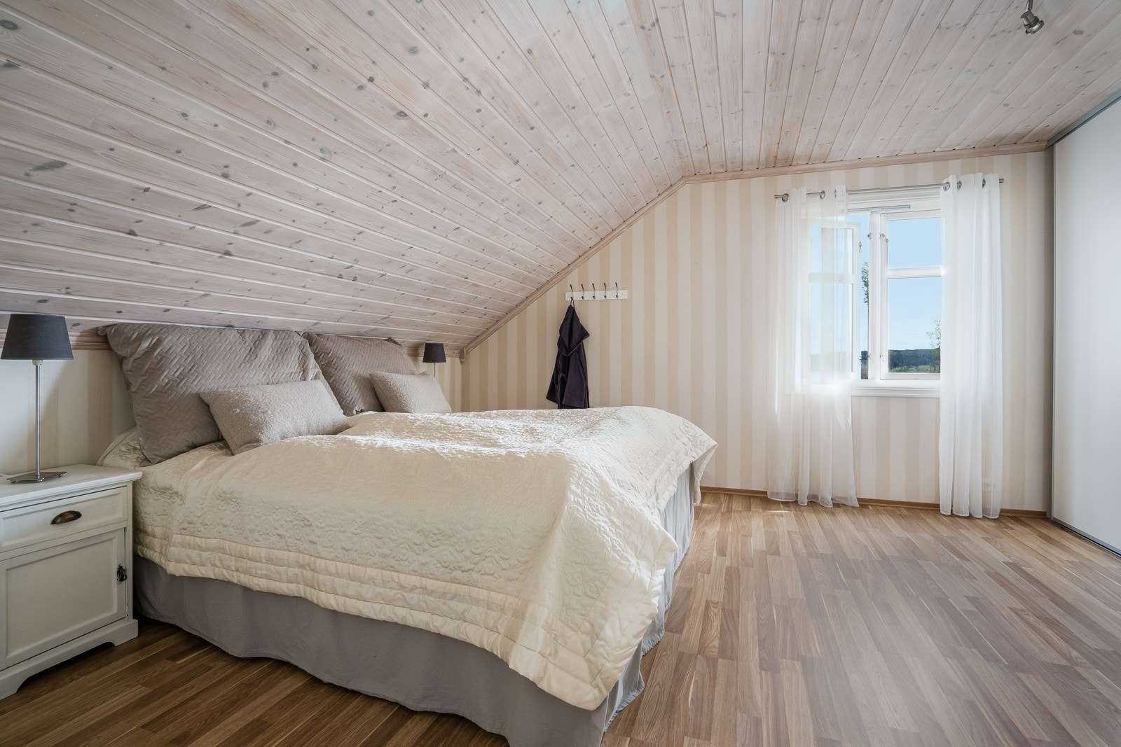 Det er fint å komme hjem hit! Gå opp veien med singel og natursteiner og beplantning på hver side, kjenne duften av blomster eller nyklipt gress og så opp den brede trappen til det fine overbygde inngangspartiet. Du kommer inn i en lys og romslig hall. Stuen ligger rett frem med tørrsteinsmur og peisovn og direkte utgang til overbygd terrasse med hvitmalte panelvegger nord og på østveggen er det innfelt vinduer, i himling er det downlights innfelt i hvitmalt panel. Terrassen fungerer som en  forlengelse av stuen på sommerstid og de fleste måltider kan nytes her ute. Det store kjøkkenet ligger  til venstre i hall med Huseby kjøkkeninnredning i heltre profilerte eikefronter med skap som går til tak. Benkeplate i laminat med beslag, over skylle- og oppvaskkum er det vindu med utsikt til skogen. Opplegg for oppvaskmaskin, kjøleskap og komfyr med ventilator over, godt med skap og benkplass. Hyggelig spiseplass med vindu og oversikt over tunet. Fra hall er det også inngang til stort delikat og flislagt bad med hvit baderomsinnredning med nedsenket servant i benkeskap og speil med lysarmatur og skap på hver side på oversiden, til høyre for innredning er enda et høyskap for oppbevaring. Toalett og dusjkabinett og inngang til vaskerom, praktisk å gå rett dit med skitne heste- og arbeidsklær. Vaskerom er utstyrt med skylle kum, arbeidsbenk og opplegg for vaskemaskin og tørketrommel, over arbeidsbenk er det oppheng for klær eller du kan gå direkte ut i hagen og henge opp klærne der. Den fine klassiske trappen med hvitmalt rekkverk og gelender til 2. etasje ligger til høyre i hallen. Her kommer du rett opp i TV-loftstuen. Det er 3 lyse og trivelige soverom hvorav hoved soverom har walk in closett. Stort bad med WC og servant med speil i overkant.