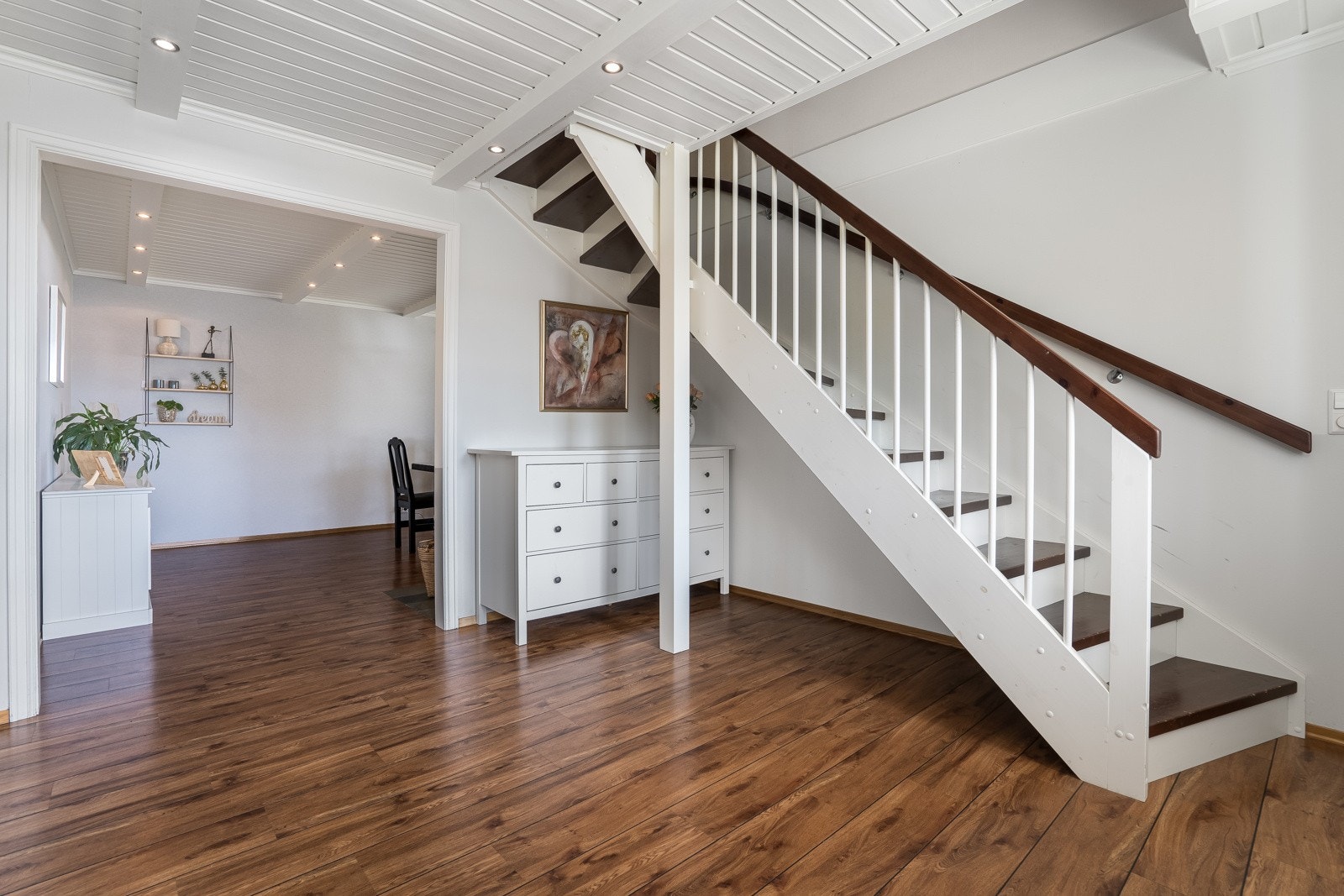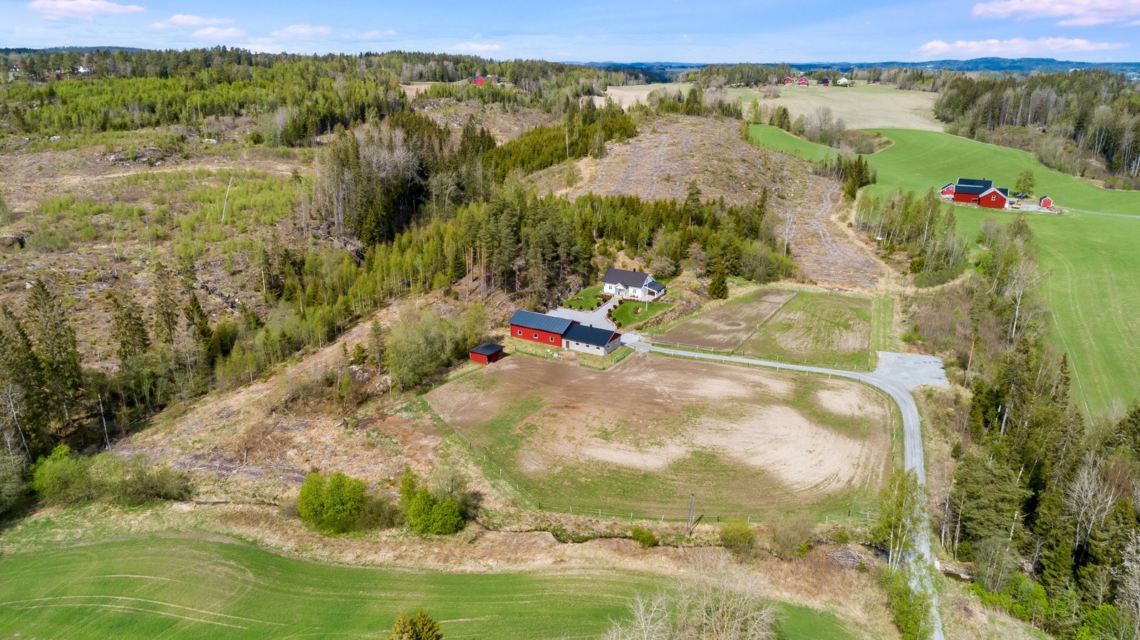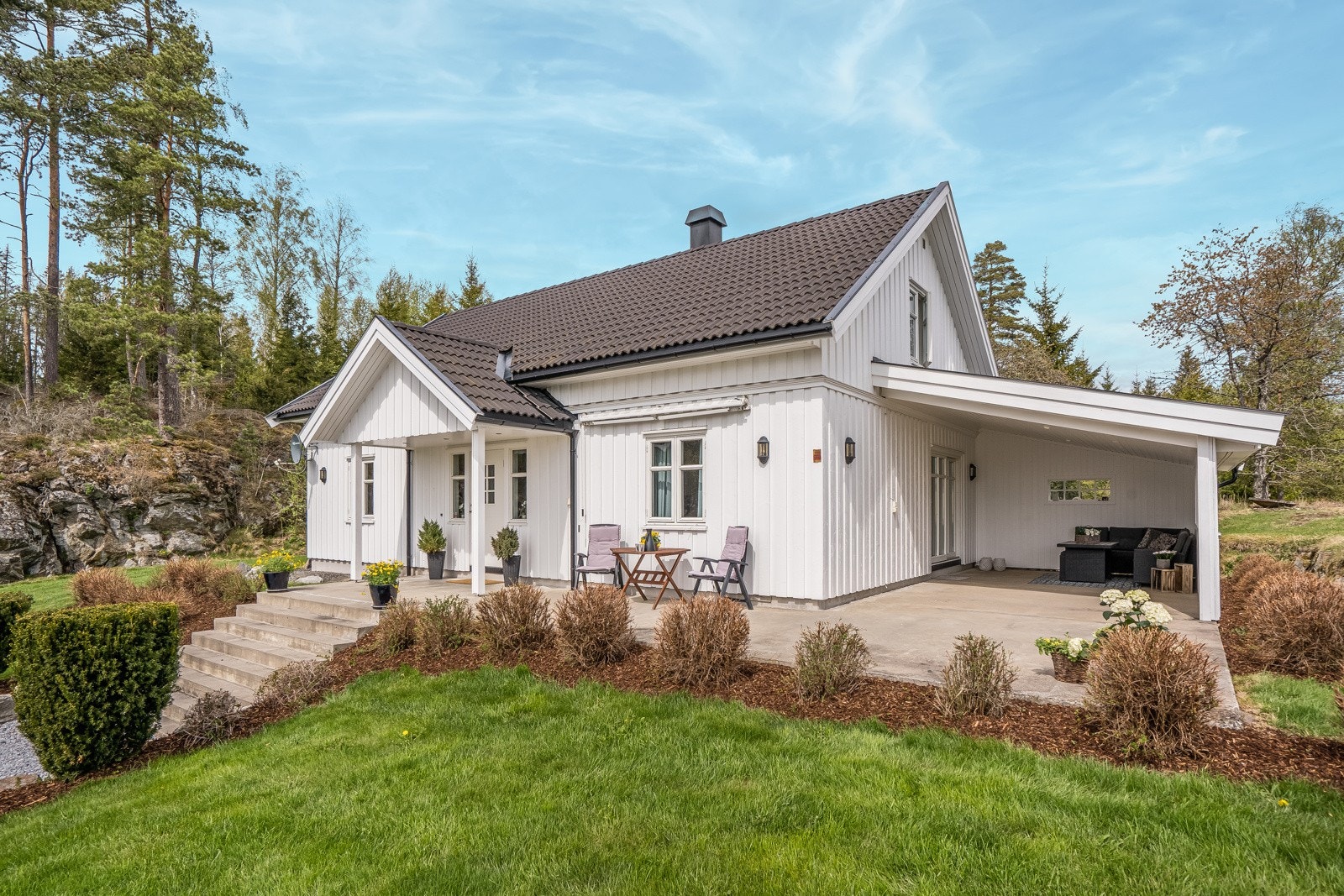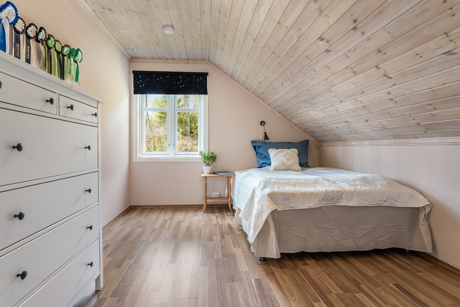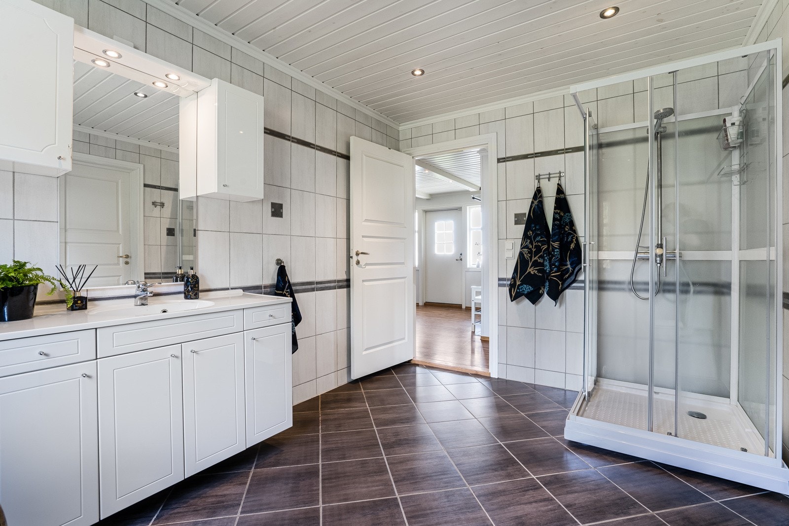 Det er fint å komme hjem hit! Gå opp veien med singel og natursteiner og beplantning på hver side, kjenne duften av blomster eller nyklipt gress og så opp den brede trappen til det fine overbygde inngangspartiet. Du kommer inn i en lys og romslig hall. Stuen ligger rett frem med tørrsteinsmur og peisovn og direkte utgang til overbygd terrasse med hvitmalte panelvegger nord og på østveggen er det innfelt vinduer, i himling er det downlights innfelt i hvitmalt panel. Terrassen fungerer som en  forlengelse av stuen på sommerstid og de fleste måltider kan nytes her ute. Det store kjøkkenet ligger  til venstre i hall med Huseby kjøkkeninnredning i heltre profilerte eikefronter med skap som går til tak. Benkeplate i laminat med beslag, over skylle- og oppvaskkum er det vindu med utsikt til skogen. Opplegg for oppvaskmaskin, kjøleskap og komfyr med ventilator over, godt med skap og benkplass. Hyggelig spiseplass med vindu og oversikt over tunet. Fra hall er det også inngang til stort delikat og flislagt bad med hvit baderomsinnredning med nedsenket servant i benkeskap og speil med lysarmatur og skap på hver side på oversiden, til høyre for innredning er enda et høyskap for oppbevaring. Toalett og dusjkabinett og inngang til vaskerom, praktisk å gå rett dit med skitne heste- og arbeidsklær. Vaskerom er utstyrt med skylle kum, arbeidsbenk og opplegg for vaskemaskin og tørketrommel, over arbeidsbenk er det oppheng for klær eller du kan gå direkte ut i hagen og henge opp klærne der. Den fine klassiske trappen med hvitmalt rekkverk og gelender til 2. etasje ligger til høyre i hallen. Her kommer du rett opp i TV-loftstuen. Det er 3 lyse og trivelige soverom hvorav hoved soverom har walk in closett. Stort bad med WC og servant med speil i overkant.