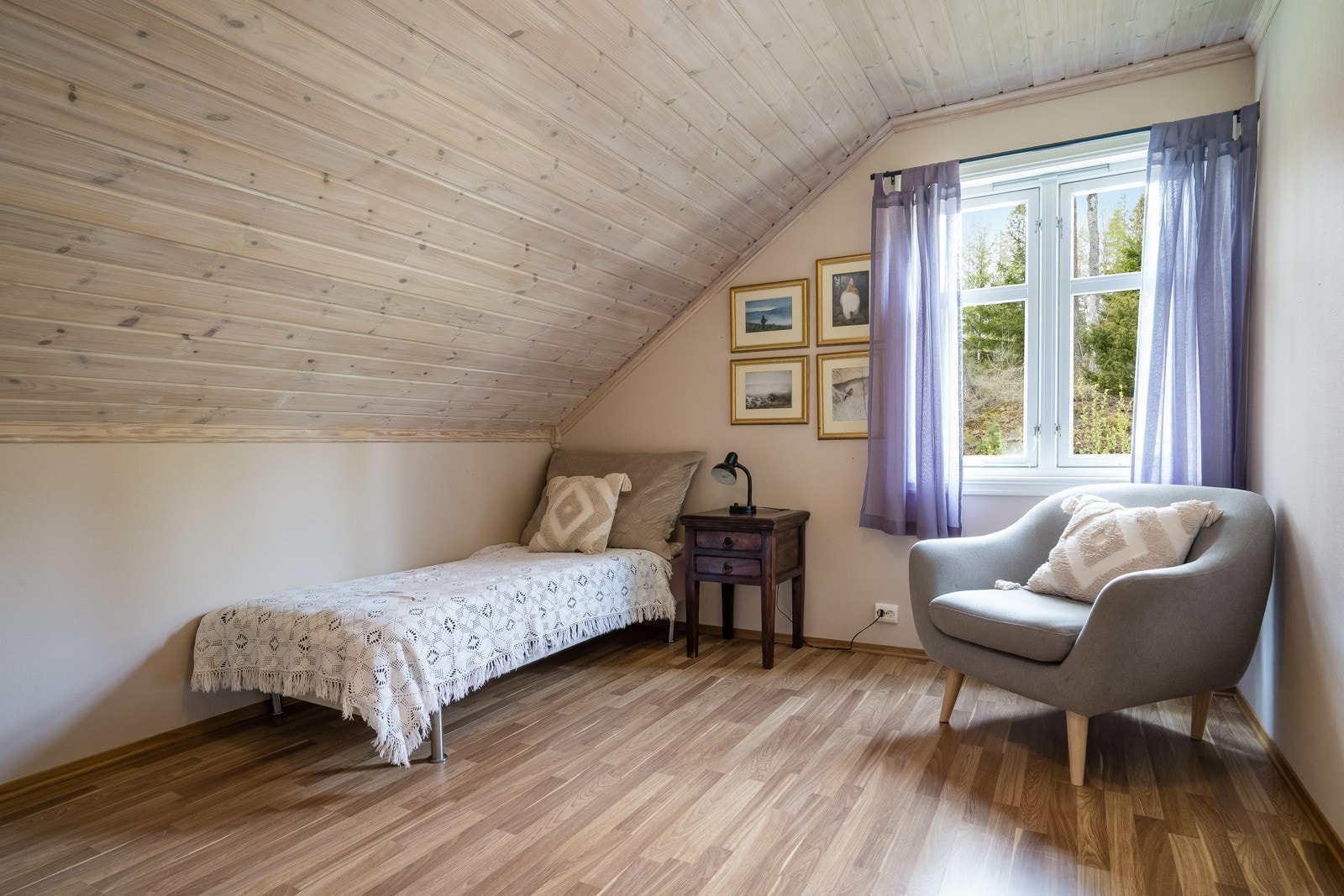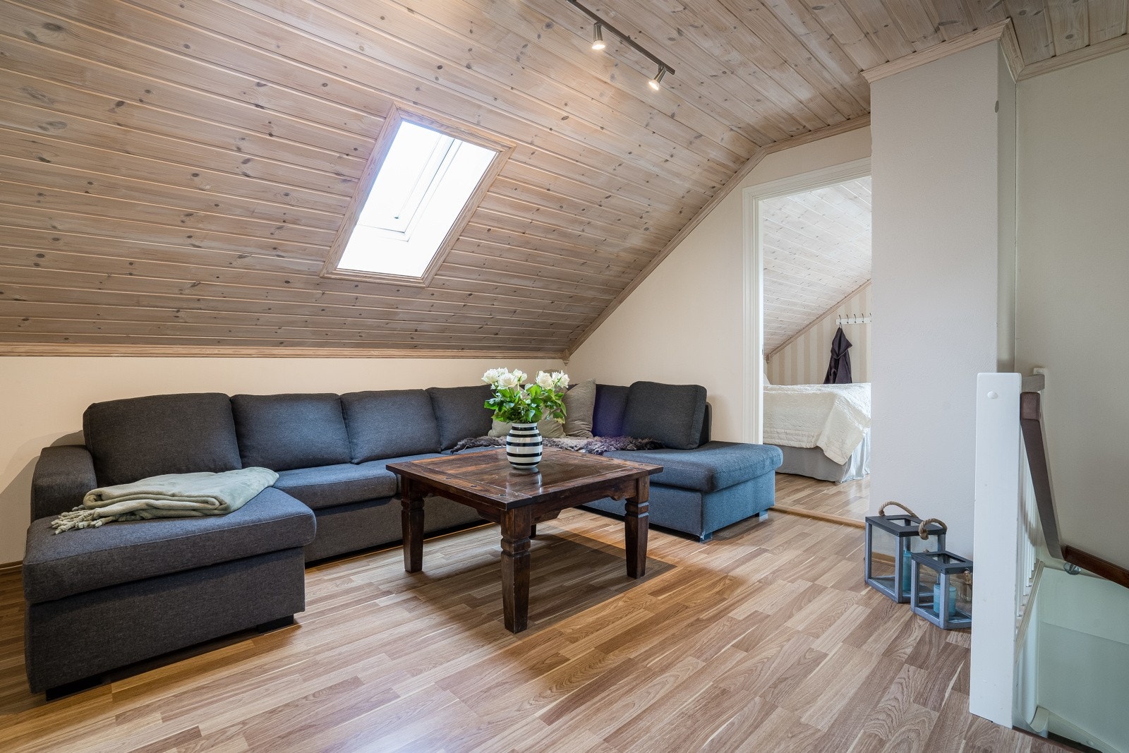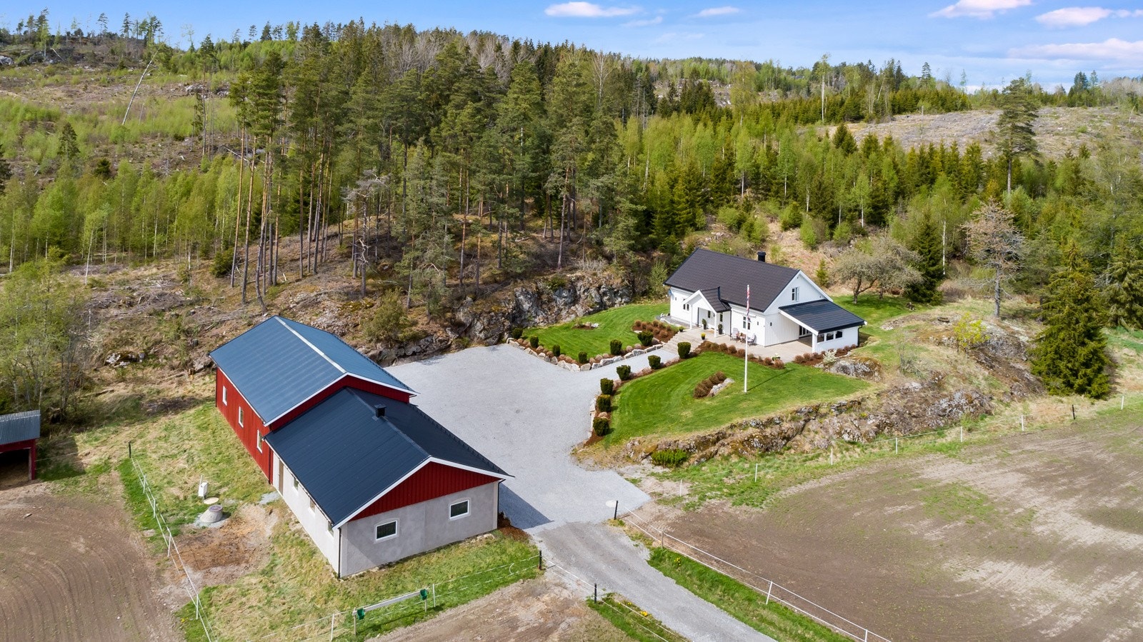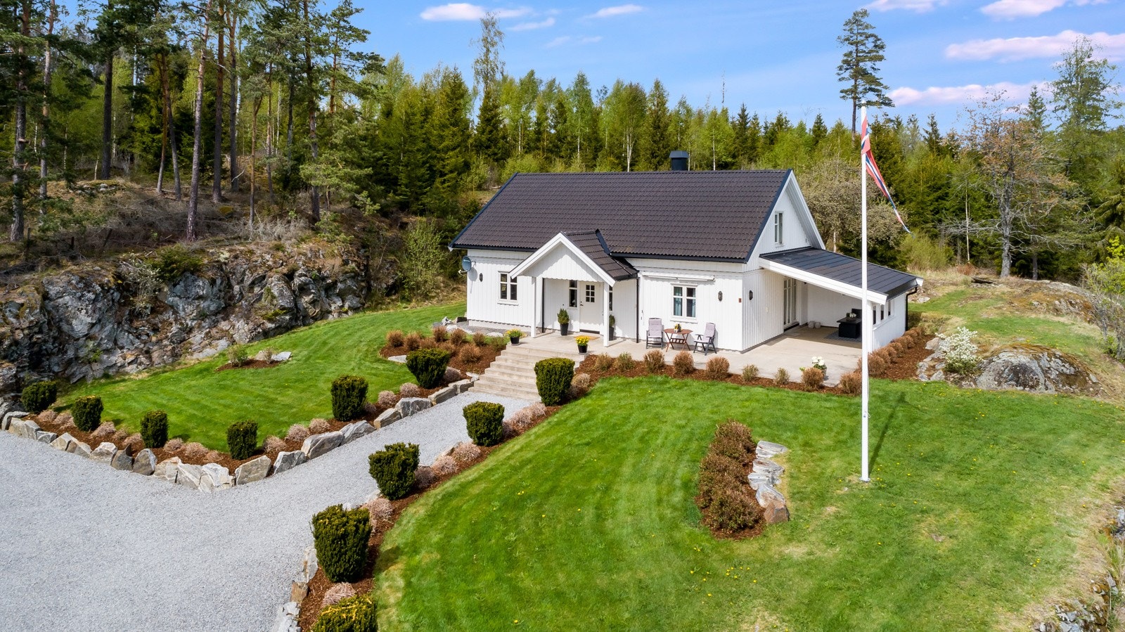 Det er fint å komme hjem hit! Gå opp veien med singel og natursteiner og beplantning på hver side, kjenne duften av blomster eller nyklipt gress og så opp den brede trappen til det fine overbygde inngangspartiet. Du kommer inn i en lys og romslig hall. Stuen ligger rett frem med tørrsteinsmur og peisovn og direkte utgang til overbygd terrasse med hvitmalte panelvegger nord og på østveggen er det innfelt vinduer, i himling er det downlights innfelt i hvitmalt panel. Terrassen fungerer som en  forlengelse av stuen på sommerstid og de fleste måltider kan nytes her ute. Det store kjøkkenet ligger  til venstre i hall med Huseby kjøkkeninnredning i heltre profilerte eikefronter med skap som går til tak. Benkeplate i laminat med beslag, over skylle- og oppvaskkum er det vindu med utsikt til skogen. Opplegg for oppvaskmaskin, kjøleskap og komfyr med ventilator over, godt med skap og benkplass. Hyggelig spiseplass med vindu og oversikt over tunet. Fra hall er det også inngang til stort delikat og flislagt bad med hvit baderomsinnredning med nedsenket servant i benkeskap og speil med lysarmatur og skap på hver side på oversiden, til høyre for innredning er enda et høyskap for oppbevaring. Toalett og dusjkabinett og inngang til vaskerom, praktisk å gå rett dit med skitne heste- og arbeidsklær. Vaskerom er utstyrt med skylle kum, arbeidsbenk og opplegg for vaskemaskin og tørketrommel, over arbeidsbenk er det oppheng for klær eller du kan gå direkte ut i hagen og henge opp klærne der. Den fine klassiske trappen med hvitmalt rekkverk og gelender til 2. etasje ligger til høyre i hallen. Her kommer du rett opp i TV-loftstuen. Det er 3 lyse og trivelige soverom hvorav hoved soverom har walk in closett. Stort bad med WC og servant med speil i overkant.