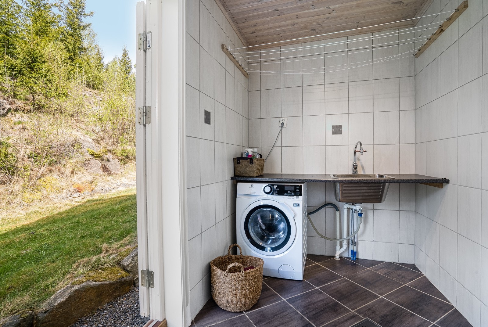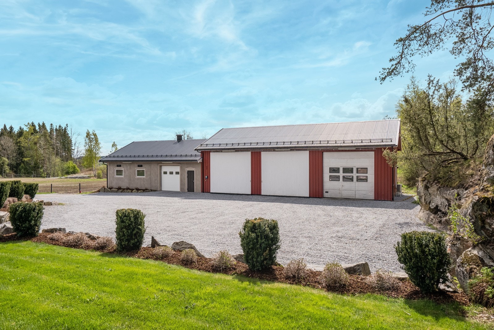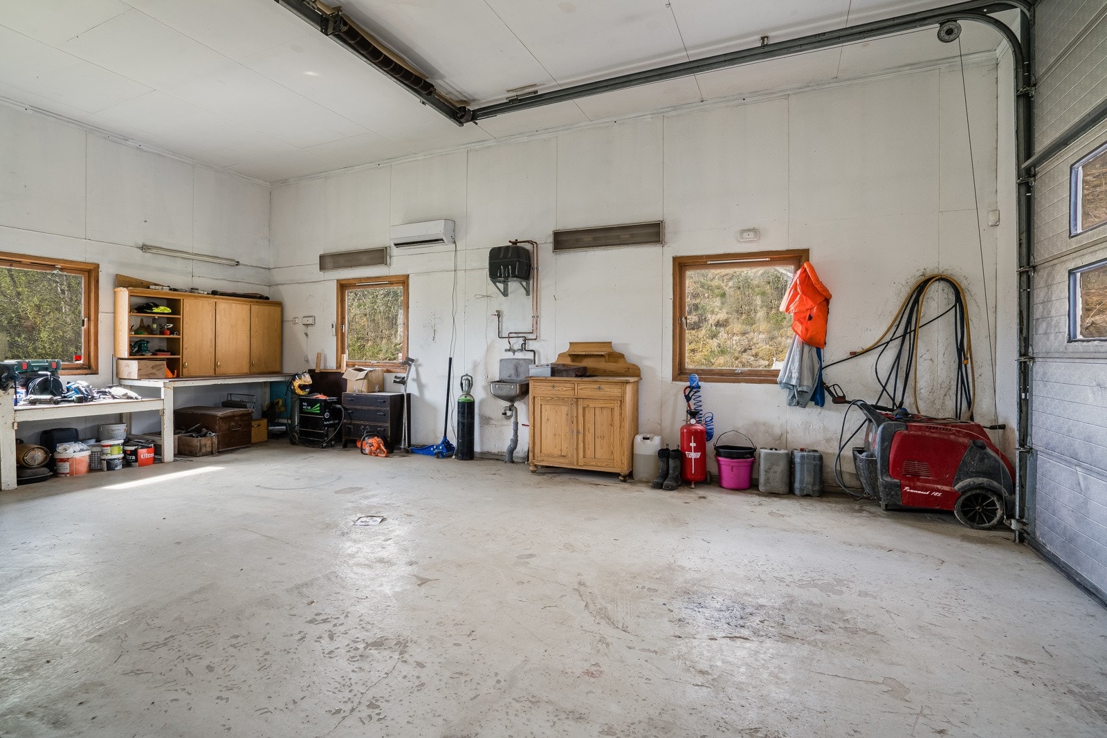 Redskapsrommet et på ca. 86 m² inklusive isolert sælarom. Isolert verksted er på ca. 50 m² og er innvendig kledd med gips/spon plater på vegger og gips i tak.