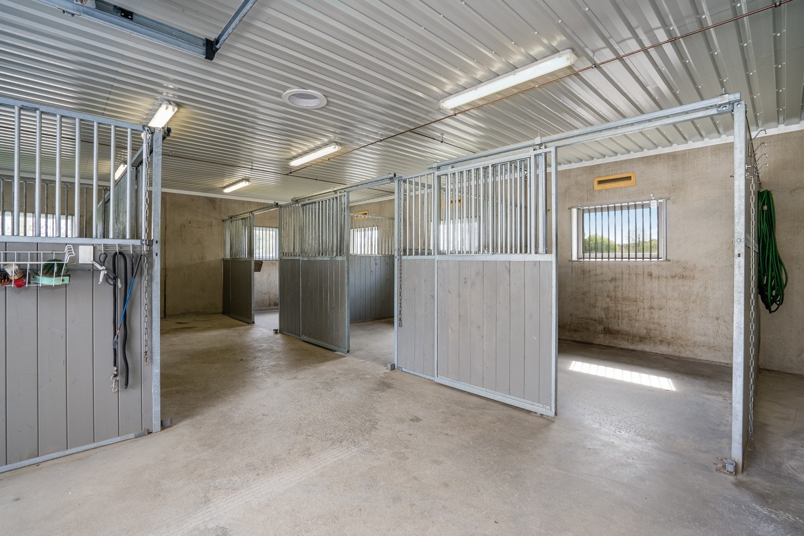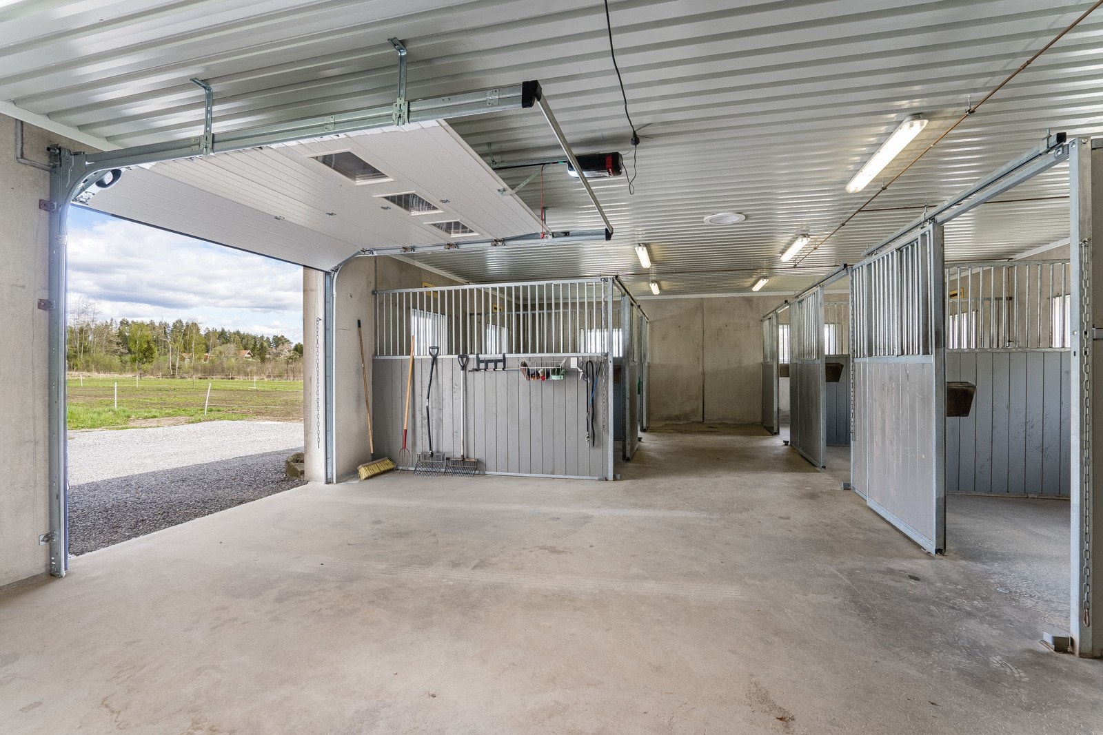 Stallen er ny og moderne med store fine bokser, alle med vindu. Brede stallganger og sluk i gulv for vasking av hestene. I låve ved siden av er det et isolert utstyrsrom. Det er direkte utgang til paddock/innhegning på baksiden av stallen. På nabogården like ved er det ride hall som  leies ut og det er flotte turområder i umiddelbar nærhet.