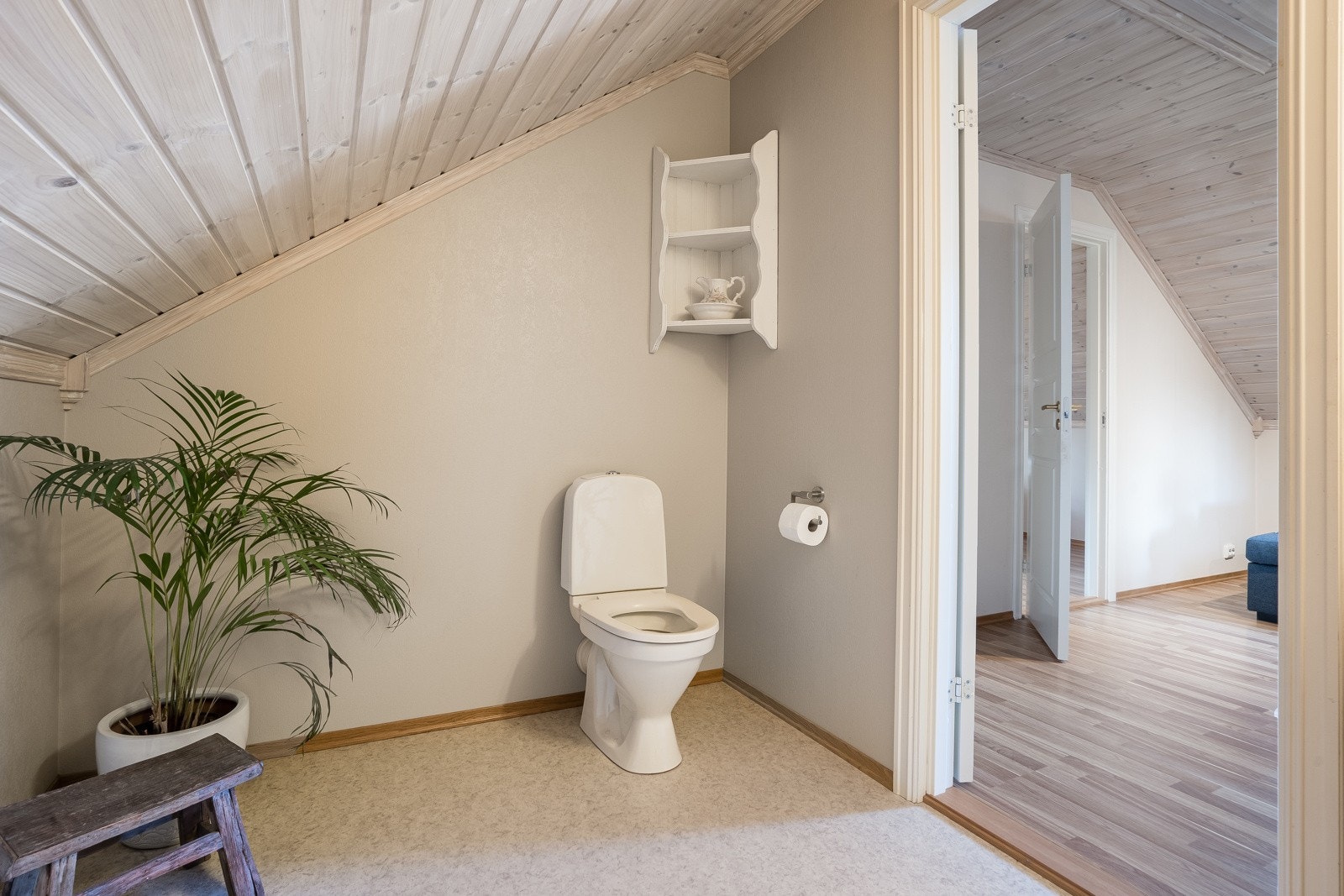 Wc rom i 2.etg. Rommet er innredet med gulvmontert toalett, baderomsinnredning på 55 cm med underskap med heldekkende servant speil med lys over.