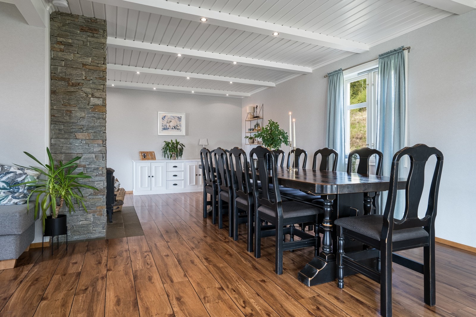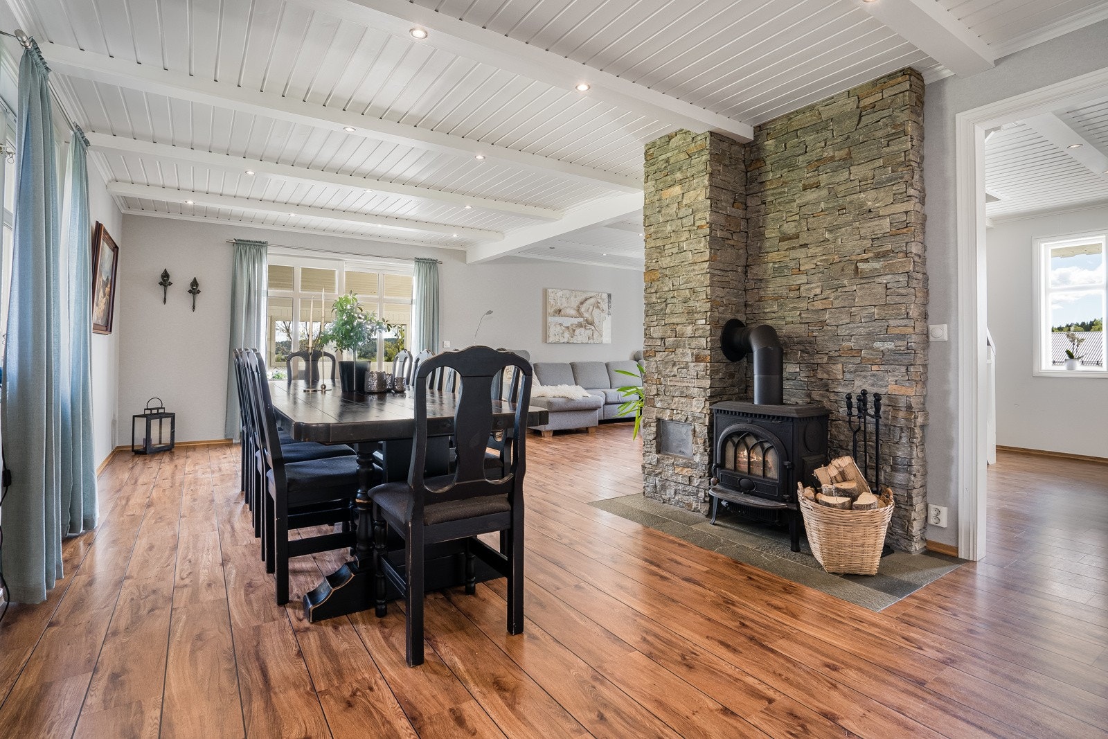 Boligen varmes opp med vannbåren varme i alle gulv 1.etg samt vedfyring.